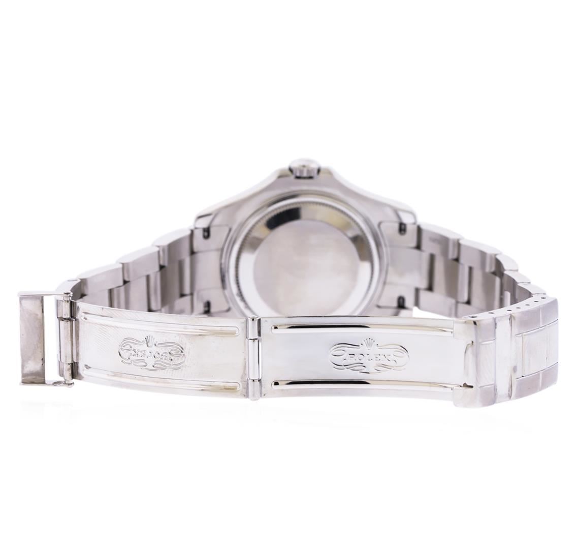 One, hand crafted & machine milled Rolex stainless steel Yacht-Master wristwatch electronically tested, Case: 35mm oyster, Crown: twinlock with logo, set within protective shoulders, Platinum Bezel: bi- directional sixty minute time lapse function, with high relief indices and numerals, Rolex Hallmarked Crystal: synthetic sapphire cyclops lens. Movement: superlative chronometer, Rolex signed Dial: Platinum color, with Blue luminous hands and indices, Circa: 2002, Date Window: 3 o'clock position quick set, Rolex Bracelet: Stainless Steel oyster links, Bright polish and brushed finish, Condition: G-6 Extra Fine. Seven inch length, adjustable. Four removable links. Total Weight of Watch 100.46gm. AIG Appraised at $8,450.00.
