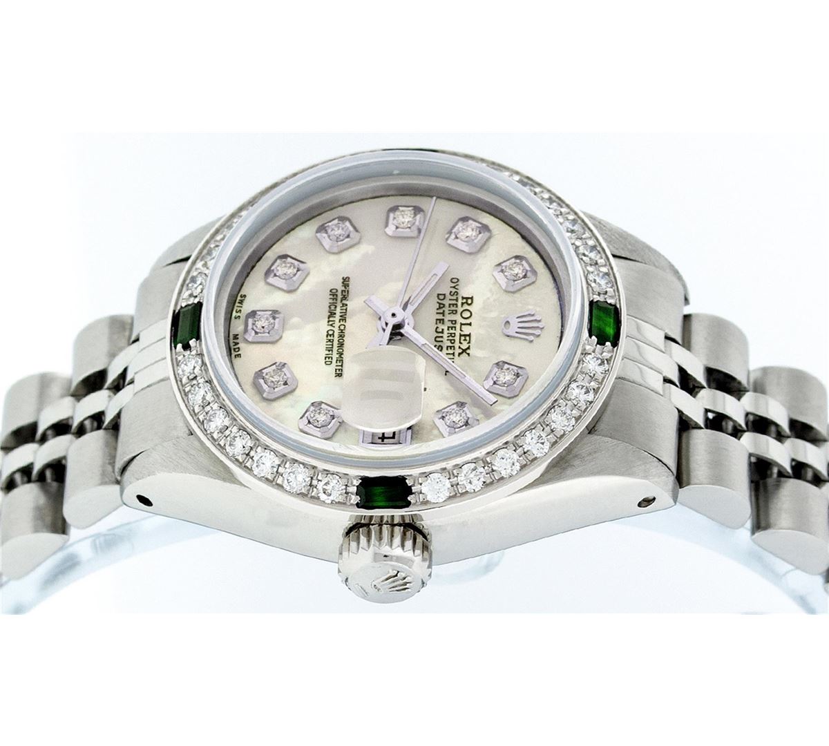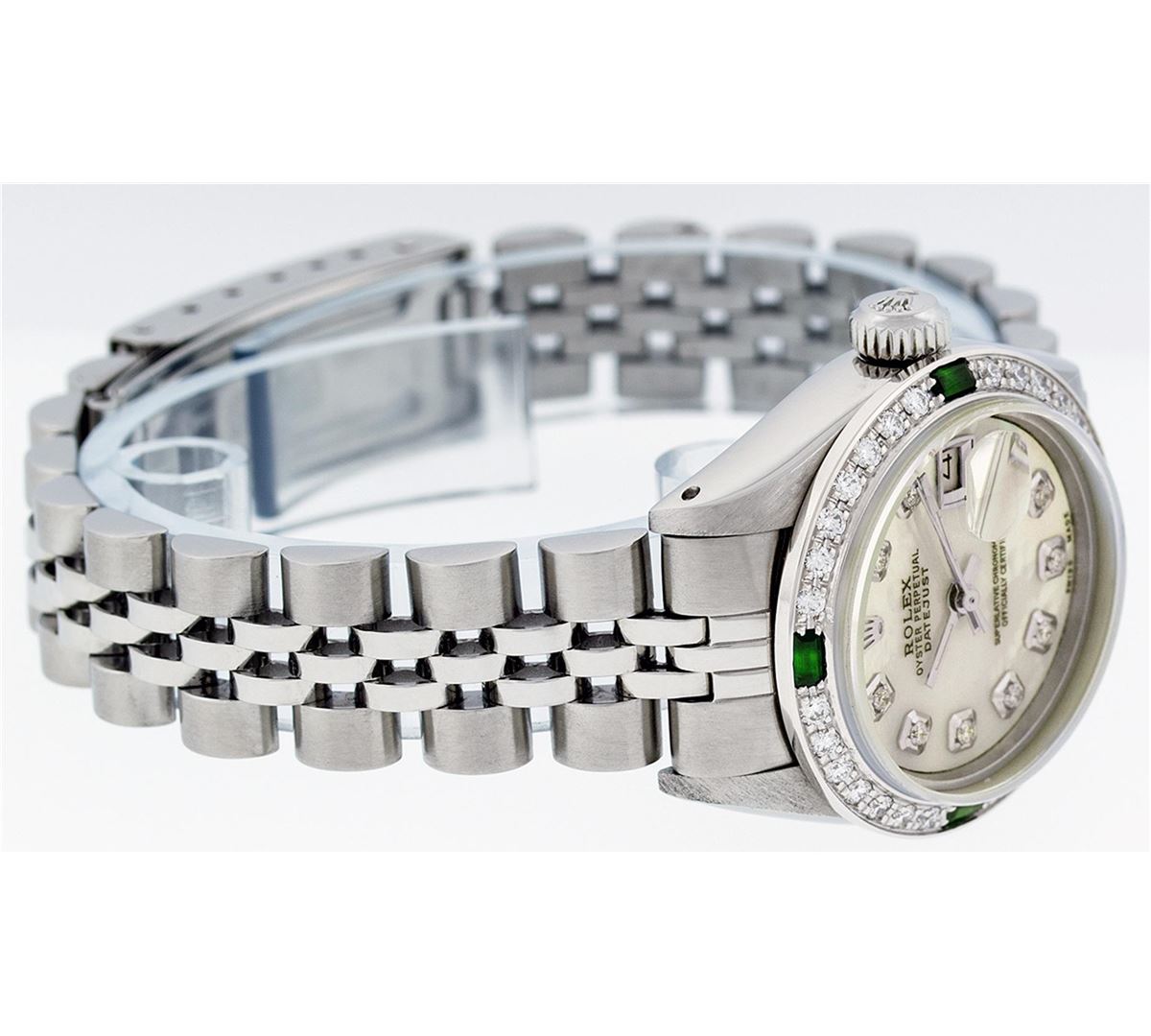 Ladies Rolex Datejust Polished Bright with Satin Finish, Serviced & Electronically Tested, Stainless Steel Case:26mm, Stainless Steel Crown, Custom Bezel: 18K White Gold Emerald Beadset Diamond Bezel, Diamond + Gem Count: 28 Diamonds + 4 Emerald. Total Weight .70 Carat, Clarity: SI-VS, Color: G to H. Custom Crystal: Synthetic Sapphire Cyclops Lens. Movement: Automatic Winding Movement Caliber 2030. Custom Dial: Refinished Yellow MOP With Diamond Hour Markers. Diamond Count: 10 Diamonds, Color: G To H, Clarity: SI-VS. Date Window: 3 O'Clock Position Date Display, Model: Datejust. Condition: G-6 Extra Fine. Bracelet: Stainless Steel Jubilee. Bright Polish & Satin Finish. 6.0 Inch Length, Adjustable. Standard Clasp, With Rolex Logo. Comes with 6 month warranty.