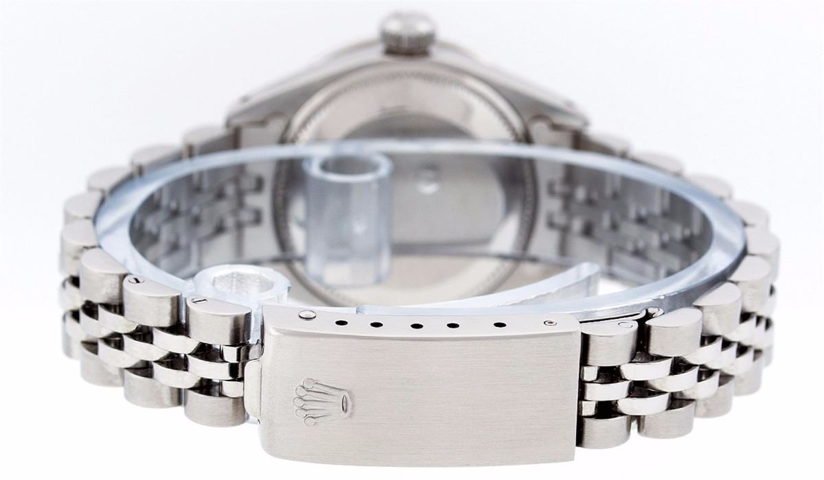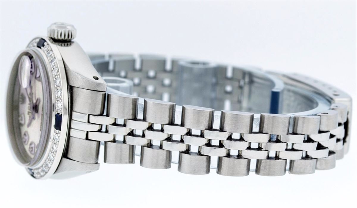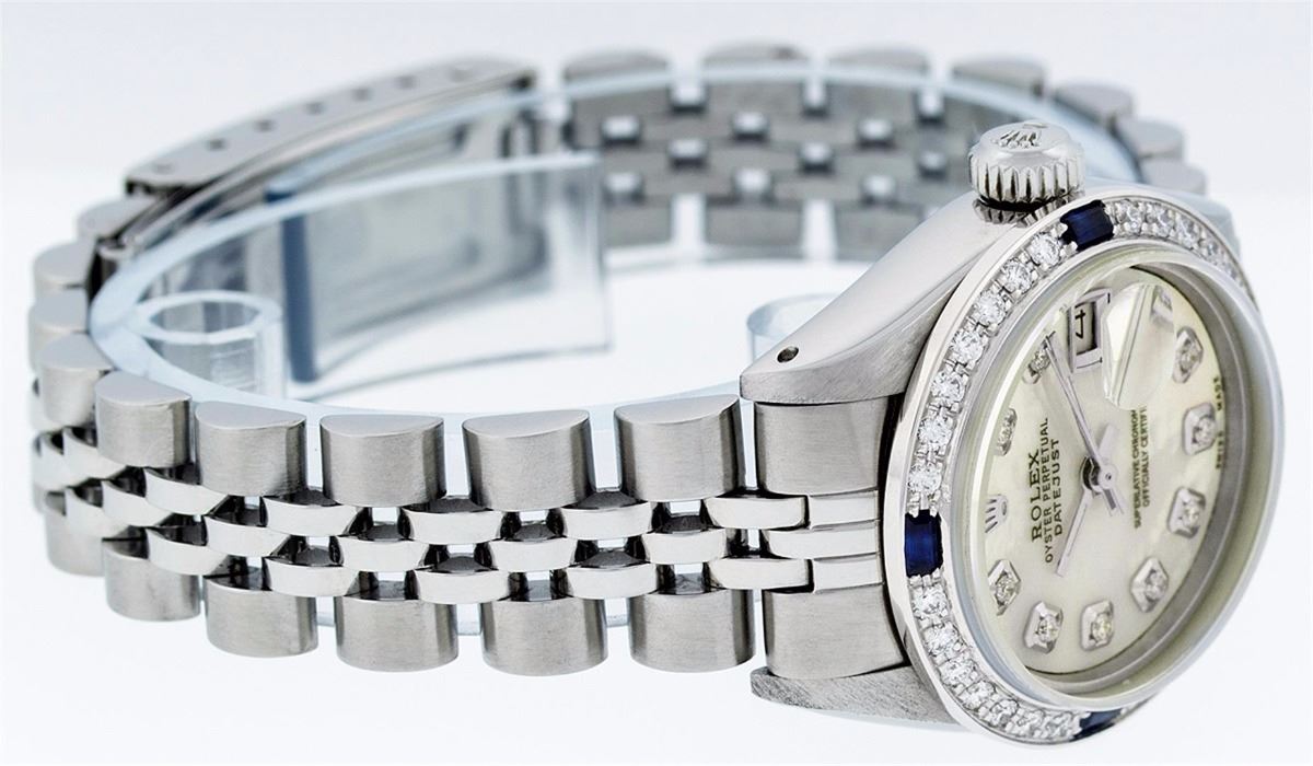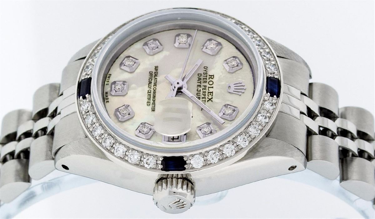 Ladies Rolex Datejust Polished Bright with Satin Finish, Serviced & Electronically Tested, Stainless Steel Case:26mm, Stainless Steel Crown, Custom Bezel: 18K White Gold Sapphire Beadset Diamond Bezel, Diamond + Gem Count: 28 Diamonds + 4 Sapphire. Total Weight .70 Carat, Clarity: SI-VS, Color: G to H. Custom Crystal: Synthetic Sapphire Cyclops Lens. Movement: Automatic Winding Movement Caliber 2030. Custom Dial: Refinished Yellow MOP With Diamond Hour Markers. Diamond Count: 10 Diamonds, Color: G To H, Clarity: SI-VS. Date Window: 3 O'Clock Position Date Display, Model: Datejust. Condition: G-6 Extra Fine. Bracelet: Stainless Steel Jubilee. Bright Polish & Satin Finish. 6.0 Inch Length, Adjustable. Standard Clasp, With Rolex Logo. Comes with 6 month warranty.