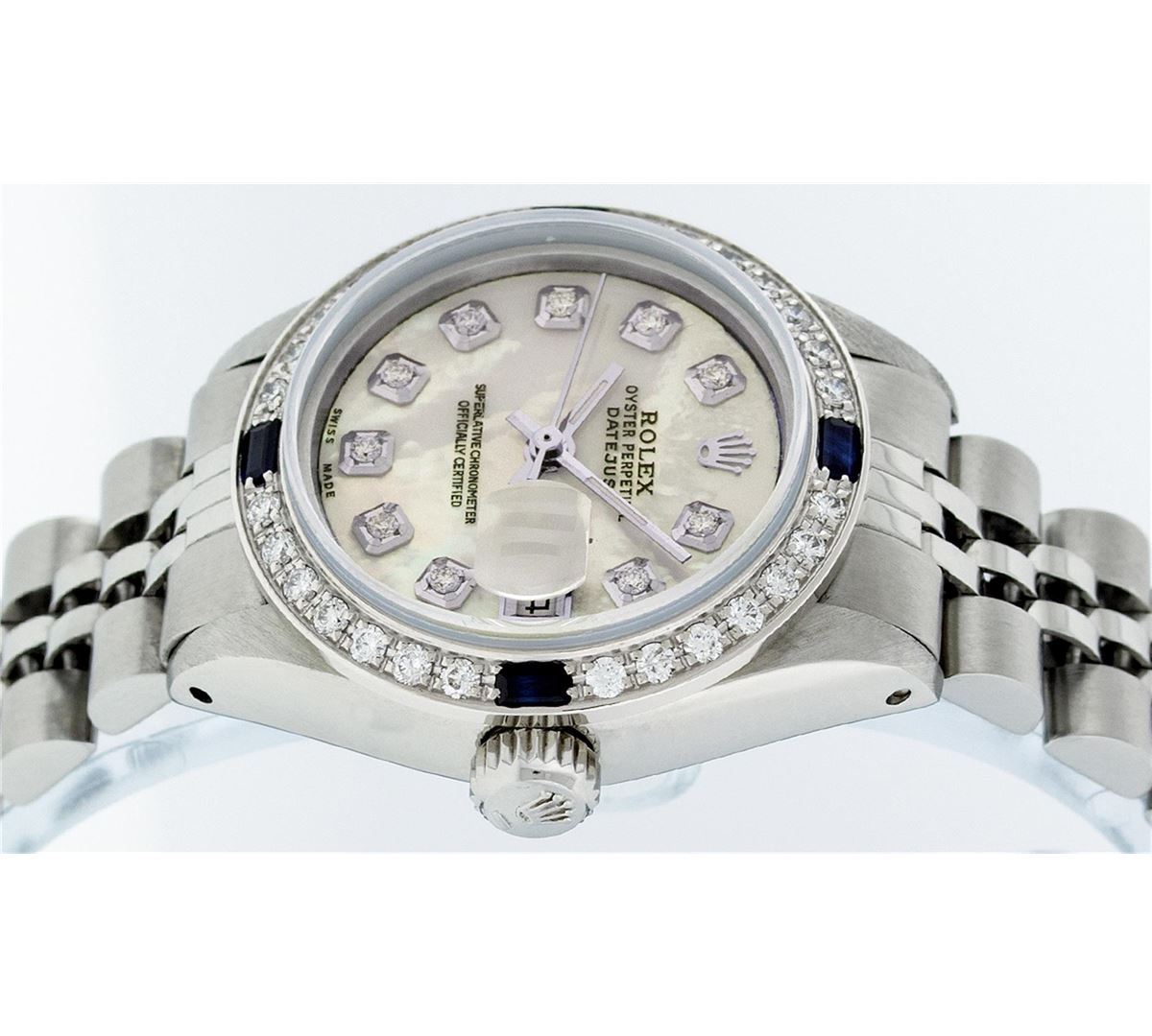 Ladies Rolex Datejust Polished Bright with Satin Finish, Serviced & Electronically Tested, Stainless Steel Case:26mm, Stainless Steel Crown, Custom Bezel: 18K White Gold Sapphire Beadset Diamond Bezel, Diamond + Gem Count: 28 Diamonds + 4 Sapphire. Total Weight .70 Carat, Clarity: SI-VS, Color: G to H. Custom Crystal: Synthetic Sapphire Cyclops Lens. Movement: Automatic Winding Movement Caliber 2030. Custom Dial: Refinished Yellow MOP With Diamond Hour Markers. Diamond Count: 10 Diamonds, Color: G To H, Clarity: SI-VS. Date Window: 3 O'Clock Position Date Display, Model: Datejust. Condition: G-6 Extra Fine. Bracelet: Stainless Steel Jubilee. Bright Polish & Satin Finish. 6.0 Inch Length, Adjustable. Standard Clasp, With Rolex Logo. Comes with 6 month warranty.