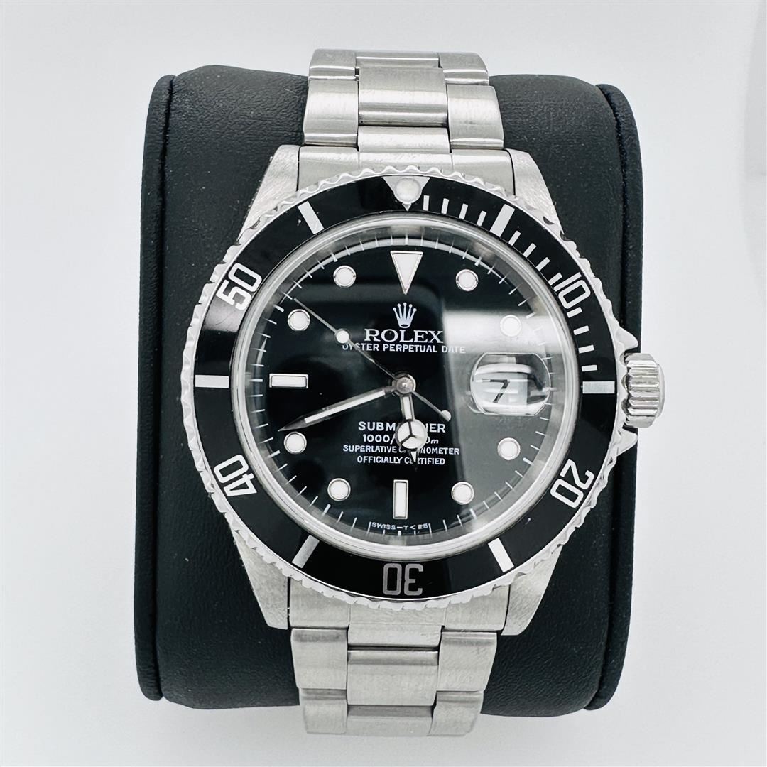 One Rolex Submariner 40mm Black Dial Ceramic Bezel Steel Watch. For auction is a Rolex Submariner Date 16610 caliber 3135 Swiss Only automatic chronometer 40mm. DIAMETER: 40 mm w/out crown, 44 mm w/crown, 48 mm lug to lug LUG WIDTH: 20 mm at the lugs tapering to 16 mm (will take a 20 mm bracelet) HEIGHT: 14 mm POWER-RESERVE: 34 hours WATER RESISTANCE: 300 meters GRAM WEIGHT: 128 grams MOVEMENT: Rolex 3135 automatic chronometer with date CRYSTAL: Sapphire with cyclops for date windown CASE: Stainless steel Oyster case with black aluminum bezel insert, rotating unidirectional bezel, Rolex triplock crown, oyster caseback DIAL: Glossy Black dial with ringed luminova markers, date at 3 o'clock, Swiss only text at 6 o'clock CONDITION: 82% (8.2 of 10): a well worn watch showing wear on the case, perfect dial, working and functioning correctly BOX/PAPERS: Watch only