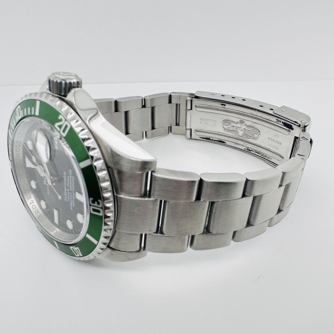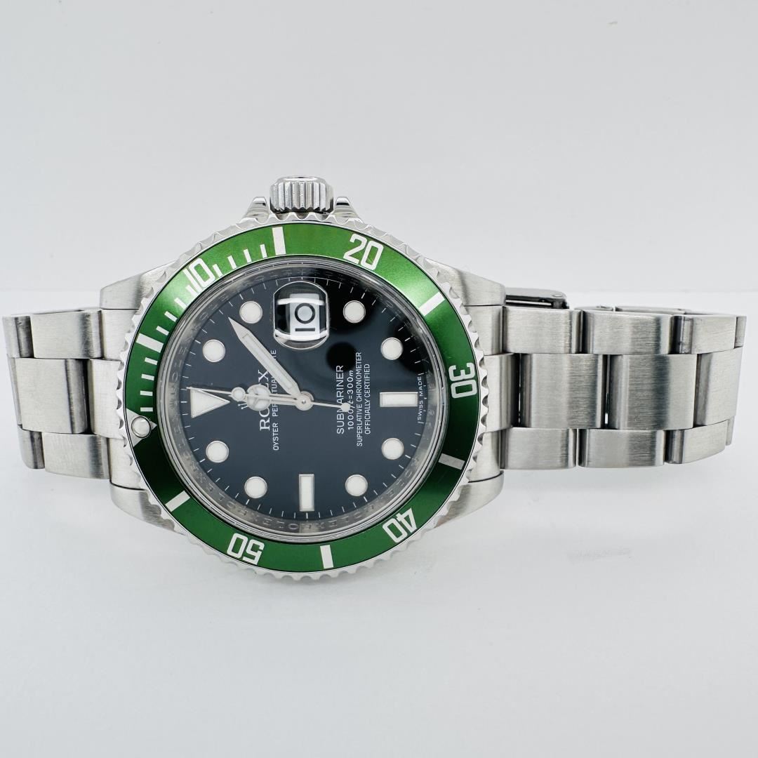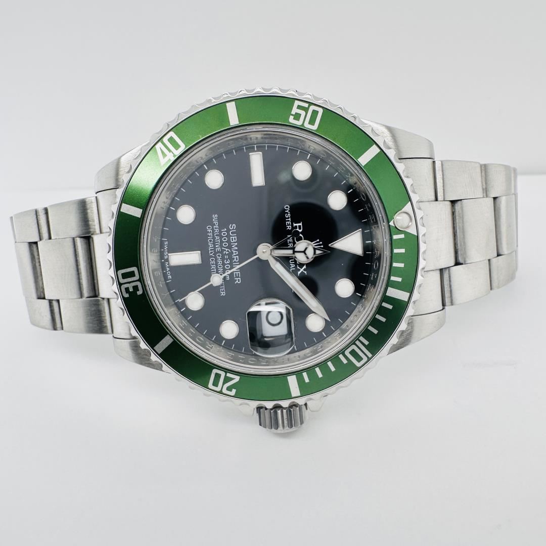 This Rolex Submariner Date, known as the 'Kermit,' features a stainless steel case and Oyster bracelet. The black dial is accented with luminous hour markers and a date display at 3 o'clock, framed by the iconic green unidirectional rotating bezel. Highly collectible and instantly recognizable, this model blends professional dive functionality with bold, timeless design.