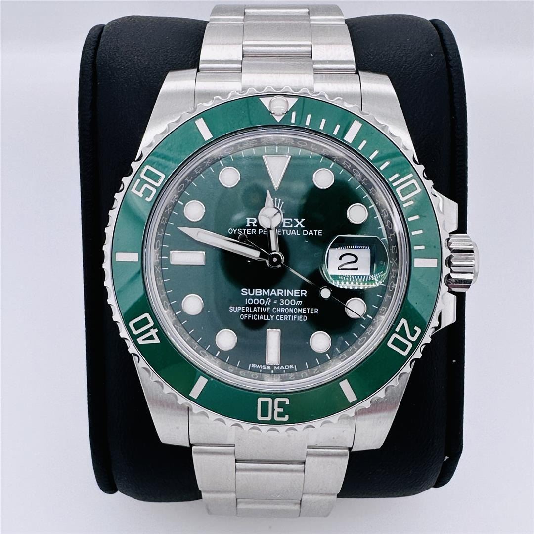 This Rolex timepiece is a highly coveted variant of the cherished anniversary Submariner, distinguished by the presence of Rolex's signature green hue on both the bezel and dial. This exceptional diver's watch is a coveted item for collectors and can be proudly owned in its exceptional Rolex condition, complete with its original box and papers. Affectionately referred to as the "Hulk," this iconic green Submariner boasts a modernized case design that includes a larger crown guard and thicker lugs, even though it maintains the classic 40mm diameter found in its predecessors. This update results in a slightly more substantial wrist presence when worn. Furthermore, this edition of the Submariner showcases a contemporary bracelet with polished center links and enhanced structural integrity. In its entirety, the "Hulk" lives up to its impressive moniker, commanding attention with its commanding wrist presence and the enchanting green bezel and dial that have become its defining features.