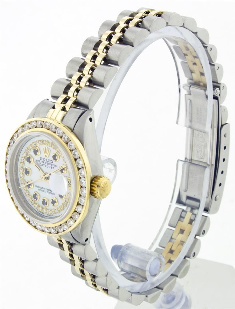 One Ladies Two Tone Rolex Datejust Polished, Serviced & Electronically Tested, 14K Yellow Gold & Stainless Steel Case:26mm, 14K Yellow Gold Crown, Custom Bezel: 18K Yellow Gold Channel Set Diamond Bezel, Diamond Count: 44 Diamonds Total Weight 2.5 Carat, Clarity: Si-VS, Color: G to H. Custom Crystal: Synthetic Sapphire Cyclops Lens. Movement: Automatic Winding Movement Caliber 2030. Custom Dial: Mother Of Pearl With Sapphire String Diamond Dial, Stone Count: 10 Sapphires + 33 Diamonds. Date Window: 3 O'Clock Position Date Display, Non Quickset, Model: 6917 Condition: G-6 Extra Fine. Bracelet: Two Tone 14K Yellow Gold & Stainless Steel Jubilee. Bright Polish. 5.5 Inch Length, Adjustable. Standard Clasp, With Rolex Logo.