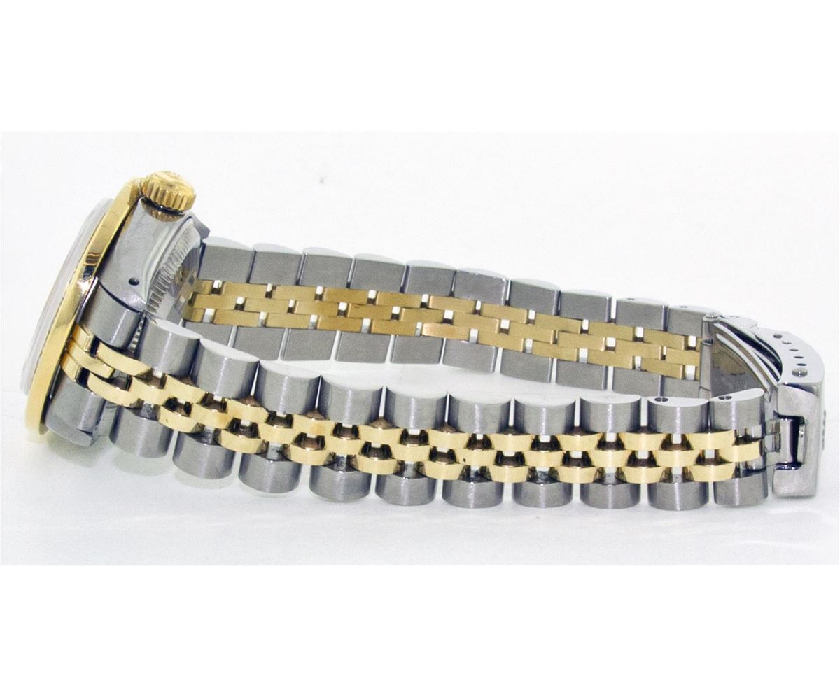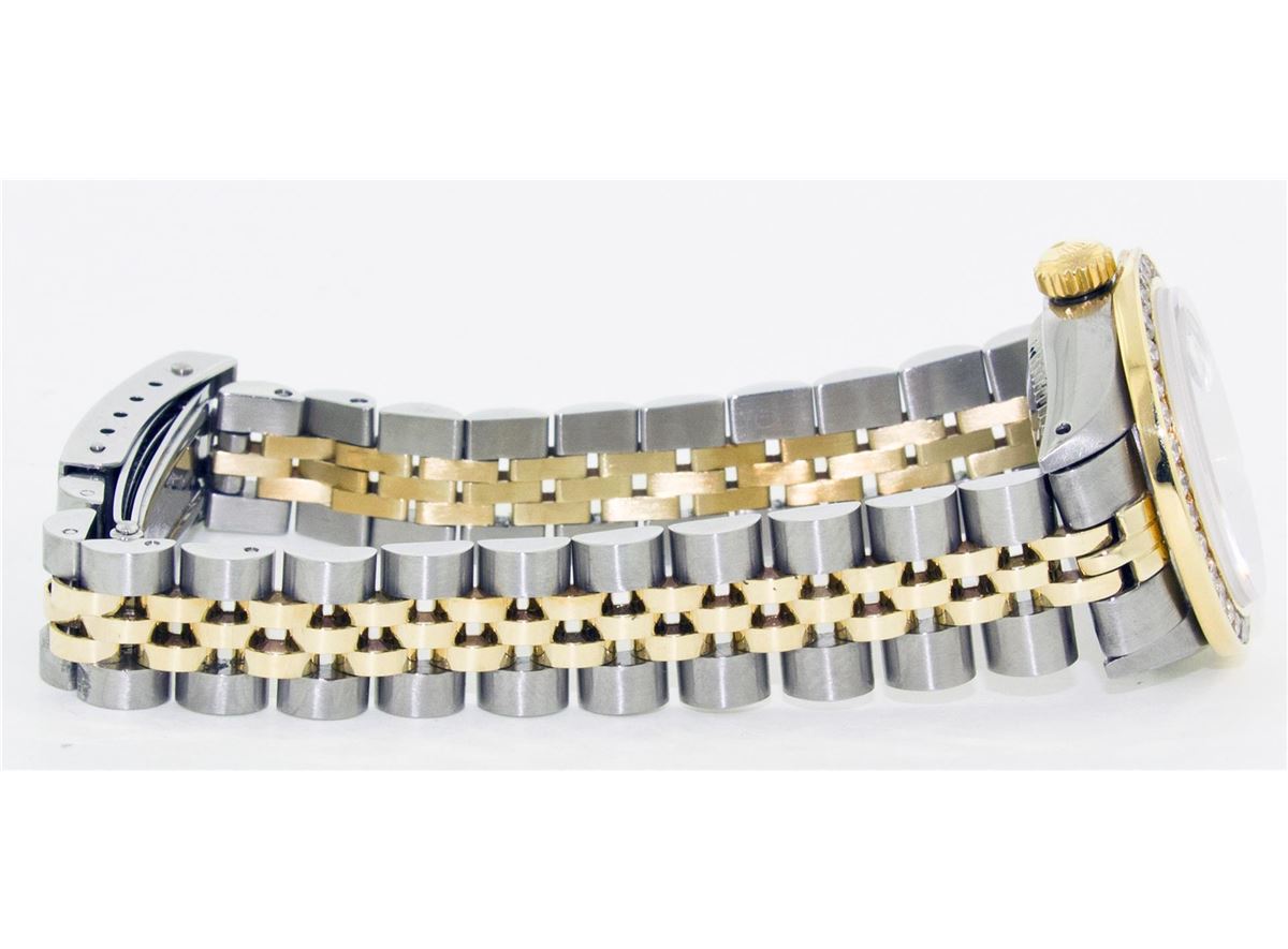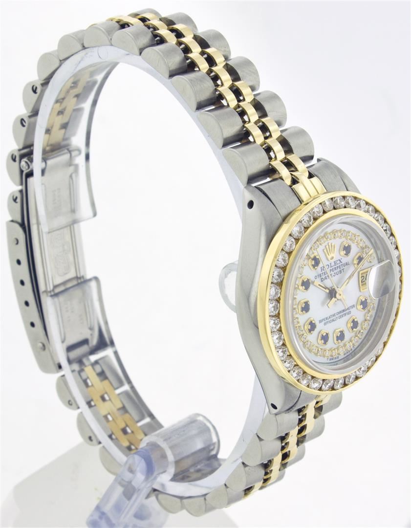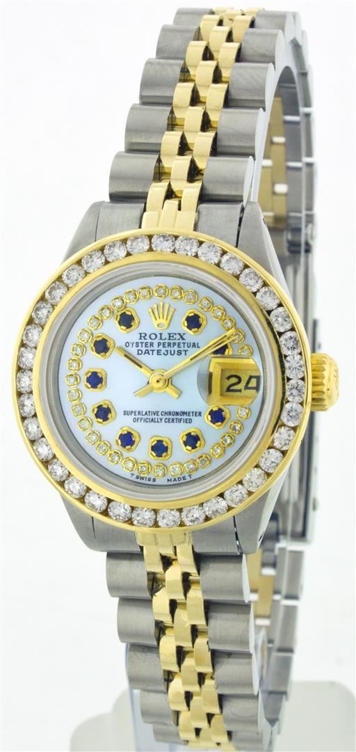 One Ladies Two Tone Rolex Datejust Polished, Serviced & Electronically Tested, 14K Yellow Gold & Stainless Steel Case:26mm, 14K Yellow Gold Crown, Custom Bezel: 18K Yellow Gold Channel Set Diamond Bezel, Diamond Count: 44 Diamonds Total Weight 2.5 Carat, Clarity: Si-VS, Color: G to H. Custom Crystal: Synthetic Sapphire Cyclops Lens. Movement: Automatic Winding Movement Caliber 2030. Custom Dial: Mother Of Pearl With Sapphire String Diamond Dial, Stone Count: 10 Sapphires + 33 Diamonds. Date Window: 3 O'Clock Position Date Display, Non Quickset, Model: 6917 Condition: G-6 Extra Fine. Bracelet: Two Tone 14K Yellow Gold & Stainless Steel Jubilee. Bright Polish. 5.5 Inch Length, Adjustable. Standard Clasp, With Rolex Logo.