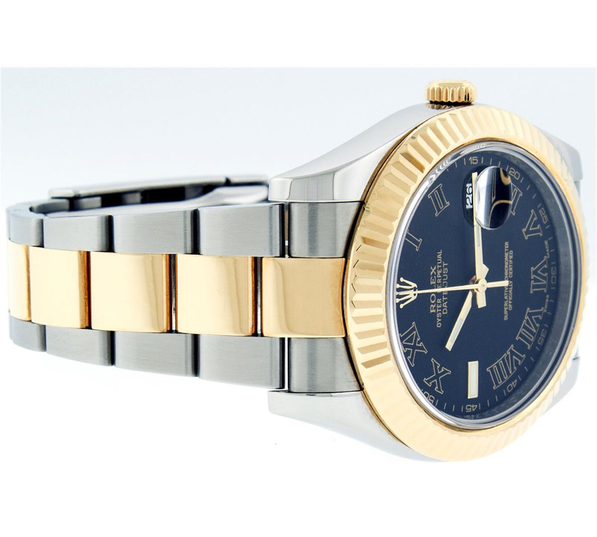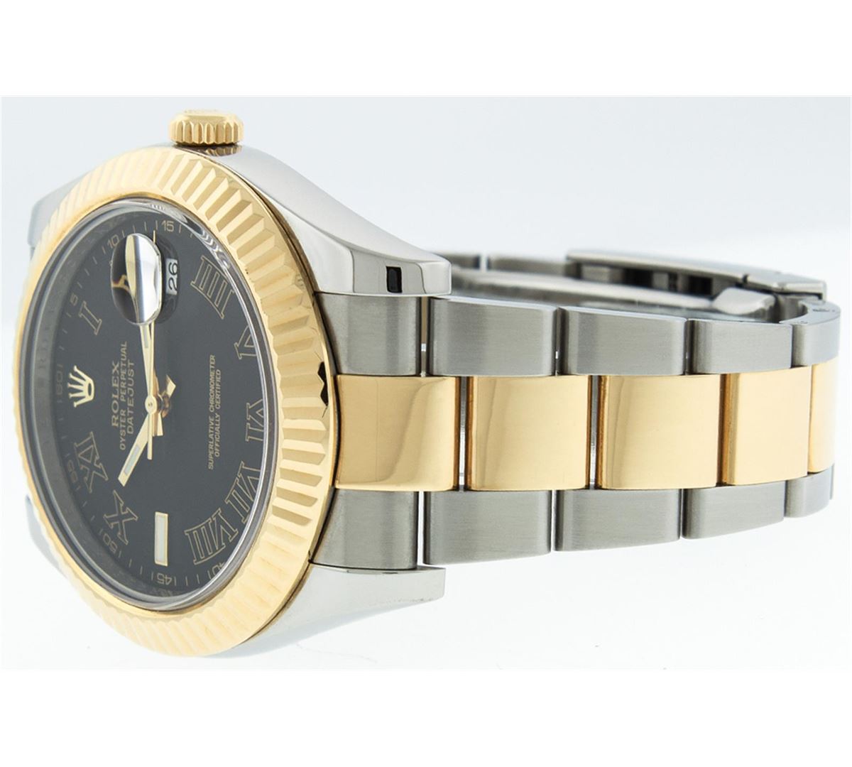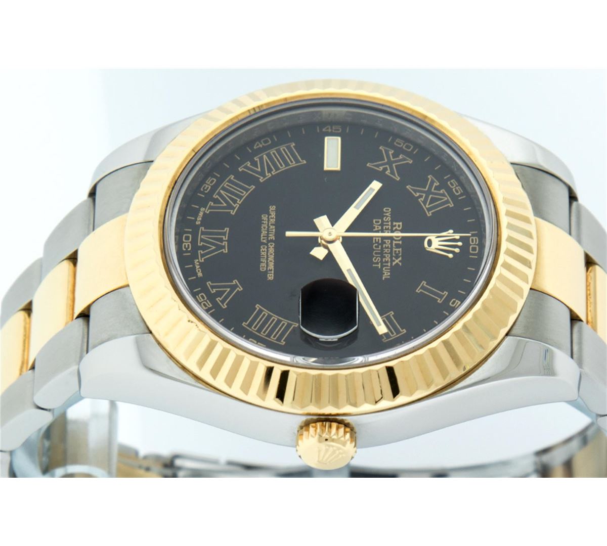 One Mens Rolex Datejust 2 Polished Bright with Satin Finish, Serviced & Electronically Tested, Stainless Steel Case:41mm, 18K Yellow Gold Crown, Bezel: 18K Yellow Gold Fluted Bezel. Crystal: Synthetic Sapphire Cyclops Lens. Movement: Automatic Winding Movement Caliber 3136. Dial: Black Roman Dial. Date Window: 3 O'Clock Position Date Display, Quickset, Model: 116233 Datejust 2. Condition: G-6 Extra Fine. Bracelet: 18K Yellow Gold & Stainless Steel Oyster Band. Bright Polish & Satin Finish. 7.5 Inch Length, Adjustable. Standard Clasp, With Rolex Logo. Comes with a 6 month warranty card.