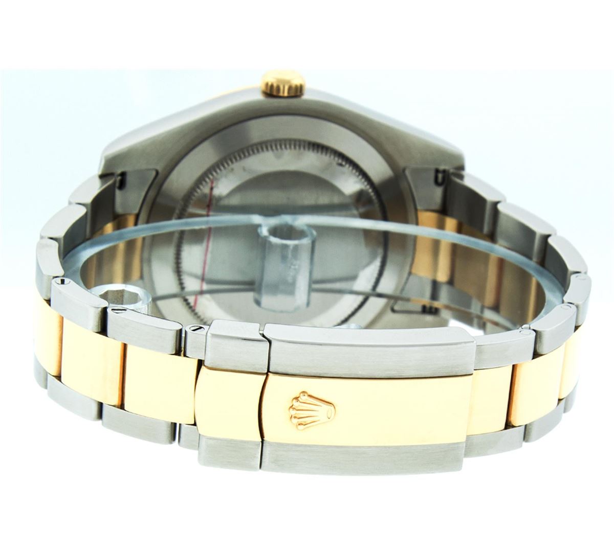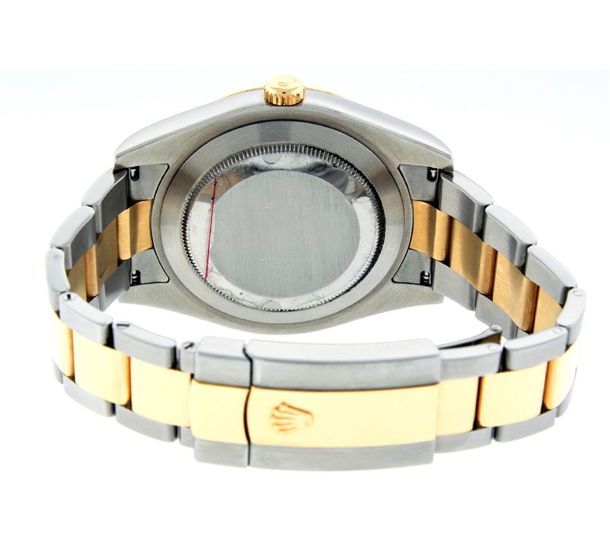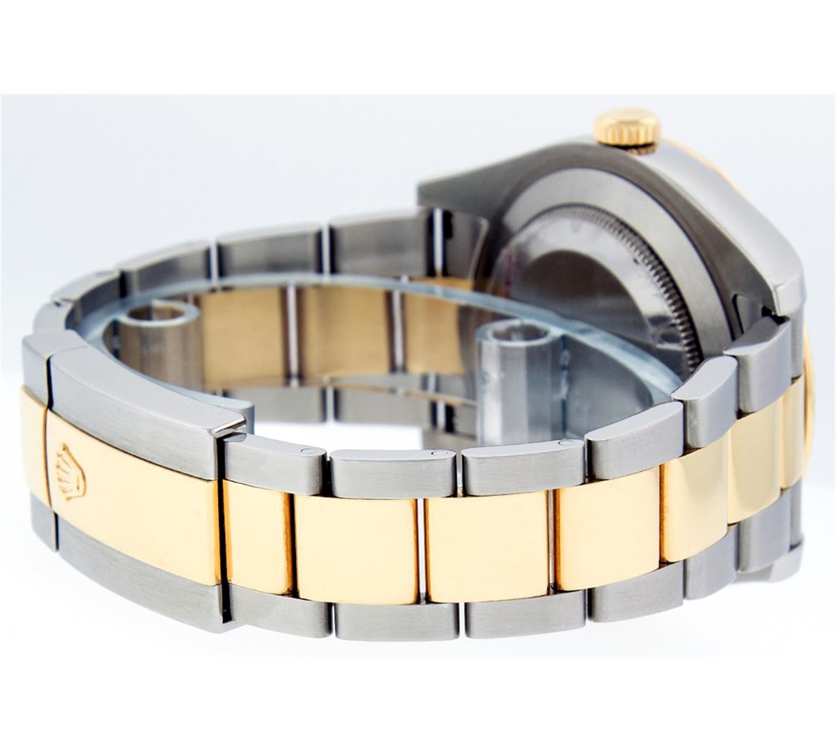 One Mens Rolex Datejust 2 Polished Bright with Satin Finish, Serviced & Electronically Tested, Stainless Steel Case:41mm, 18K Yellow Gold Crown, Bezel: 18K Yellow Gold Fluted Bezel. Crystal: Synthetic Sapphire Cyclops Lens. Movement: Automatic Winding Movement Caliber 3136. Dial: Black Roman Dial. Date Window: 3 O'Clock Position Date Display, Quickset, Model: 116233 Datejust 2. Condition: G-6 Extra Fine. Bracelet: 18K Yellow Gold & Stainless Steel Oyster Band. Bright Polish & Satin Finish. 7.5 Inch Length, Adjustable. Standard Clasp, With Rolex Logo. Comes with a 6 month warranty card.