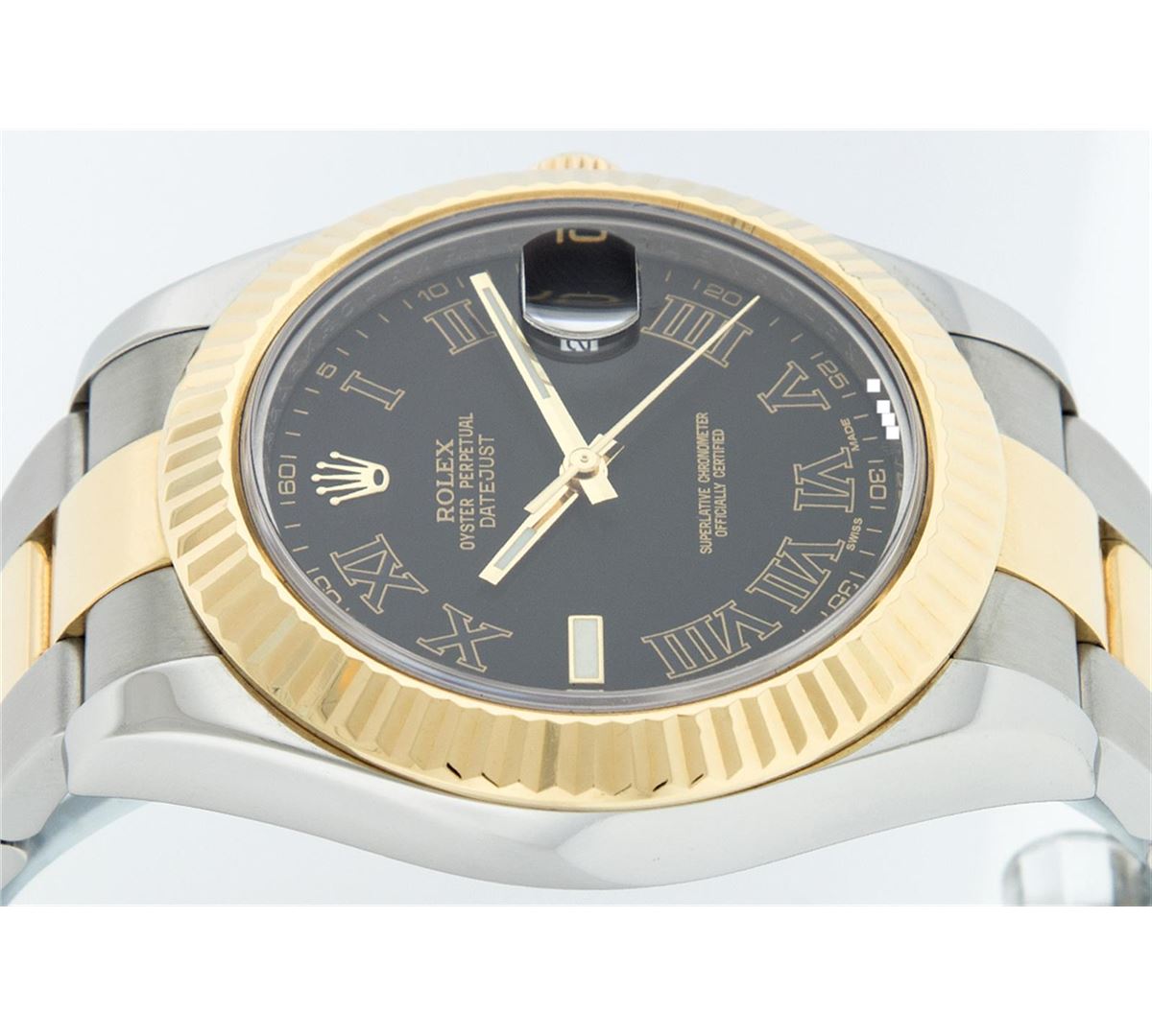 One Mens Rolex Datejust 2 Polished Bright with Satin Finish, Serviced & Electronically Tested, Stainless Steel Case:41mm, 18K Yellow Gold Crown, Bezel: 18K Yellow Gold Fluted Bezel. Crystal: Synthetic Sapphire Cyclops Lens. Movement: Automatic Winding Movement Caliber 3136. Dial: Black Roman Dial. Date Window: 3 O'Clock Position Date Display, Quickset, Model: 116233 Datejust 2. Condition: G-6 Extra Fine. Bracelet: 18K Yellow Gold & Stainless Steel Oyster Band. Bright Polish & Satin Finish. 7.5 Inch Length, Adjustable. Standard Clasp, With Rolex Logo. Comes with a 6 month warranty card.