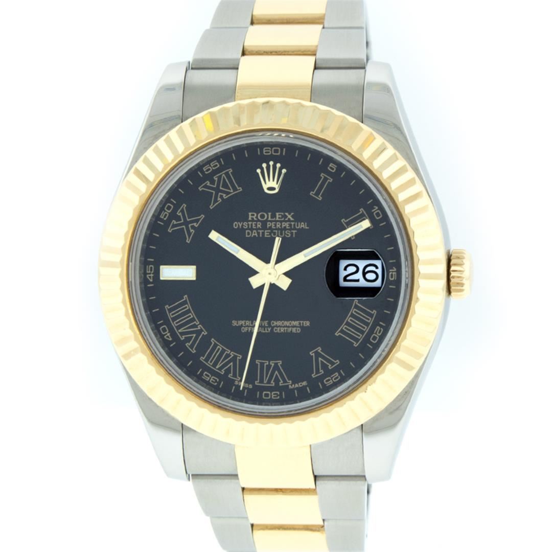One Mens Rolex Datejust 2 Polished Bright with Satin Finish, Serviced & Electronically Tested, Stainless Steel Case:41mm, 18K Yellow Gold Crown, Bezel: 18K Yellow Gold Fluted Bezel. Crystal: Synthetic Sapphire Cyclops Lens. Movement: Automatic Winding Movement Caliber 3136. Dial: Black Roman Dial. Date Window: 3 O'Clock Position Date Display, Quickset, Model: 116233 Datejust 2. Condition: G-6 Extra Fine. Bracelet: 18K Yellow Gold & Stainless Steel Oyster Band. Bright Polish & Satin Finish. 7.5 Inch Length, Adjustable. Standard Clasp, With Rolex Logo. Comes with a 6 month warranty card.