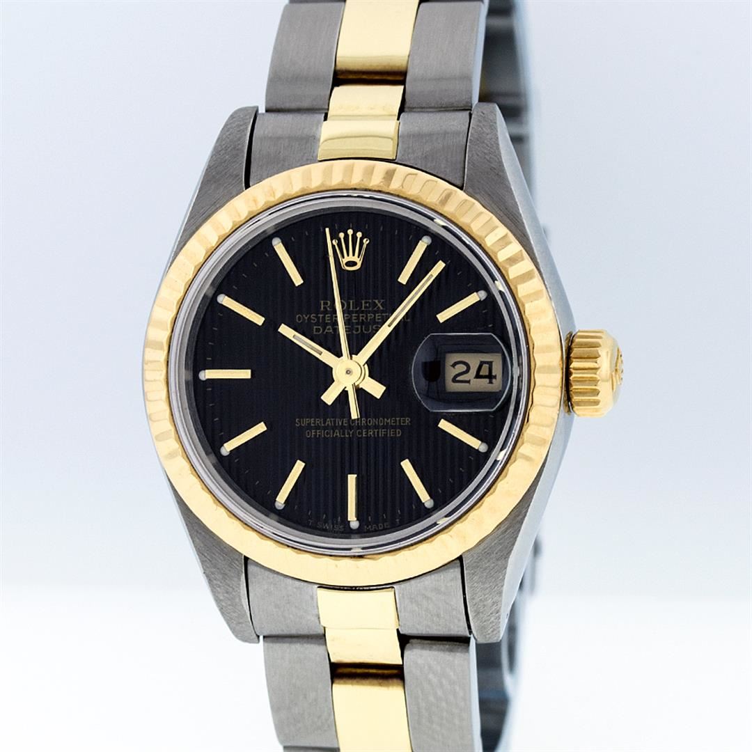 One Ladies Two Tone Rolex Datejust Polished, Serviced & Electronically Tested, 14K Yellow Gold & Stainless Steel Case:26mm, 14K Yellow Gold Crown, Bezel: 14K Yellow Gold Fluted Bezel. Custom Crystal: Acrylic Cyclops Lens. Movement: Automatic Winding Movement Caliber 2030. Dial: Black Tapestry Index With Luminescent Dots. Date Window: 3 O'Clock Position Date Display, Model: Datejust. Condition: G-6 Extra Fine. Bracelet: Two Tone 14K Yellow Gold & Stainless Steel Oyster Band. Bright Polish. 5.5 Inch Length, Adjustable. Standard Clasp, With Rolex Logo. Comes with a 6 month warranty card.