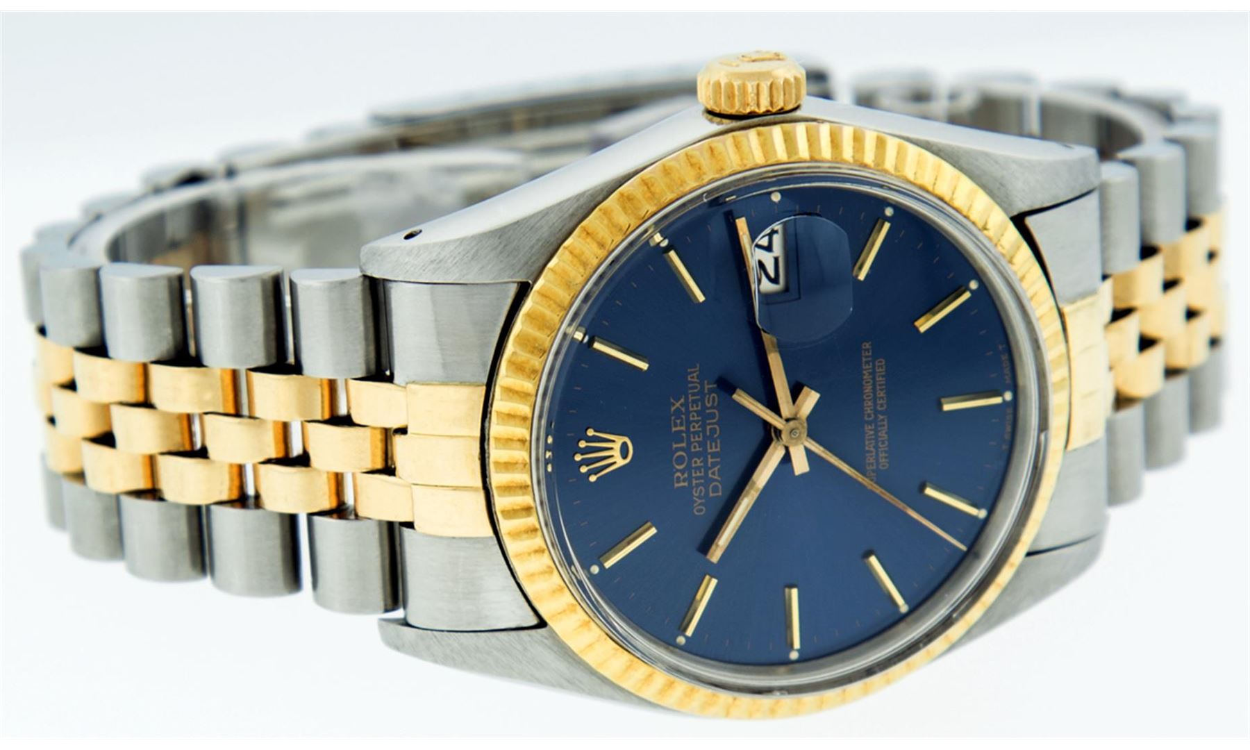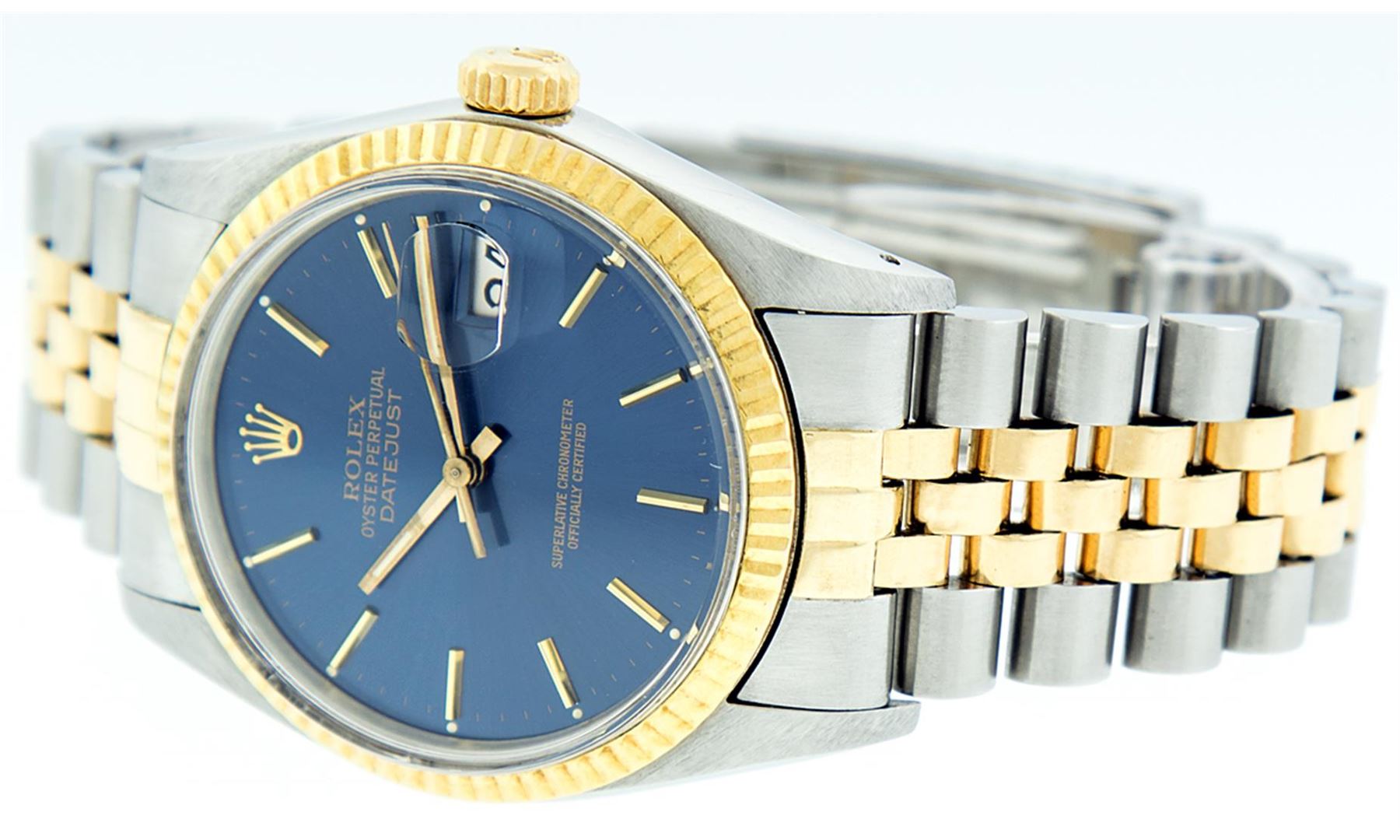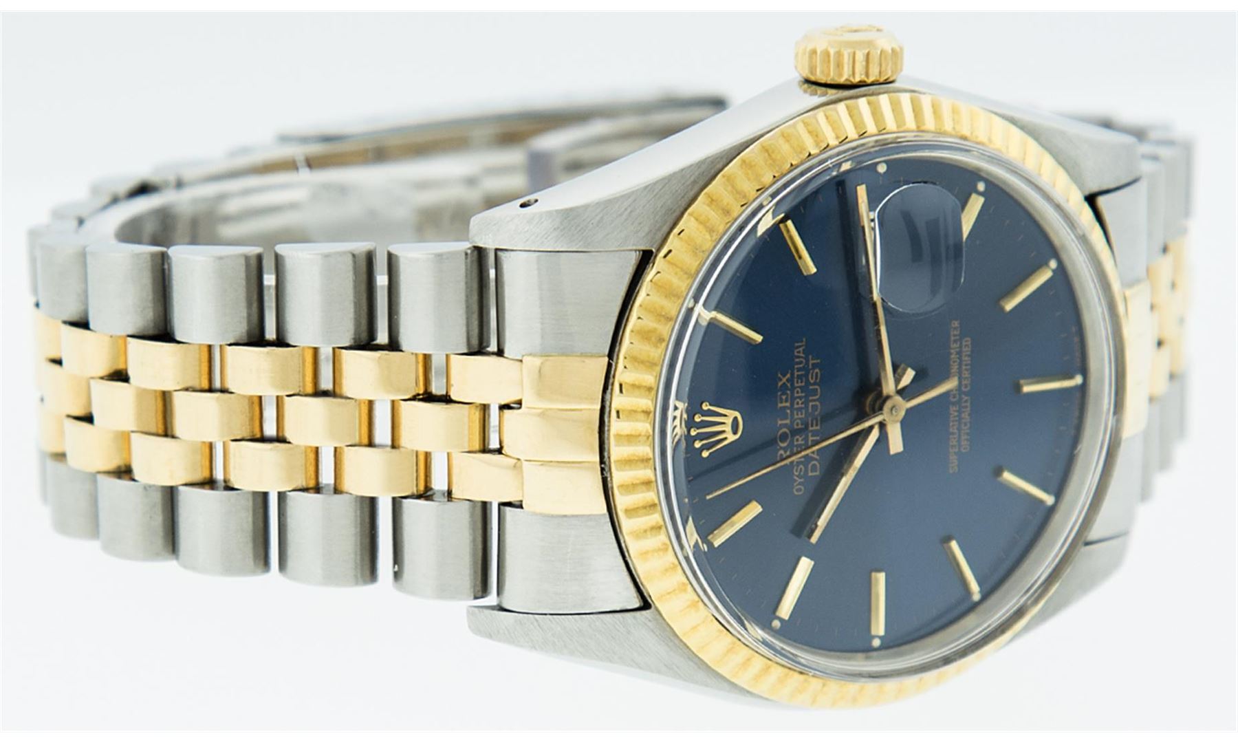 One Gents Two Tone Rolex Datejust Polished, Serviced & Electronically Tested, 14K Yellow Gold & Stainless Steel Case:36mm, 14K Yellow Gold Crown, Bezel:14K Yellow Gold Fluted Bezel. Custom Crystal: Acrylic Cyclops Lens. Movement: Automatic Winding Movement Caliber 3035. Custom Dial: Blue Index With Luminescent Dots. Date Window: 3 O'Clock Position Date Display, Quickset, Model: 16013 Condition: G-6 Extra Fine. Bracelet: Two Tone 14K Yellow Gold & Stainless Steel Jubilee. Bright Polish. 6.5 Inch Length, Adjustable. Standard Clasp, With Rolex Logo.