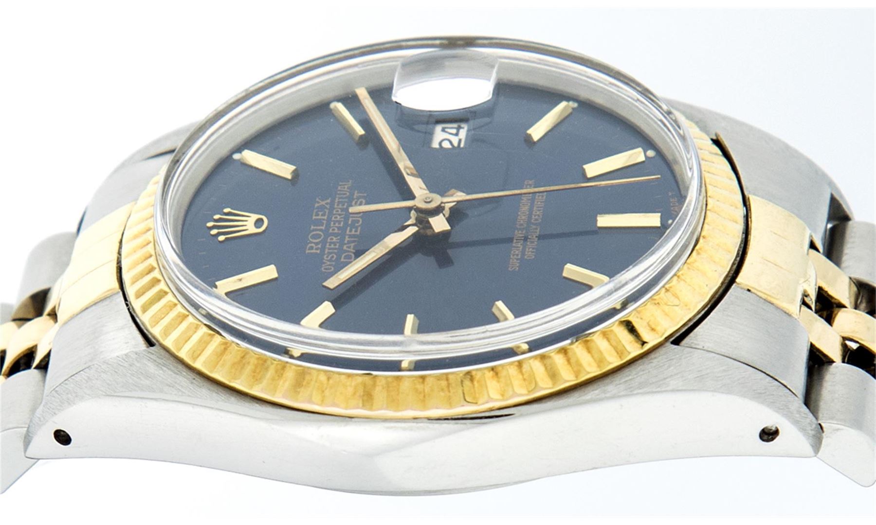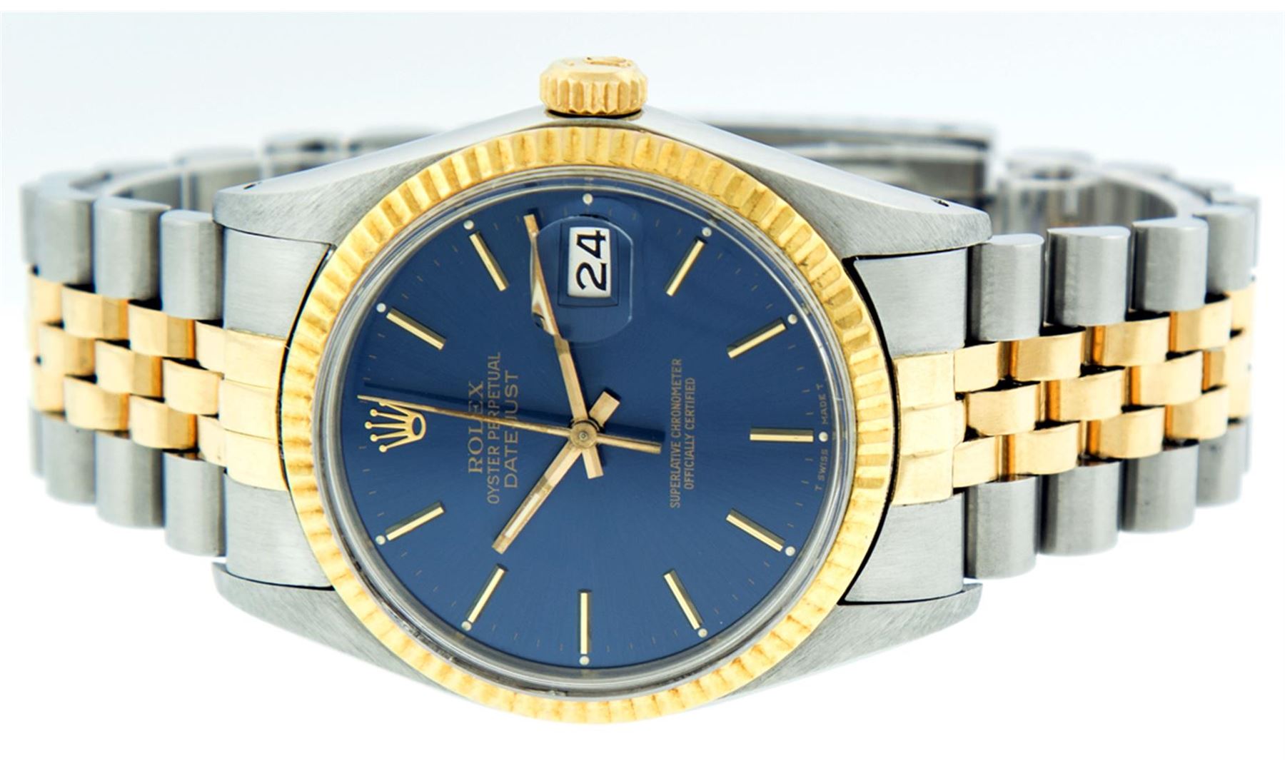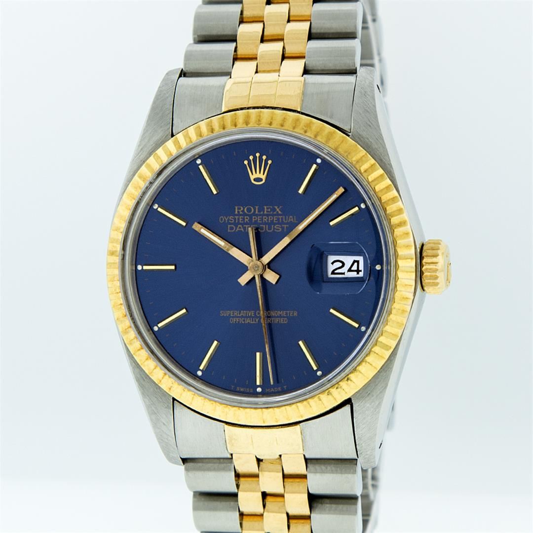One Gents Two Tone Rolex Datejust Polished, Serviced & Electronically Tested, 14K Yellow Gold & Stainless Steel Case:36mm, 14K Yellow Gold Crown, Bezel:14K Yellow Gold Fluted Bezel. Custom Crystal: Acrylic Cyclops Lens. Movement: Automatic Winding Movement Caliber 3035. Custom Dial: Blue Index With Luminescent Dots. Date Window: 3 O'Clock Position Date Display, Quickset, Model: 16013 Condition: G-6 Extra Fine. Bracelet: Two Tone 14K Yellow Gold & Stainless Steel Jubilee. Bright Polish. 6.5 Inch Length, Adjustable. Standard Clasp, With Rolex Logo.