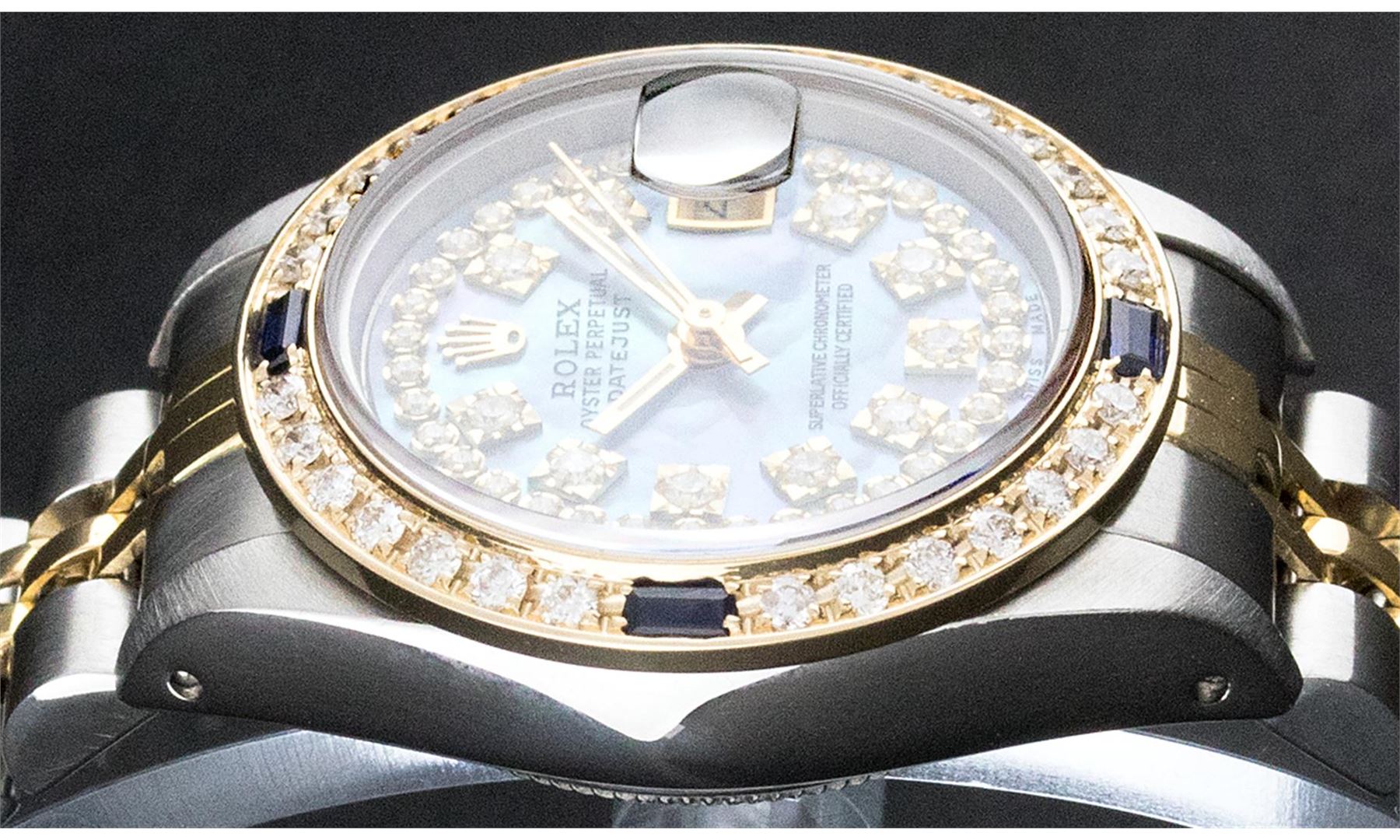One Ladies Rolex Datejust Polished Bright with Satin Finish, Serviced & Electronically Tested, Stainless Steel Case:26mm, Yellow Gold Crown. Custom Bezel: 18K Yellow Gold Sapphire Beadset Bezel, Diamond Count: 28 Diamonds + 4 Sapphires, Total Weight 1.00 Carat, Clarity: SI-VS, Color: G to H. Custom Crystal: Synthetic Sapphire Cyclops Lens. Movement: Automatic Winding Movement Caliber 2030. Custom Dial: Refinished Blue MOP String Diamond Dial, Diamond Count: 43 Diamonds in Dial G To H In Color, Clarity: VVS. Date Window: 3 O'Clock Position Date Display, Non Quickset, Model: Datejust Condition: G-6 Extra Fine. Bracelet: Two Tone Yellow Gold and Stainless Steel Jubilee. Bright Polish & Satin Finish. 5.5 Inch Length, Adjustable. Standard Clasp, With Rolex Logo.