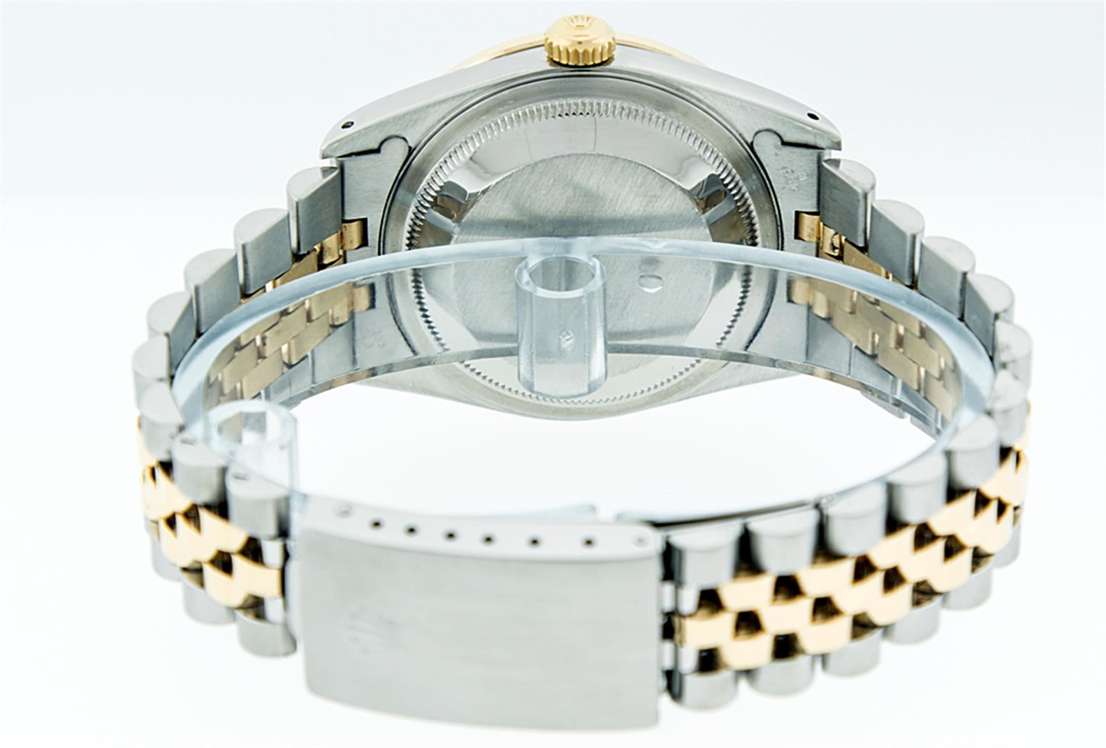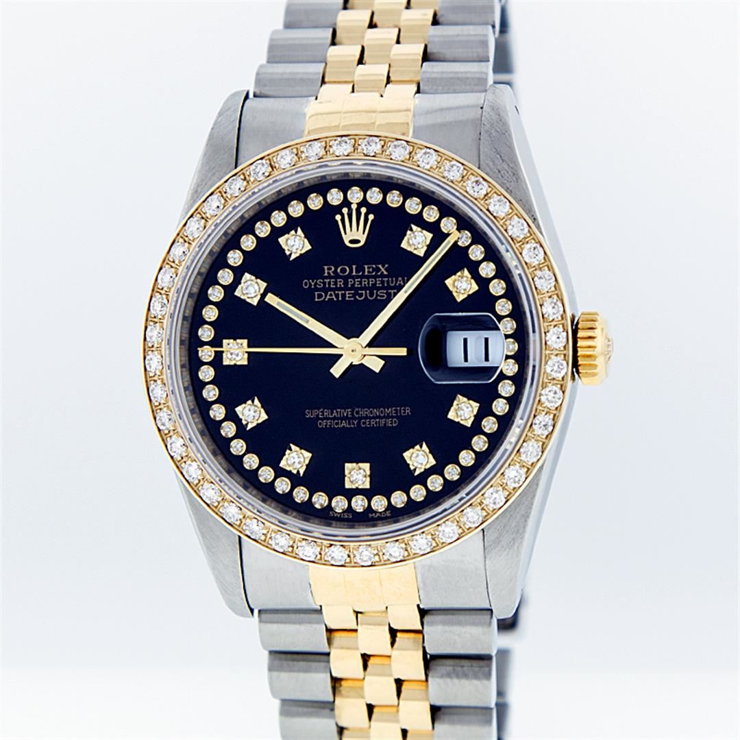 One Mens Two Tone Rolex Datejust Polished, Serviced & Electronically Tested, 14K Yellow Gold & Stainless Steel Case:36mm, 14K Yellow Gold Crown, Custom Bezel: 18K Yellow Gold Beadset Diamond Bezel, Diamond Count: 44 Diamonds, Total Weight 1.00 Carat, Clarity: Si-VS, Color: G to H. Custom Crystal: Synthetic Sapphire Cyclops Lens. Movement: Automatic Winding Movement Caliber 3035. Custom Dial: Blue VVS String Diamond Dial, Diamond Count: 58 Diamonds in Dial G To H In Color, VVS In Clarity. Date Window: 3 O'Clock Position Date Display, Quickset, Model: 16013 Condition: G-6 Extra Fine. Bracelet: Two Tone 14K Yellow Gold & Stainless Steel Jubilee. Bright Polish. 7.0 Inch Length, Adjustable. Standard Clasp, With Rolex Logo.