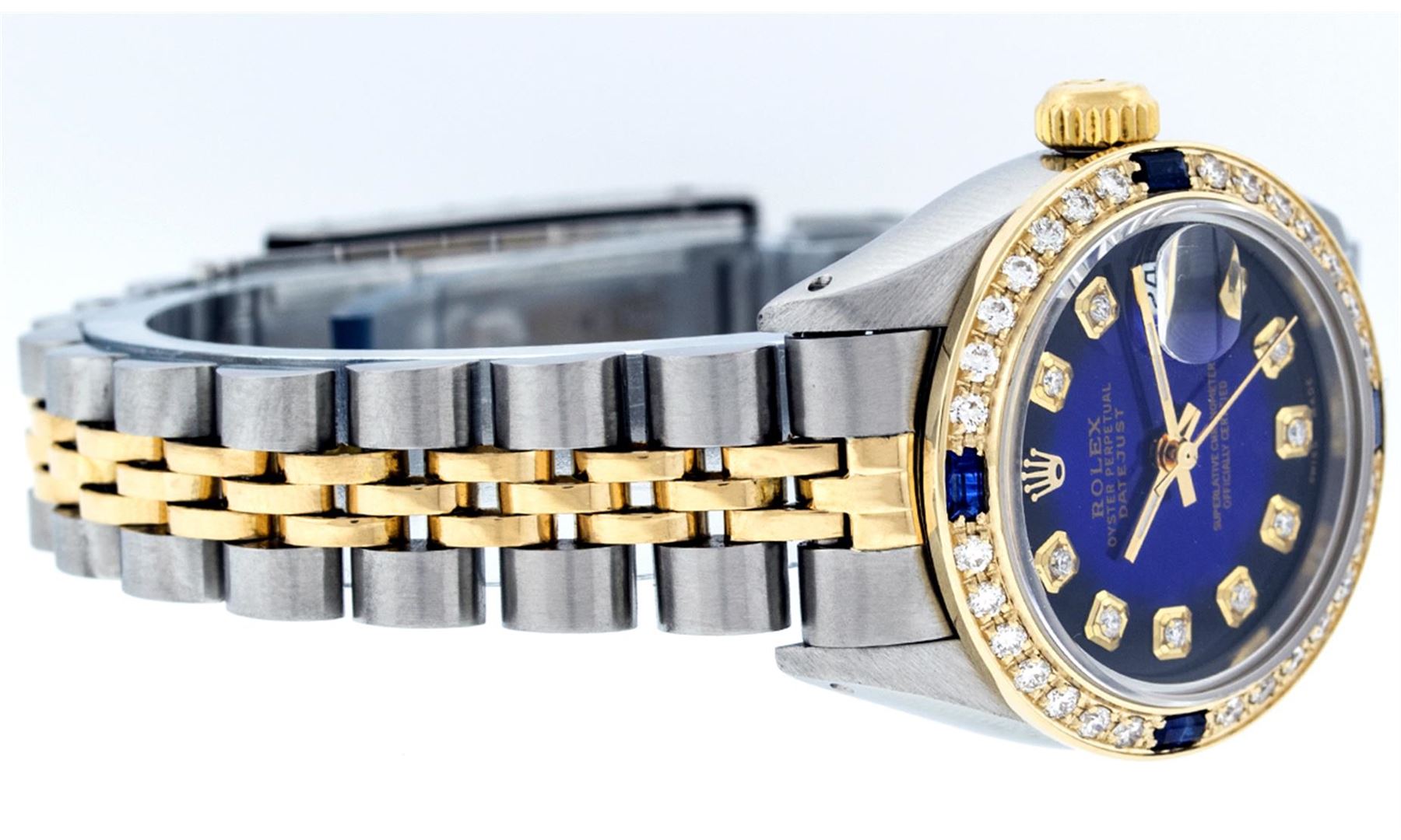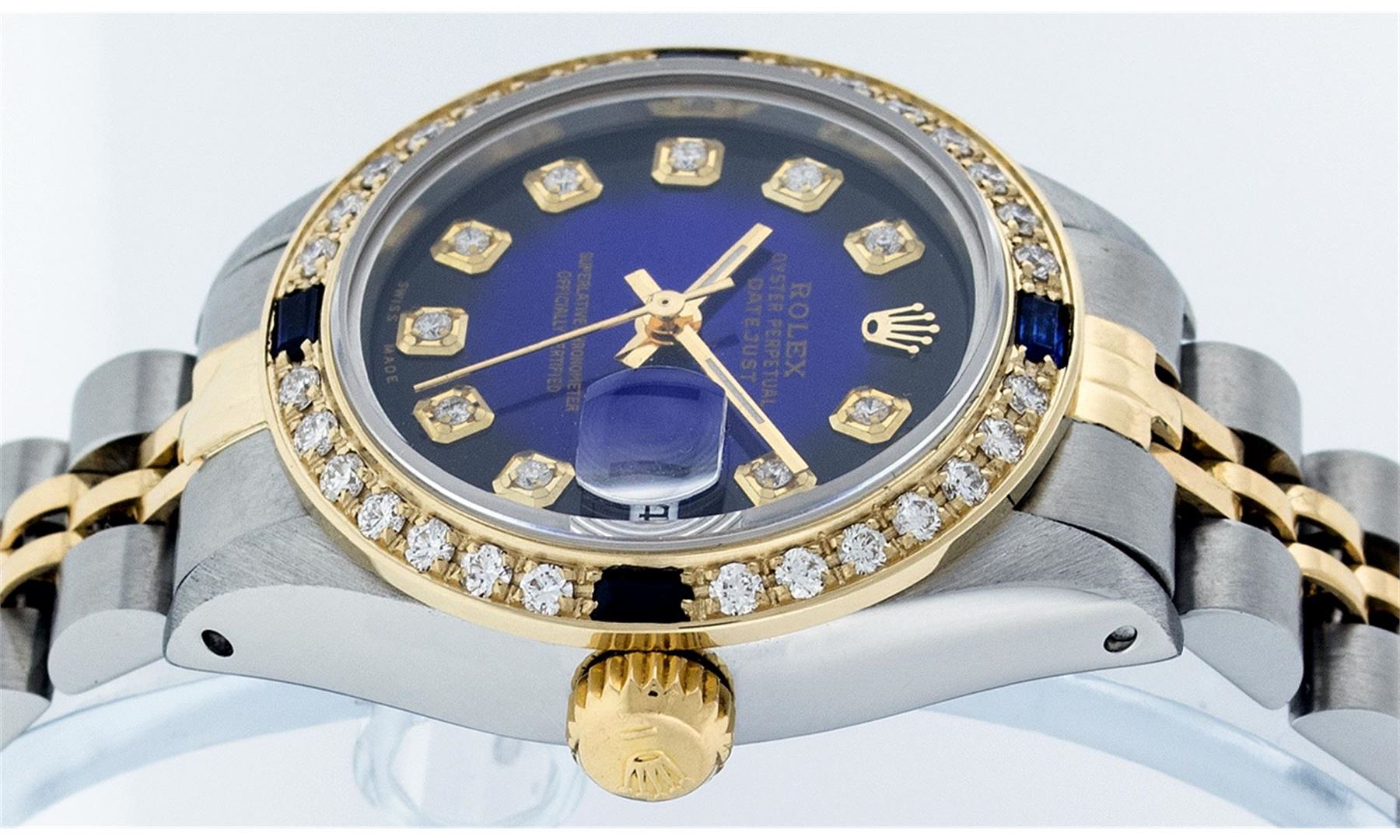 One Ladies Two Tone Rolex Datejust Polished, Serviced & Electronically Tested, 14K Yellow Gold & Stainless Steel Case:26mm, 14K Yellow Gold Crown, Custom Bezel: 18K Yellow Gold Sapphire Beadset Diamond Bezel, Diamond + Gem Count: 28 Diamonds + 4 Sapphires Total Weight .70 Carat, Clarity: Si-VS, Color: G to H. Custom Crystal: Synthetic Sapphire Cyclops Lens. Movement: Automatic Winding Movement Caliber 2030. Custom Dial: Blue Vignette Dial Set With Diamond Hour Markers, 10 Diamond in Dial G To H In Color, Si-VS Clarity. Date Window: 3 O'Clock Position Date Display, Model: Datejust, Condition: G-6 Extra Fine. Bracelet: Two Tone 14K Yellow Gold & Stainless Steel Jubilee. Bright Polish. 5.5 Inch Length, Adjustable. Standard Clasp, With Rolex Logo. Comes with a 6 month warranty card.