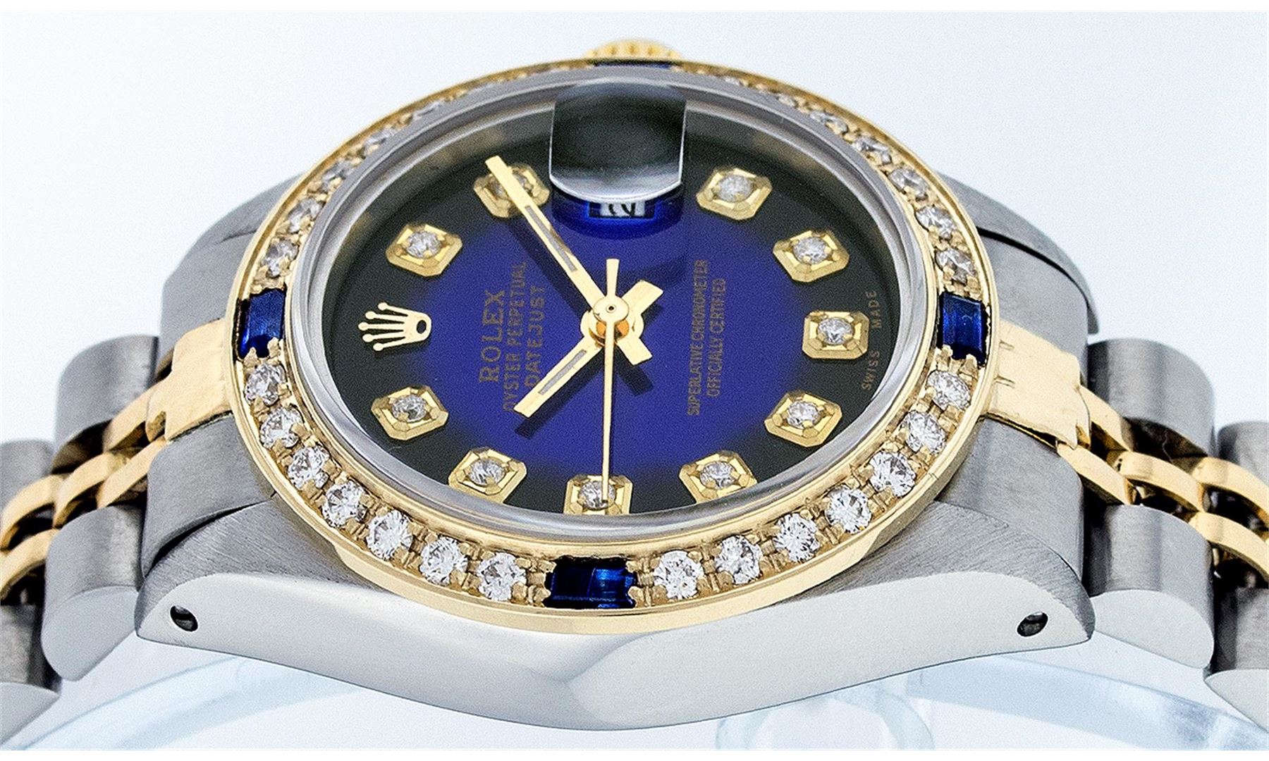 One Ladies Two Tone Rolex Datejust Polished, Serviced & Electronically Tested, 14K Yellow Gold & Stainless Steel Case:26mm, 14K Yellow Gold Crown, Custom Bezel: 18K Yellow Gold Sapphire Beadset Diamond Bezel, Diamond + Gem Count: 28 Diamonds + 4 Sapphires Total Weight .70 Carat, Clarity: Si-VS, Color: G to H. Custom Crystal: Synthetic Sapphire Cyclops Lens. Movement: Automatic Winding Movement Caliber 2030. Custom Dial: Blue Vignette Dial Set With Diamond Hour Markers, 10 Diamond in Dial G To H In Color, Si-VS Clarity. Date Window: 3 O'Clock Position Date Display, Model: Datejust, Condition: G-6 Extra Fine. Bracelet: Two Tone 14K Yellow Gold & Stainless Steel Jubilee. Bright Polish. 5.5 Inch Length, Adjustable. Standard Clasp, With Rolex Logo. Comes with a 6 month warranty card.