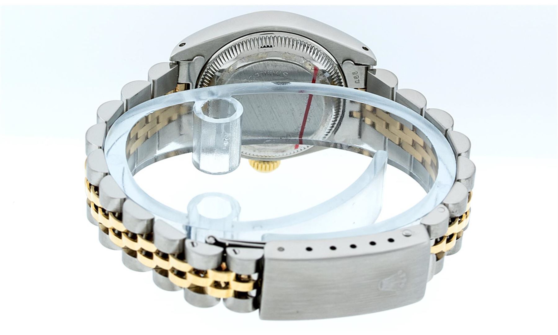 One Ladies Two Tone Rolex Datejust Polished, Serviced & Electronically Tested, 14K Yellow Gold & Stainless Steel Case:26mm, 14K Yellow Gold Crown, Bezel: 14K Yellow Gold Fluted Bezel. Custom Crystal: Acrylic Cyclops Lens. Movement: Automatic Winding Movement Caliber 2030. Custom Dial: Cream Arabic Jubilee Dial. Date Window: 3 O'Clock Position Date Display, Model: Datejust. Condition: G-6 Extra Fine. Bracelet: Two Tone 14K Yellow Gold & Stainless Steel Jubilee Band. Bright Polish. 6.0 Inch Length, Adjustable. Standard Clasp, With Rolex Logo.