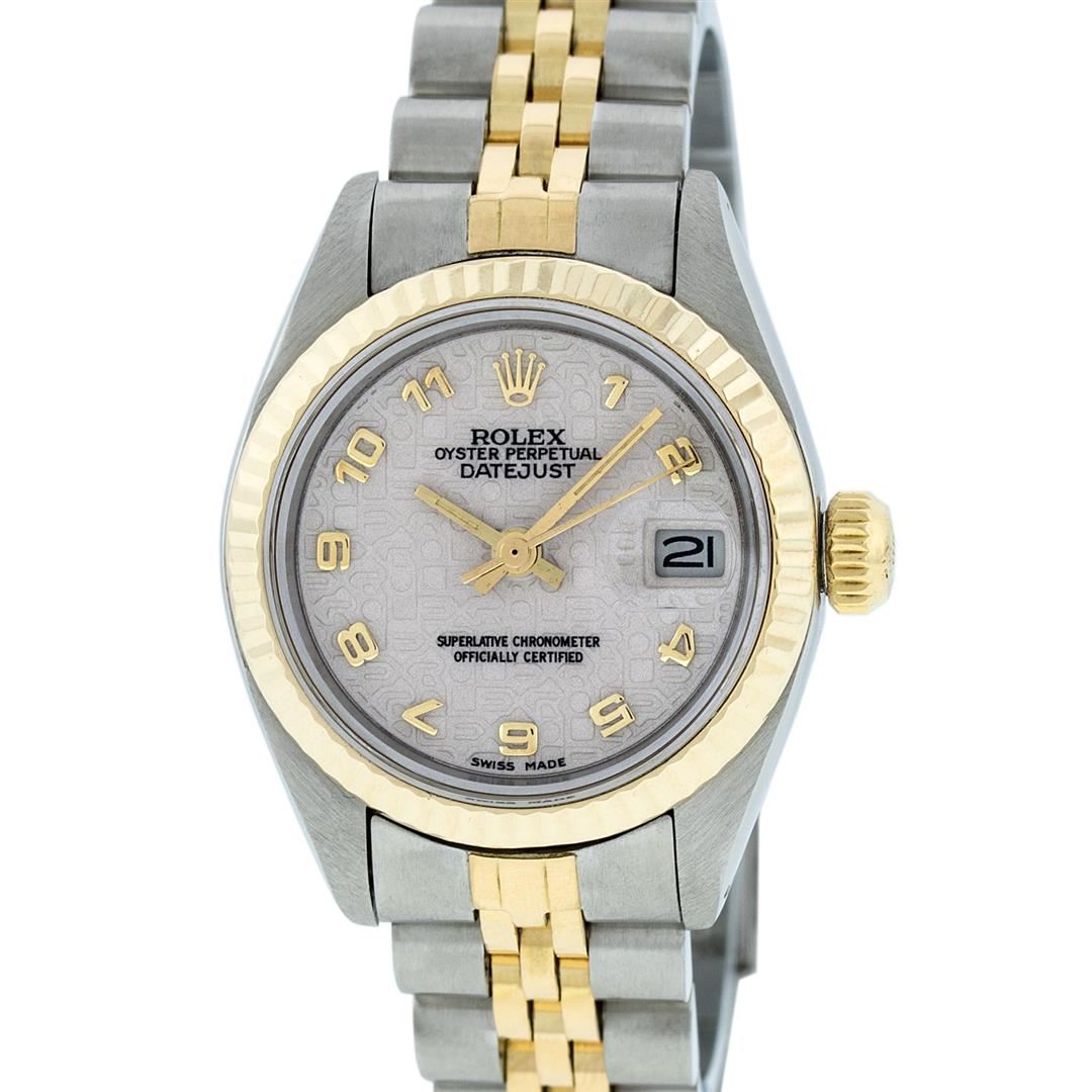 One Ladies Two Tone Rolex Datejust Polished, Serviced & Electronically Tested, 14K Yellow Gold & Stainless Steel Case:26mm, 14K Yellow Gold Crown, Bezel: 14K Yellow Gold Fluted Bezel. Custom Crystal: Acrylic Cyclops Lens. Movement: Automatic Winding Movement Caliber 2030. Custom Dial: Cream Arabic Jubilee Dial. Date Window: 3 O'Clock Position Date Display, Model: Datejust. Condition: G-6 Extra Fine. Bracelet: Two Tone 14K Yellow Gold & Stainless Steel Jubilee Band. Bright Polish. 6.0 Inch Length, Adjustable. Standard Clasp, With Rolex Logo.