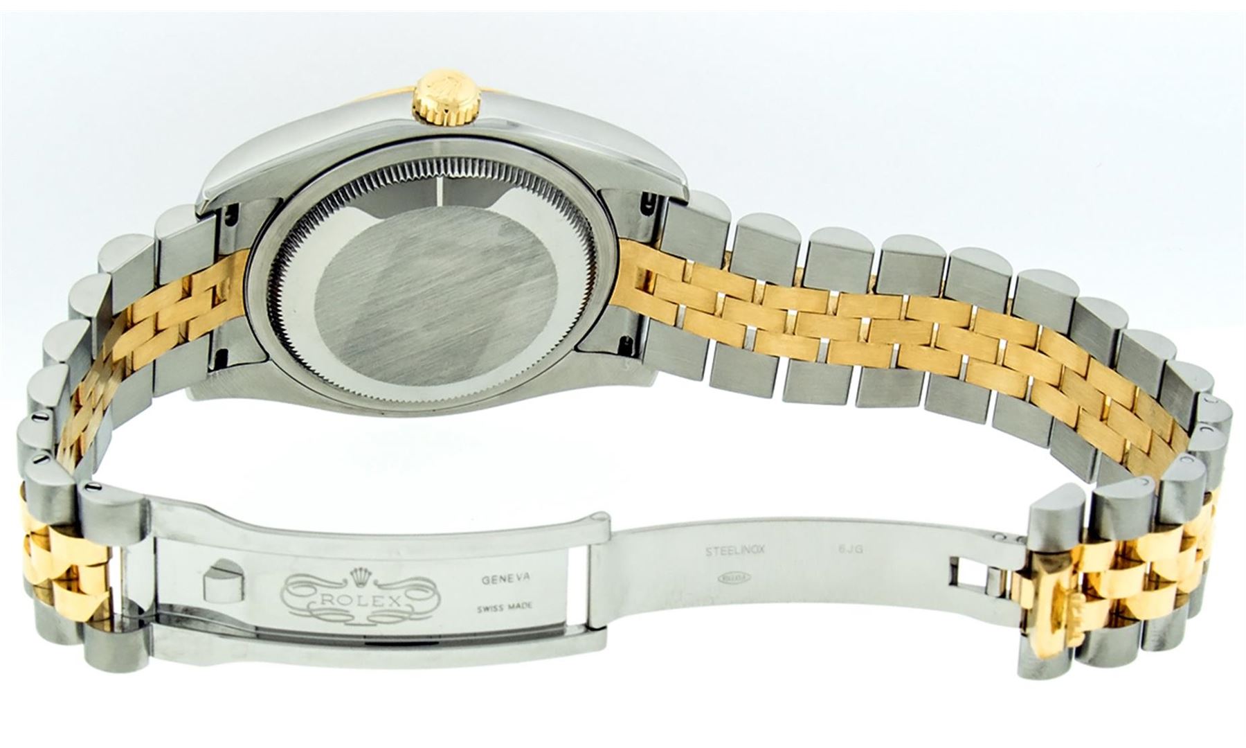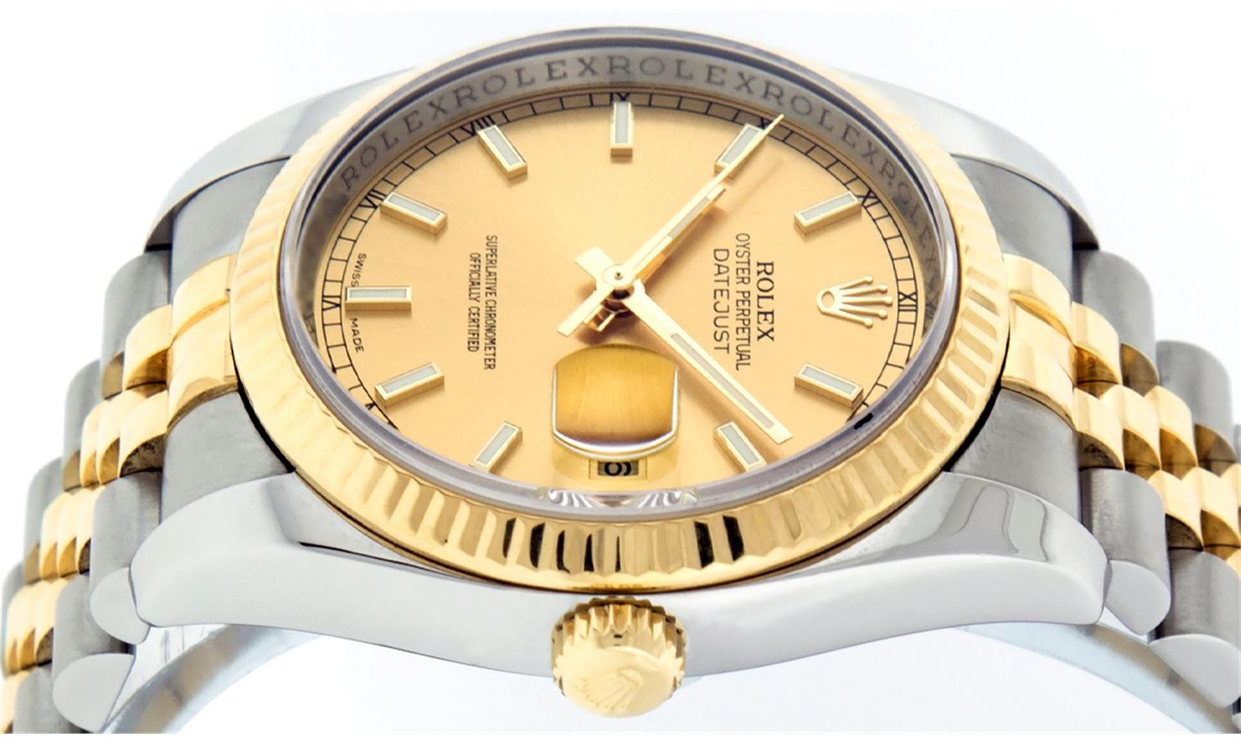 One Gents 18K Yellow Gold Two Tone Rolex Datejust Polished, Serviced & Electronically Tested, 18K Yellow Gold & Stainless Steel Case:36mm, 18K Yellow Gold Crown, Bezel: 18K Yellow Gold Fluted Bezel. Crystal: Synthetic Sapphire Cyclops Lens. Movement: Automatic Winding Movement Caliber 3135. Dial: Champagne Index With Square Roman Track. Date Window: 3 O'Clock Position Date Display, Quickset, Model: 116233 Condition: G-6 Extra Fine The Watch Is In Very Good Condition Free Of All Scratches And Dents. Bracelet: Two Tone 18K Yellow Gold Hidden Clasp New Style Jubilee Band. Bright Polish. 7.0 Inch Length, Adjustable. Standard Clasp, With Rolex Logo. Comes with 6 month warranty.