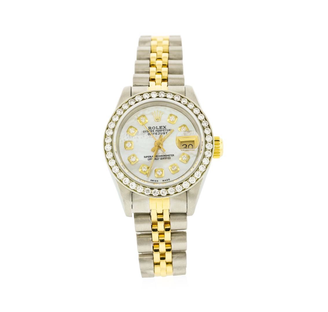 One ladies, hand crafted & machine milled Rolex DateJust Model wristwatch electronically tested, Stainless Steel Case: 26mm oyster, 18KT Yellow gold Rolex Signature Crown: twinlock with high relief logo, non-factory Custom Bezel: diamond set, Custom Crystal: synthetic sapphire cyclops lens. Movement: superlative chronometer, Custom Dial: mother of pearl, with luminous hands & diamond markers, Calendar: 3 o'clock position date display, quick set, Champagne color, Circa: 1985, Condition: G-5 Fine, Rolex Bracelet: stainless steel and 18KT yellow gold jubilee links. Six inch length, adjustable. Rolex Hallmarked clasp, with logo. Containing: Forty prong set round brilliant diamonds, measuring an average of 1.70mm in diameter, approximate total weight of 40 stones equals 0.75ct. Set & graded in the custom bezel. Clarity: SI-1 to SI-2 Average Color F - H. Total Weight of Diamonds 0.75ct. Total Weight of Watch 52.07gm. AIG Appraised at $8,050.00.