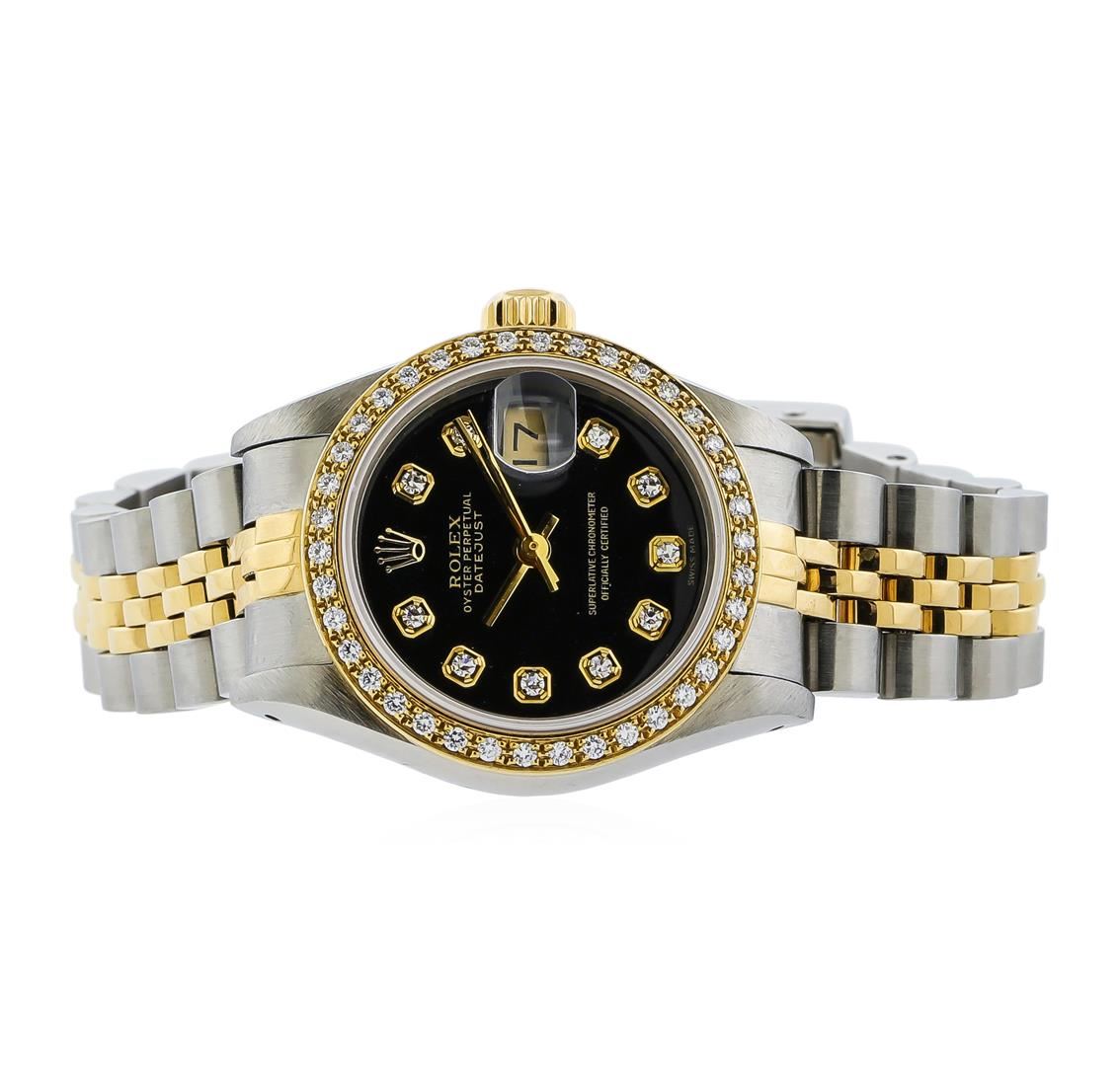 One ladies, hand crafted & machine milled Rolex DateJust Model wristwatch electronically tested, Stainless Steel Case: 26mm oyster, Rolex Signature 18KT Yellow gold Crown: twinlock with high relief logo, Custom Bezel: diamond set, Custom Crystal: synthetic sapphire cyclops lens. Circa: 1990Movement: superlative chronometer, Rolex signed Dial: Black color, with baton hands & diamond markers, Calendar: 3 o'clock position date display, Ivory color, quick set, Condition: G-5 Fine, Rolex Bracelet: stainless steel and 18KT yellow gold jubilee links. Six inch length, adjustable. Rolex Hallmarked clasp, with logo. Containing: Thirty Eight prong set round brilliant diamonds, approximate total weight of 38 stones equals 0.38ct. Set & graded in the custom bezel. Clarity: VS-1 to SI-1 Color F - H. Total Weight of Diamonds 0.38ct. Total Weight of Watch 53.21gm. AIG Appraised at $8,550.00.