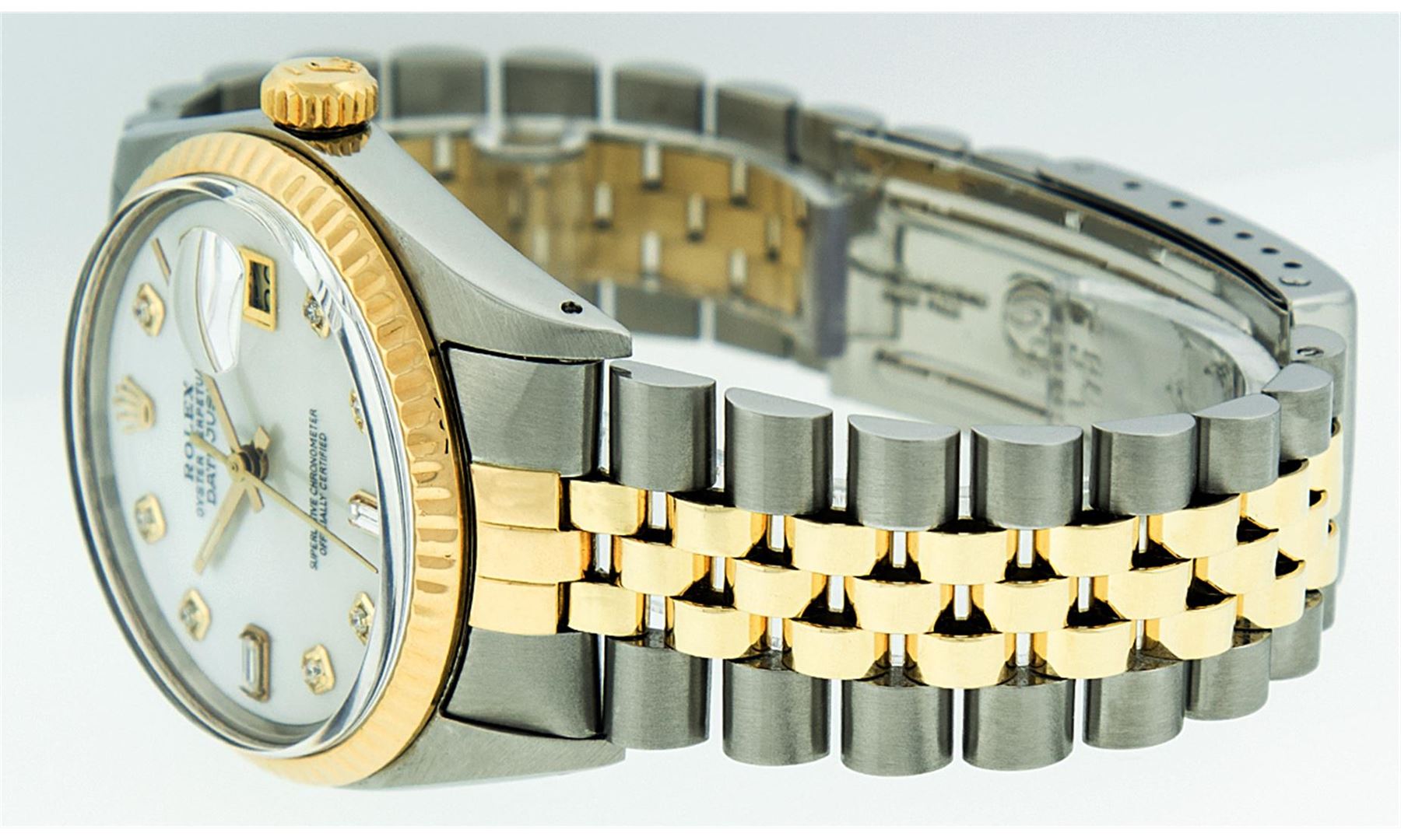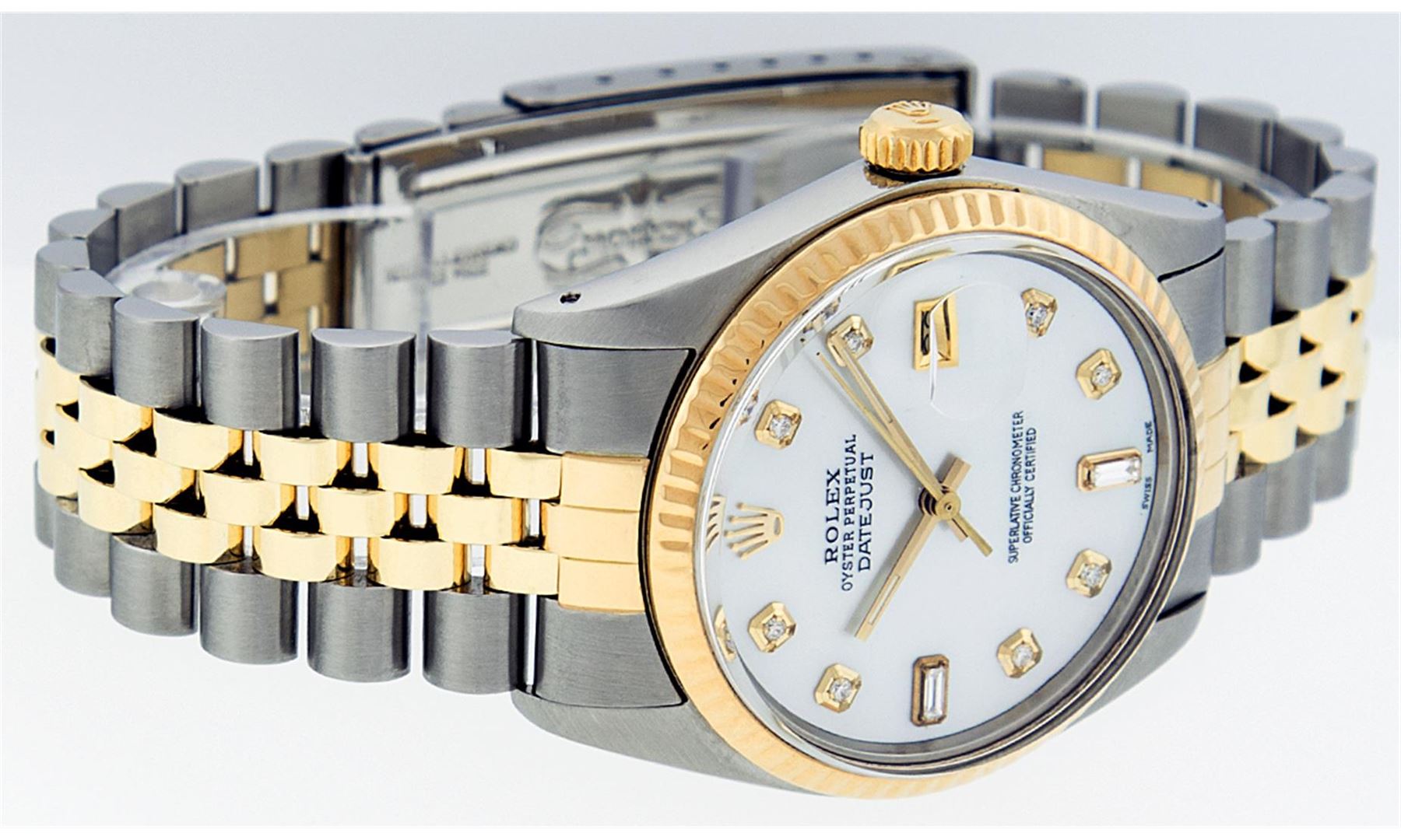 One Mens Two Tone Rolex Datejust Polished, Serviced & Electronically Tested, 14K Yellow Gold & Stainless Steel Case:36mm, 14K Yellow Gold Crown, Bezel: 14K Yellow Gold Fluted Bezel. Custom Crystal: Acrylic Cyclops Lens. Movement: Automatic Winding Movement Caliber 3035. Custom Dial: Mother Of Pearl Diamond, Diamond Count: 8 Diamonds In Dial + 2 Baguettes, Color: G to H, Clarity: SI-VS. Date Window: 3 O'Clock Position Date Display, Quickset, Model: 16013 Condition: G-6 Extra Fine. Bracelet: Two Tone 14K Yellow Gold & Stainless Steel Jubilee. Bright Polish. 7.0 Inch Length, Adjustable. Standard Clasp, With Rolex Logo.