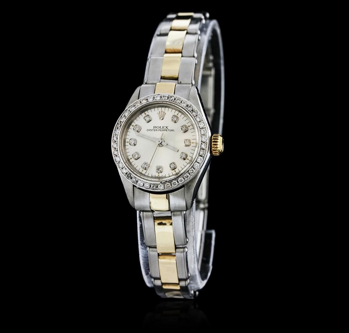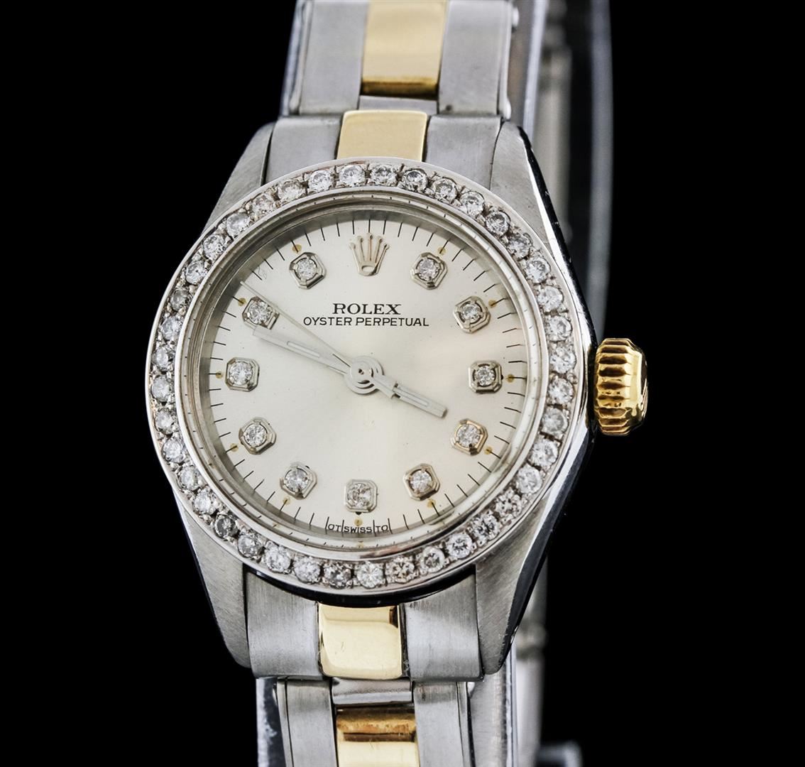 One ladies, Rolex Oyster Perpetual Model wristwatch electronically tested, Stainless Steel Case: 25mm oyster, 14KT yellow gold Crown: twinlock with logo, Custom Bezel: diamond set, Crystal: acrylic lens. Movement: mechanical stem wind, Custom Dial: Silvered, with baton hands, indices, and diamond markers. Circa: 1977, Condition: G-4 Average. Bracelet: stainless steel and 14KT yellow gold oyster. Six inch length, adjustable. Standard clasp, with logo. Containing: Forty round brilliant cut diamonds, measuring an average of 1.55mm in diameter, approximate. Total Weight of 40 Stones = 0.50ct. Set & graded in the bezel. Clarity: SI-1 to I-1. Color: G - I. Total Weight of Diamonds 0.50ct. Total Weight of Watch 38.46 grams. AIG Appraised at $5,650.00.