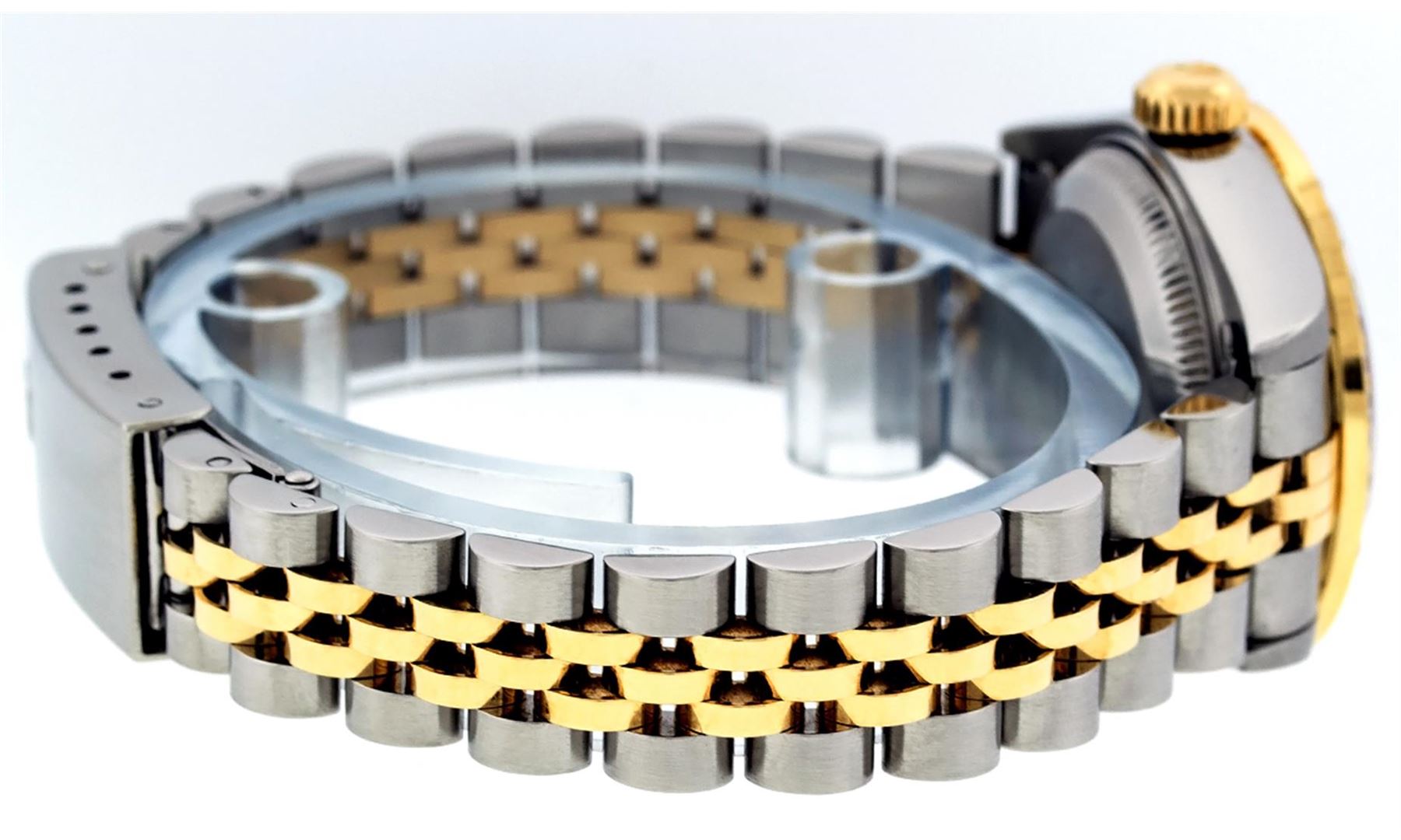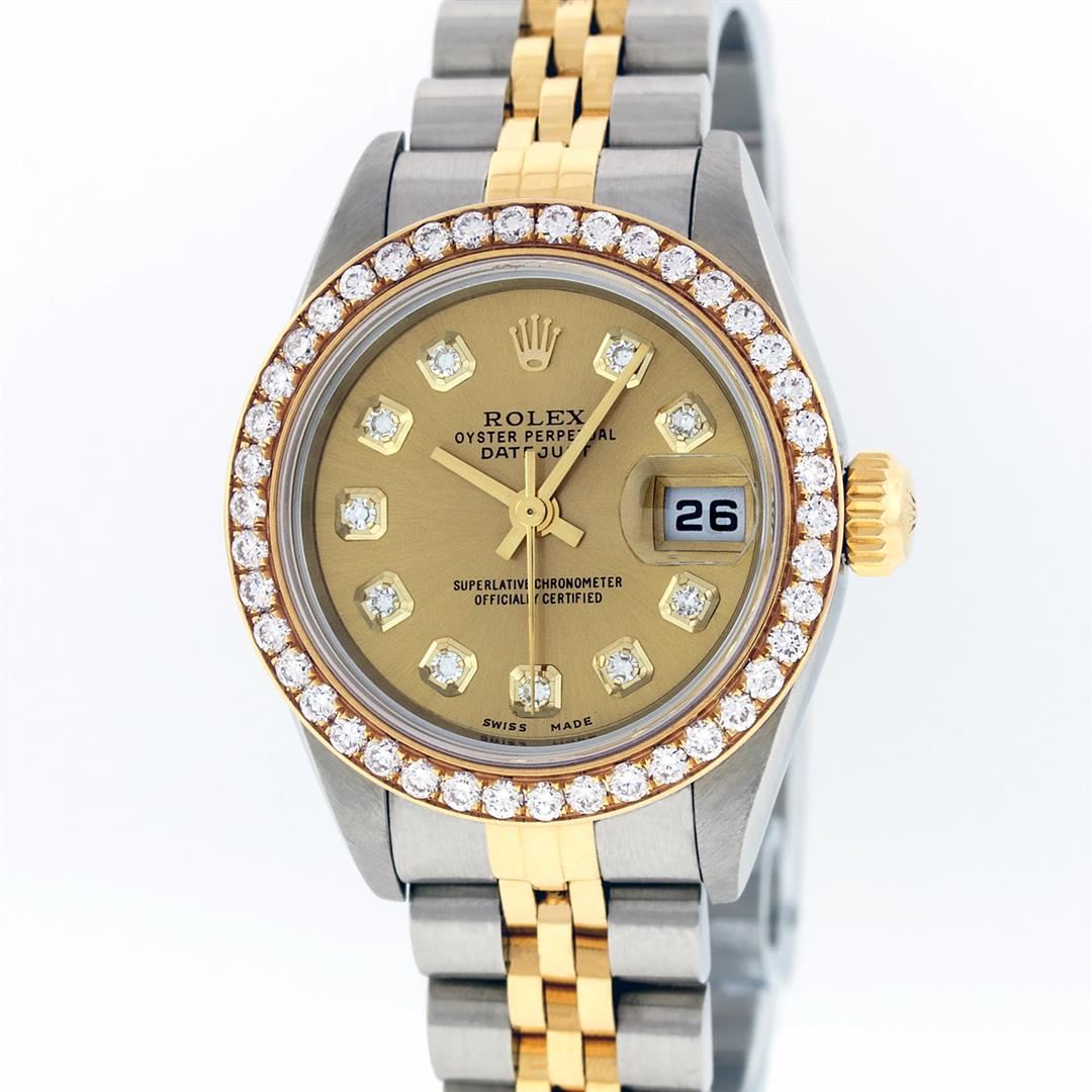 One Ladies Two Tone Rolex Datejust Polished, Serviced & Electronically Tested, 18K Yellow Gold & Stainless Steel Case No Hole Case:26mm, 18K Yellow Gold Crown, Custom Bezel: 18K Yellow 1Ct Beadset Diamond Bezel, Diamond Count: 42 Diamond, Total Weight .70 Carat, Clarity: Si-VS, Color: G to H. Crystal: Synthetic Sapphire Cyclops Lens. Movement: Automatic Winding Movement Caliber 2235. Custom Dial: Champagne Diamond Dial. Diamond Count: 10 Diamonds In Dial, Clarity: SI-VS, Color: G To H. Date Window: 3 O'Clock Position Date Display, Quickset, Model: No Hole Datejust Condition: G-6 Extra Fine The Watch Is In Very Good Condition Free Of All Scratches And Dents. Bracelet: Two Tone 18K Yellow Gold & Stainless Steel Jubilee. Bright Polish. 6.0 Inch Length, Adjustable. Standard Clasp, With Rolex Logo.