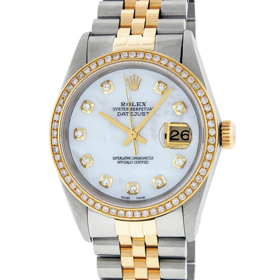 One Gents 18K Yellow Gold Two Tone Rolex Datejust Polished, Serviced & Electronically Tested, 18K Yellow Gold & Stainless Steel Case:36mm. Custom Bezel: 18K Yellow Gold Beadset Diamond Bezel, Diamond Count: 44 Diamonds. Total Weight 1.00 Carat, Clarity: Si-VS, Color: G to H. Custom Crystal: Synthetic Sapphire Cyclops Lens. Movement: Automatic Winding Movement Caliber 3135. Custom Dial: Mother Of Pearl Diamond Dial, Diamond Count: 10 Diamonds In Dial, Color: G To H, Clarity: SI-VS, Date Window: 3 O'Clock Position Date Display, Quickset, Model: 16233 Condition: G-6 Extra Fine The Watch Is In Very Good Condition Free Of All Scratches And Dents. Bracelet: Two Tone 18K Yellow Gold & Stainless Steel Jubilee Band. Bright Polish. 7.0 Inch Length, Adjustable. Standard Clasp, With Rolex Logo. Comes with 6 month warranty.