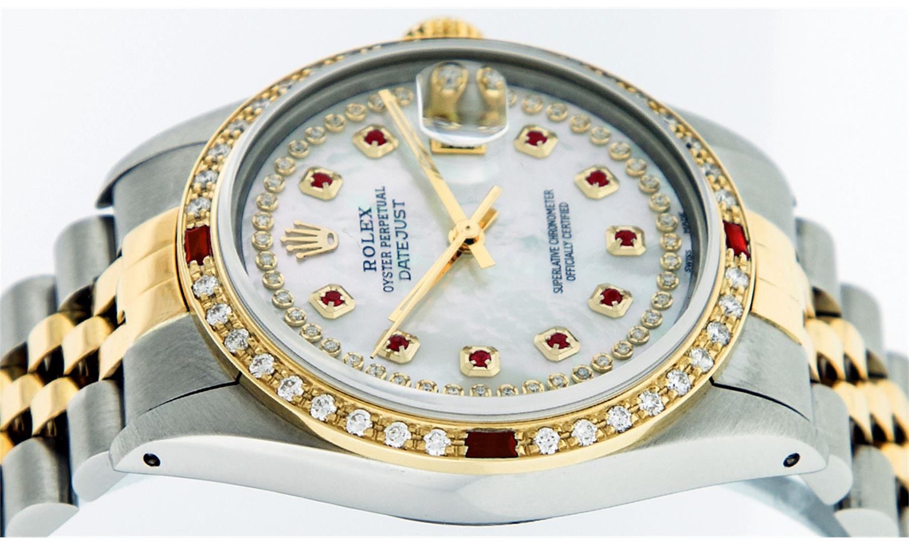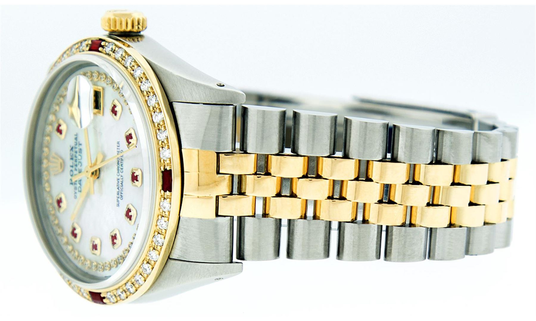 One Mens Two Tone Rolex Datejust Polished, Serviced & Electronically Tested, 14K Yellow Gold & Stainless Steel Case:36mm, 14K Yellow Gold Crown, Custom Bezel: 18K Yellow Gold Ruby Beadset Diamond Bezel, Diamond Count: 36 Diamonds + 4 Rubies Total Weight 1.00 Carat, Clarity: Si-VS, Color: G to H. Custom Crystal: Synthetic Sapphire Cyclops Lens. Movement: Automatic Winding Movement Caliber 3035. Custom Dial: Mother Of Pearl Ruby String Diamond Dial , Diamond + Gem Count: 10 Ruby + 48 Diamonds in Dial G To H In Color, SI-VS Clarity. Date Window: 3 O'Clock Position Date Display, Quickset, Model: 16013 Condition: G-6 Extra Fine. Bracelet: Two Tone 14K Yellow Gold & Stainless Steel Jubilee. Bright Polish. 7.0 Inch Length, Adjustable. Standard Clasp, With Rolex Logo. Comes with 6 month warranty.