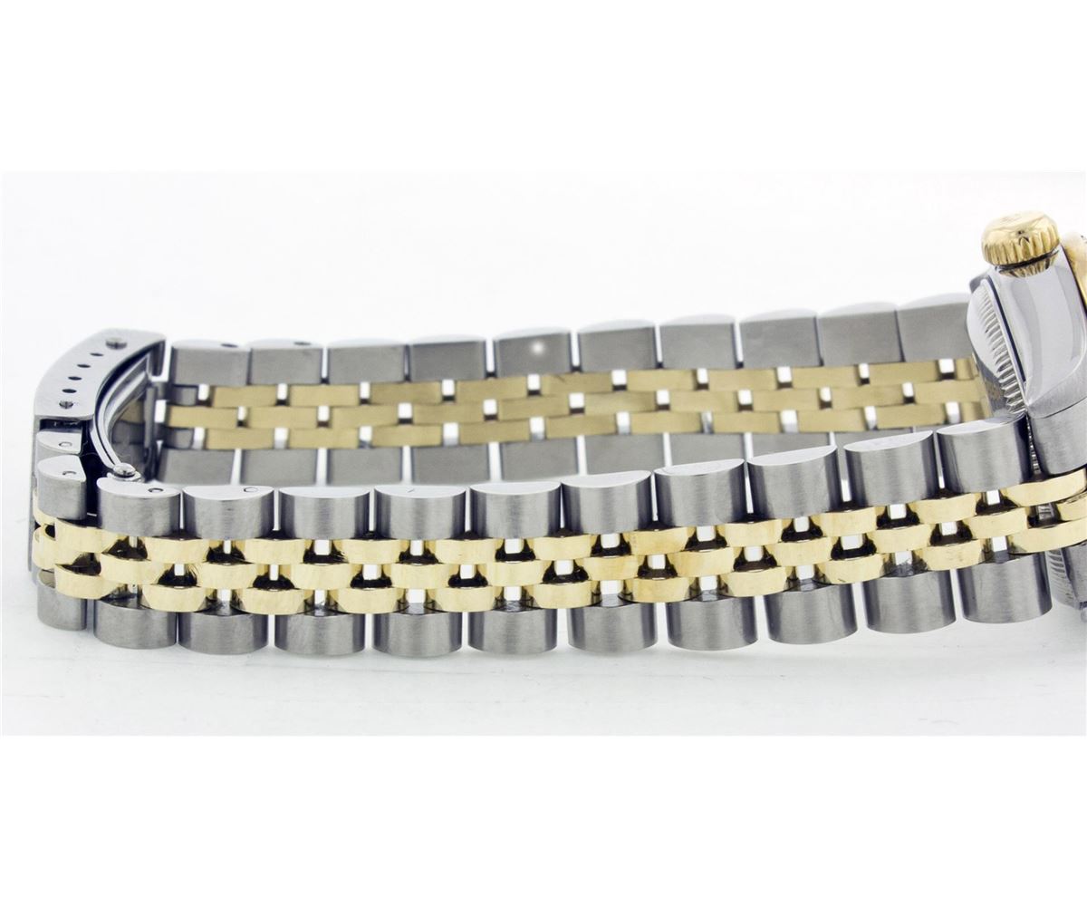 One Ladies Two Tone Rolex Datejust Polished, Serviced & Electronically Tested, 14K Yellow Gold & Stainless Steel Case:26mm, 14K Yellow Gold Crown, Custom Bezel: 18K Yellow Gold Sapphire Beadset Diamond Bezel, Diamond Count: 28 Diamonds + 4 Sapphires Total Weight .70 Carat, Clarity: Si-VS, Color: G to H. Custom Crystal: Synthetic Sapphire Cyclops Lens. Movement: Automatic Winding Movement Caliber 2030. Custom Dial: Pink Mother Of Pearl With Sapphire String Diamond Dial, Stone Count: 10 Sapphires + 33 Diamonds. Date Window: 3 O'Clock Position Date Display, Non Quickset, Model: 6917 Condition: G-6 Extra Fine. Bracelet: Two Tone 14K Yellow Gold & Stainless Steel Jubilee. Bright Polish. 5.5 Inch Length, Adjustable. Standard Clasp, With Rolex Logo.
