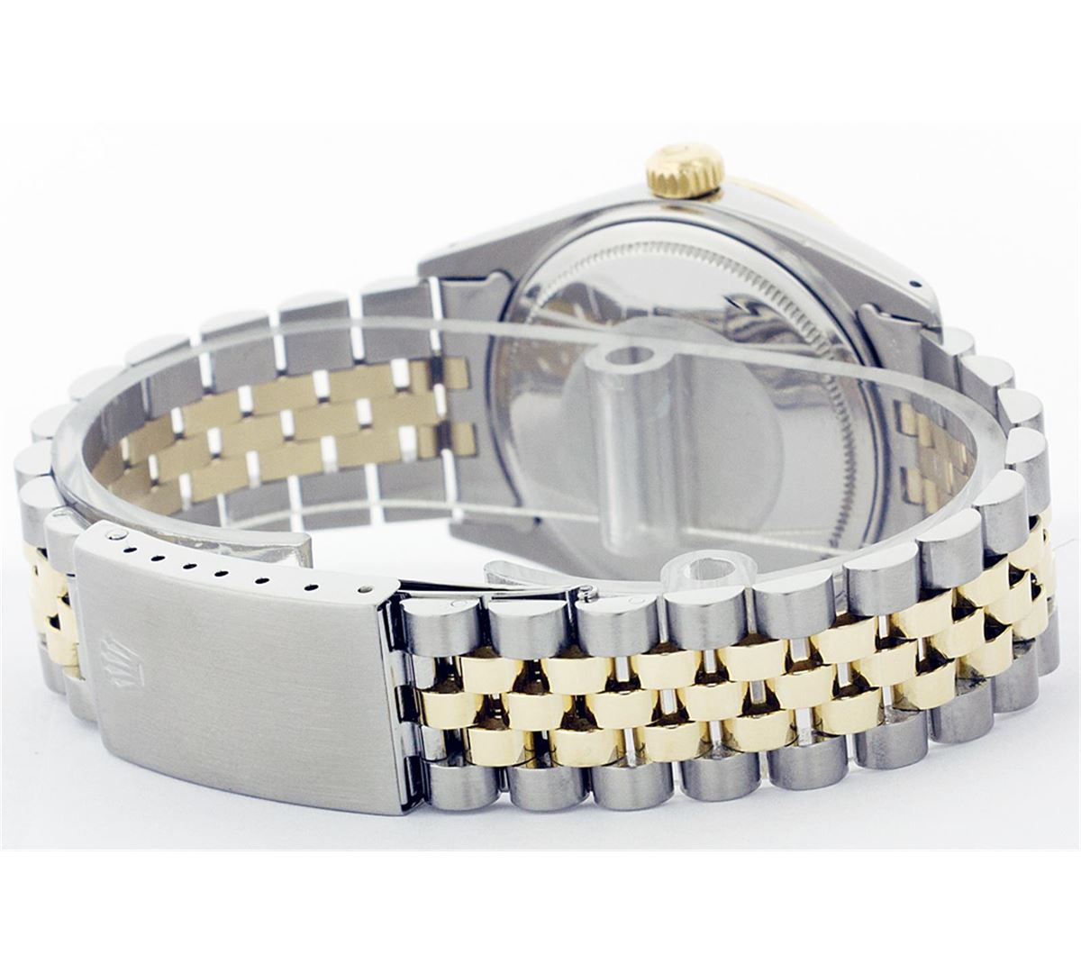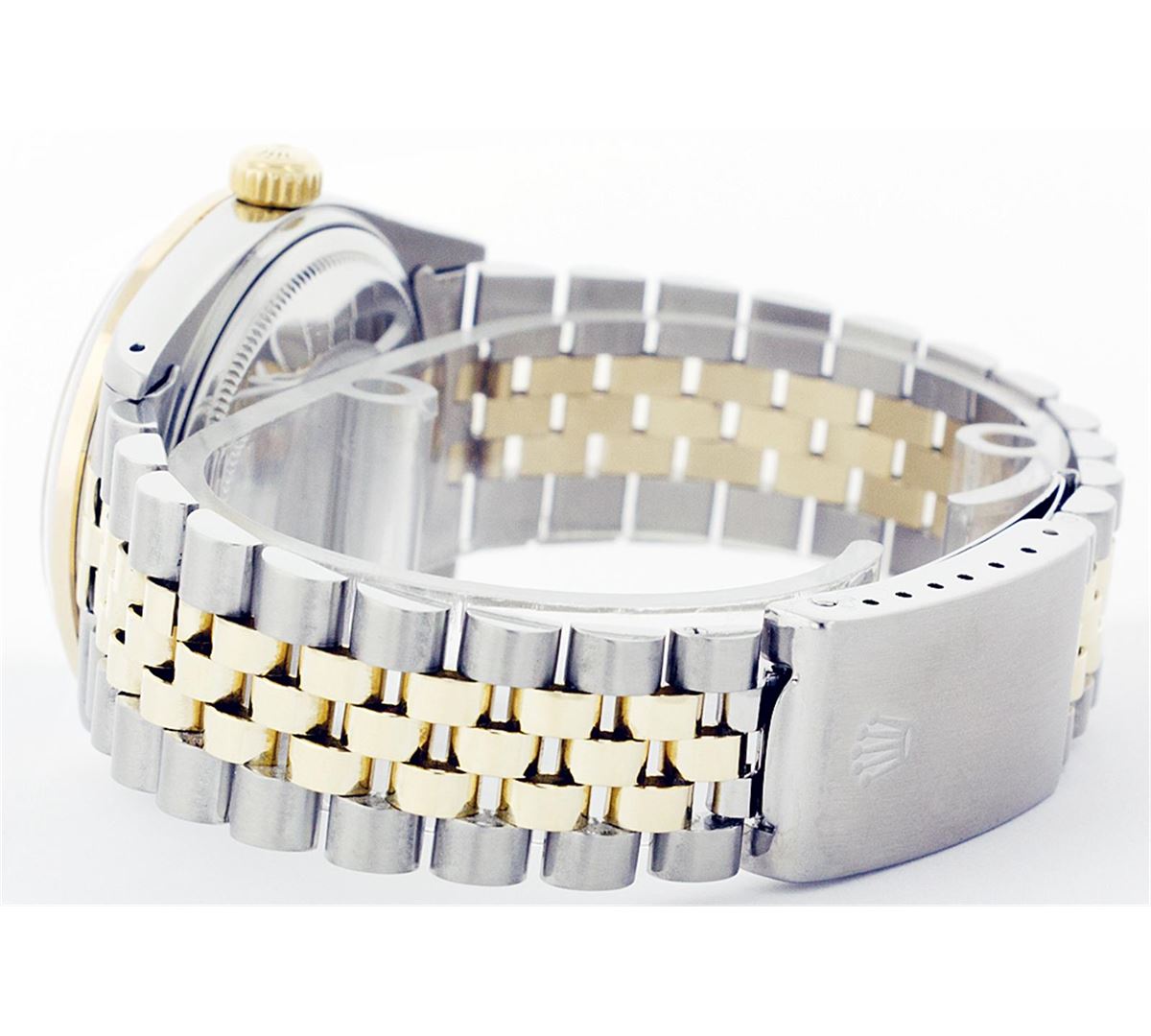 One Gents Two Tone Rolex Datejust Polished, Serviced & Electronically Tested, 14K Yellow Gold & Stainless Steel Case:36mm, 14K Yellow Gold Crown, Custom Bezel: 18K Yellow Gold Sapphire Beadset Diamond Bezel, Diamond Count: 36 Diamonds + 4 Sapphires Total Weight 1.00 Carat, Clarity: Si-VS, Color: G to H. Custom Crystal: Synthetic Sapphire Cyclops Lens. Movement: Automatic Winding Movement Caliber 3035. Custom Dial: Blue Vignette With Diamond Hour Markers. Diamond Count: 10 Diamonds Clarity: SI-VS, Color: Color G to H Date Window: 3 O'Clock Position Date Display, Quickset, Model: 16013 Condition: G-6 Extra Fine. Bracelet: Two Tone 14K Yellow Gold & Stainless Steel Jubilee. Bright Polish. 6.5 Inch Length, Adjustable. Standard Clasp, With Rolex Logo.