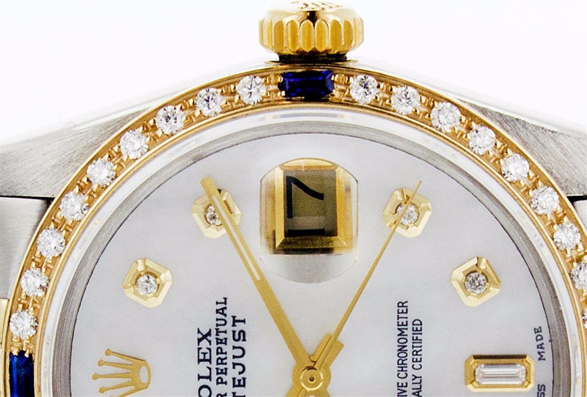 One Mens Two Tone Rolex Datejust Polished, Serviced & Electronically Tested, 14K Yellow Gold & Stainless Steel Case:36mm, 14K Yellow Gold Crown, Custom Bezel: 18K Yellow Gold Sapphire Beadset Diamond Bezel, Diamond Count:  36 Diamonds + 4 Sapphires Total Weight 1.00 Carat, Clarity: Si-VS, Color: G to H. Custom Crystal: Synthetic Sapphire Cyclops Lens. Movement: Automatic Winding Movement Caliber 3035. Custom Dial: Mother Of Pearl Dial Set  With Diamond Hour Markers and Baguette Markers On 6 and 9,  Diamond Count: 8 + 2 Baguette Diamonds in Dial G To H In Color , Date Window: 3 O'Clock Position Date Display,  Quickset, Model: 16013 Condition: G-6 Extra Fine. Bracelet: Two Tone 14K Yellow Gold & Stainless Steel Jubilee. Bright Polish.  6.5 Inch Length, Adjustable. Standard Clasp, With Rolex Logo.
