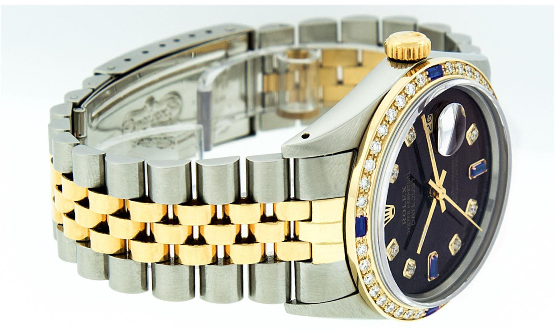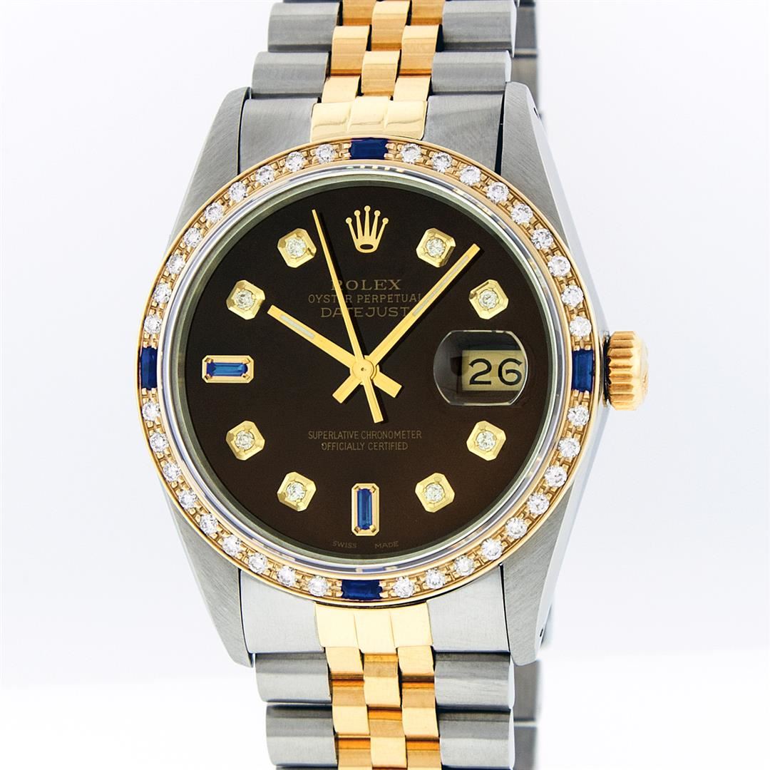 One Mens Rolex Datejust Polished Bright with Satin Finish, Serviced & Electronically Tested, Stainless Steel Case:36mm, Stainless Steel Crown, Custom Bezel: 18K Yellow Gold Sapphire Beadset Diamond Bezel, Diamond + Gem Count:36 Diamonds + 4 Sapphires, Total Weight 1.00 Carat, Clarity: SI-VS, Color: G to H. Custom Crystal: Synthetic Sapphire Cyclops Lens. Movement: Automatic Winding Movement Caliber 3035. Custom Dial: Brown Diamond With Sapphires, Diamond Count: 8 Diamond + 2 Sapphire Baguettes in Dial, Dial Color: G To H In Color, Clarity: SI-VS. Date Window: 3 O'Clock Position Date Display, Quickset, Model: 16013 Condition: G-6 Extra Fine. Bracelet: 14K Yellow Gold And Stainless Steel Jubilee. Bright Polish & Satin Finish. 7.0 Inch Length, Adjustable. Standard Clasp, With Rolex Logo. Comes with 6 month warranty.