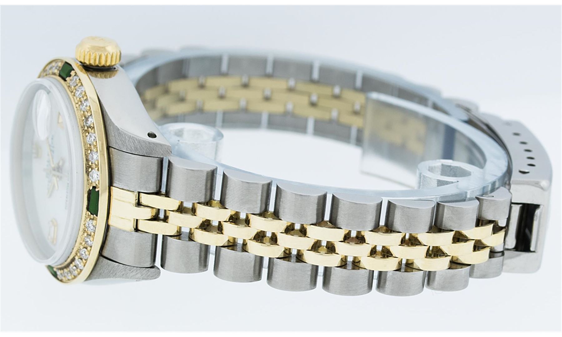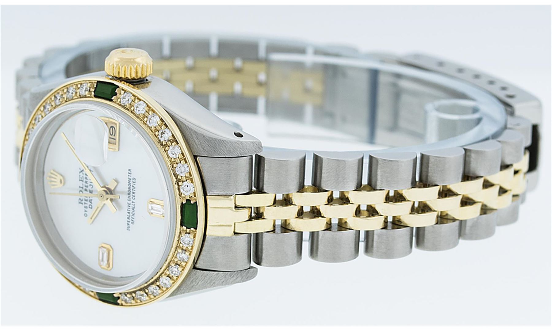 One Ladies Two Tone Rolex Datejust Polished, Serviced & Electronically Tested, 14K Yellow Gold & Stainless Steel Case:26mm, 14K Yellow Gold Crown, Custom Bezel: 18K Yellow Gold Emerald Beadset Diamond Bezel, Stone Count: 28 Diamonds + 4 Emeralds, Total Weight .70 Carat, Clarity: Si-VS, Color: G to H. Custom Crystal: Synthetic Sapphire Cyclops Lens. Movement: Automatic Winding Movement Caliber 2030. Custom Dial: Mother Of Pearl With Baguette Diamonds, Stone Count: 2 Baguette Diamonds in Dial. Date Window: 3 O'clock Position Date Display, Non Quickset, Model: Datejust, Condition: G-6 Extra Fine. Bracelet: Two Tone 14K Yellow Gold & Stainless Steel Jubilee. Bright Polish. 6.0 Inch Length, Adjustable. Standard Clasp, With Rolex Logo. Comes with 6 month warranty.