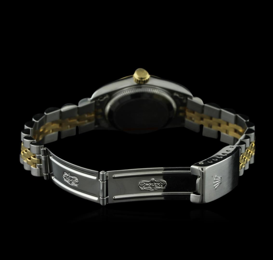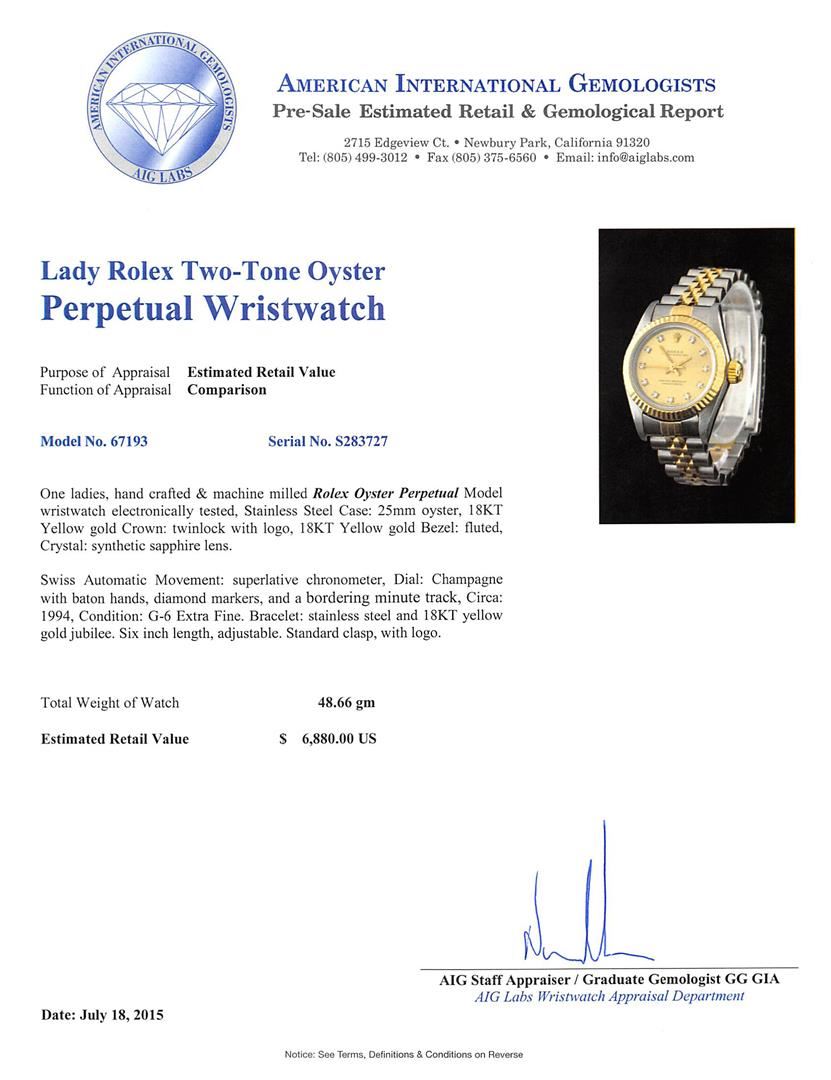 One ladies, hand crafted & machine milled Rolex Oyster Perpetual Model wristwatch electronically tested, Stainless Steel Case: 25mm oyster, 18KT Yellow gold Crown: twinlock with logo, 18KT Yellow gold Bezel: fluted, Crystal: synthetic sapphire lens. Swiss Automatic Movement: superlative chronometer, Dial: Champagne with baton hands, diamond markers, and a bordering minute track, Circa: 1994, Condition: G-6 Extra Fine. Bracelet: stainless steel and 18KT yellow gold jubilee. Six inch length, adjustable. Standard clasp, with logo. Total Weight of Watch 48.66gm. AIG Appraised at $6,880.00.