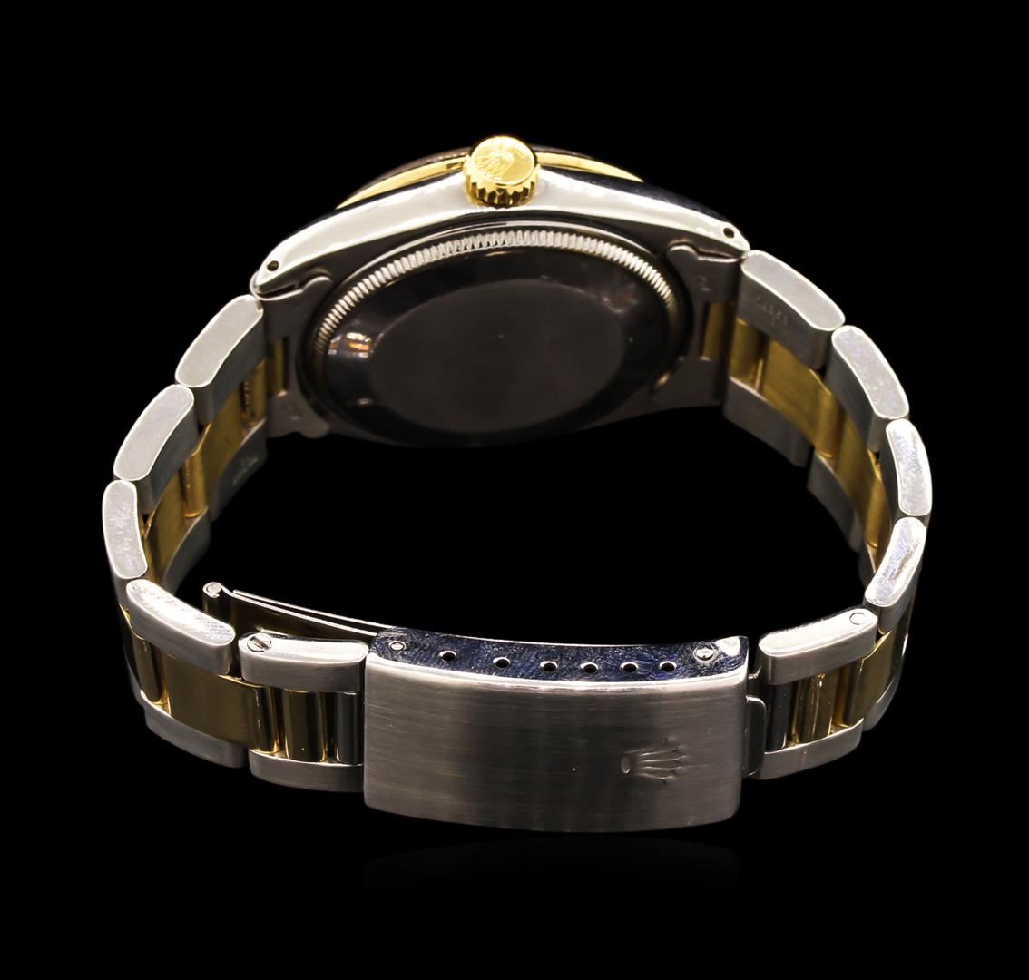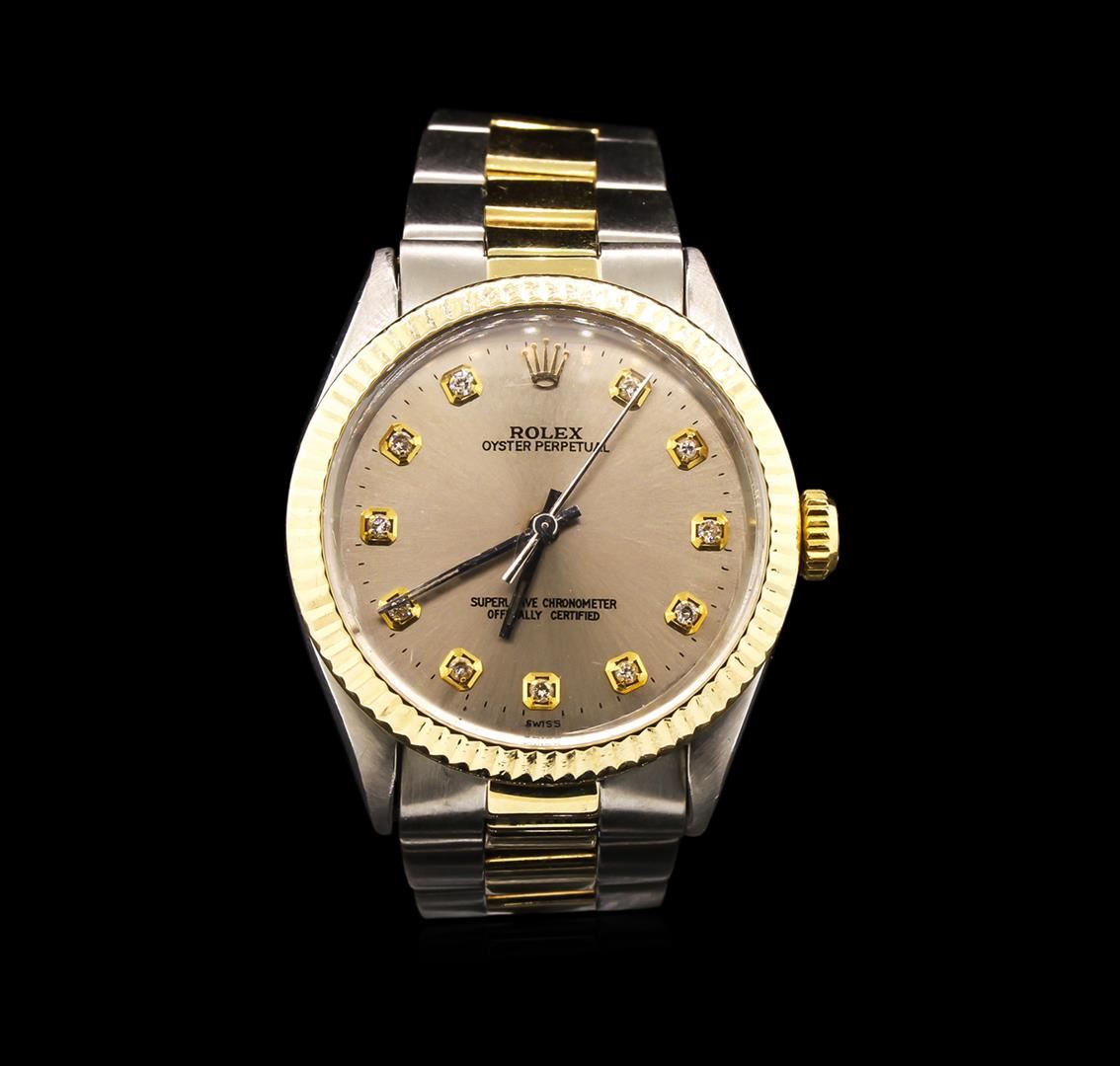 One Rolex Two-Tone Oyster Perpetual Mens Watch. Rolex men's, two-tone 14K solid gold & stainless steel, vintage, luxury watch in very nice condition. 14K Solid Gold Bezel; 14K Solid Gold Crown with Rolex Logo; Brand Stainless and Gold Bracelet; Solid Gold hands and markers; Round Stainless Steel Case; Custom Round Silver Dial with Diamond markers; Dial Type: Analog. Mechanical, Automatic Self Winding Watch; Case diameter: 34mm (without crown); Luxury Dress style. Running strong; Recently cleaned and serviced.