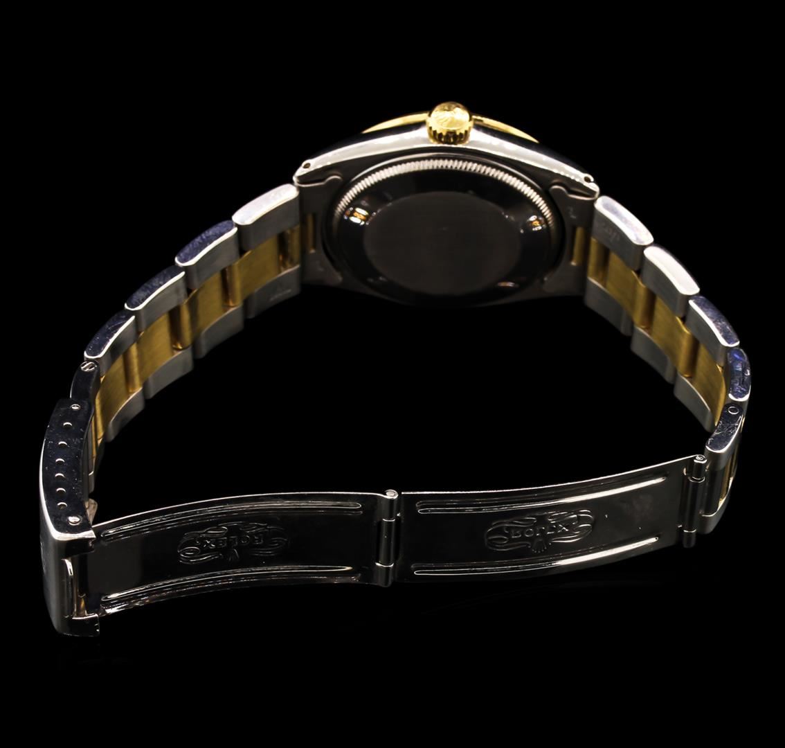 One Rolex Two-Tone Oyster Perpetual Mens Watch. Rolex men's, two-tone 14K solid gold & stainless steel, vintage, luxury watch in very nice condition. 14K Solid Gold Bezel; 14K Solid Gold Crown with Rolex Logo; Brand Stainless and Gold Bracelet; Solid Gold hands and markers; Round Stainless Steel Case; Custom Round Silver Dial with Diamond markers; Dial Type: Analog. Mechanical, Automatic Self Winding Watch; Case diameter: 34mm (without crown); Luxury Dress style. Running strong; Recently cleaned and serviced.