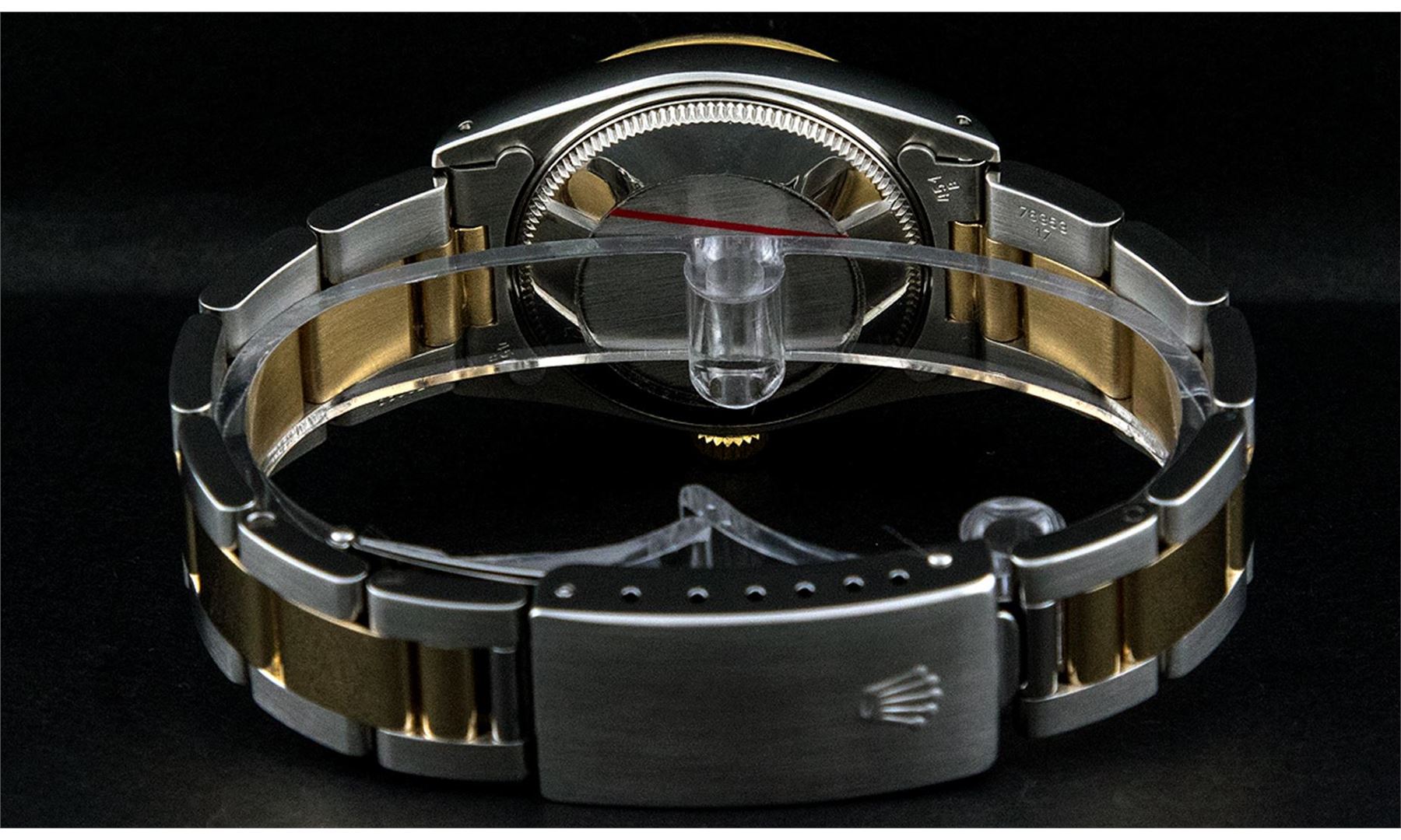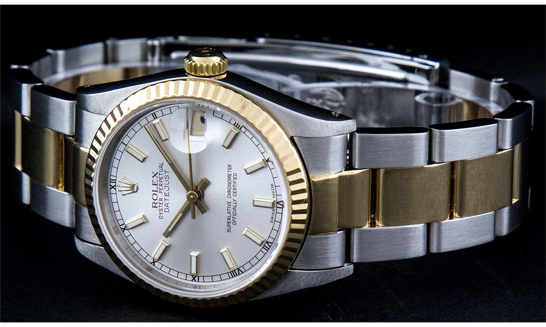 One Midsize Two Tone Rolex Datejust Polished, Serviced & Electronically Tested, Stainless Steel Case Case:31mm, Yellow Gold Crown, Bezel: Yellow Gold Fluted Bezel, Custom Crystal: Acrylic Cyclops Lens. Movement: Automatic Winding Movement Caliber 2135. Dial: Silver Index With Square Track. Date Window: 3 O'Clock Position Date Display, Quickset, Model: Midsize Datejust. Condition: G-6 Extra Fine. Bracelet: Two Tone Oyster Band. Bright Polish. 6.0 Inch Length, Adjustable. Standard Clasp, With Rolex Logo.
