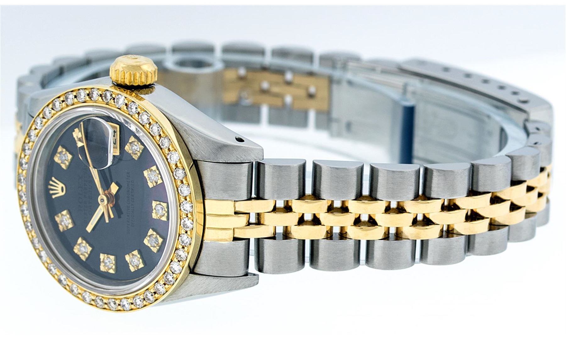 One Ladies Two Tone Rolex Datejust Polished, Serviced & Electronically Tested, 14K Yellow Gold & Stainless Steel Case:26mm, 14K Yellow Gold Crown, Custom Bezel: 18K Yellow Gold Beadset Diamond Bezel, Stone Count: 32 Diamonds, Total Weight .70 Carat, Clarity: Si-VS, Color: G to H. Custom Crystal: Synthetic Sapphire Cyclops Lens. Movement: Automatic Winding Movement Caliber 2030. Custom Dial: Tahitian Mother Of Pearl Diamond Dial VVS, Stone Count: 10 Diamonds in Dial, Color: G to H, Clarity: VVS. Date Window: 3 O'Clock Position Date Display, Model: Datejust, Condition: G-6 Extra Fine. Bracelet: Two Tone 14K Yellow Gold & Stainless Steel Jubilee. Bright Polish. 5.5 Inch Length, Adjustable. Standard Clasp, With Rolex Logo. Comes with a 6 month warranty card.