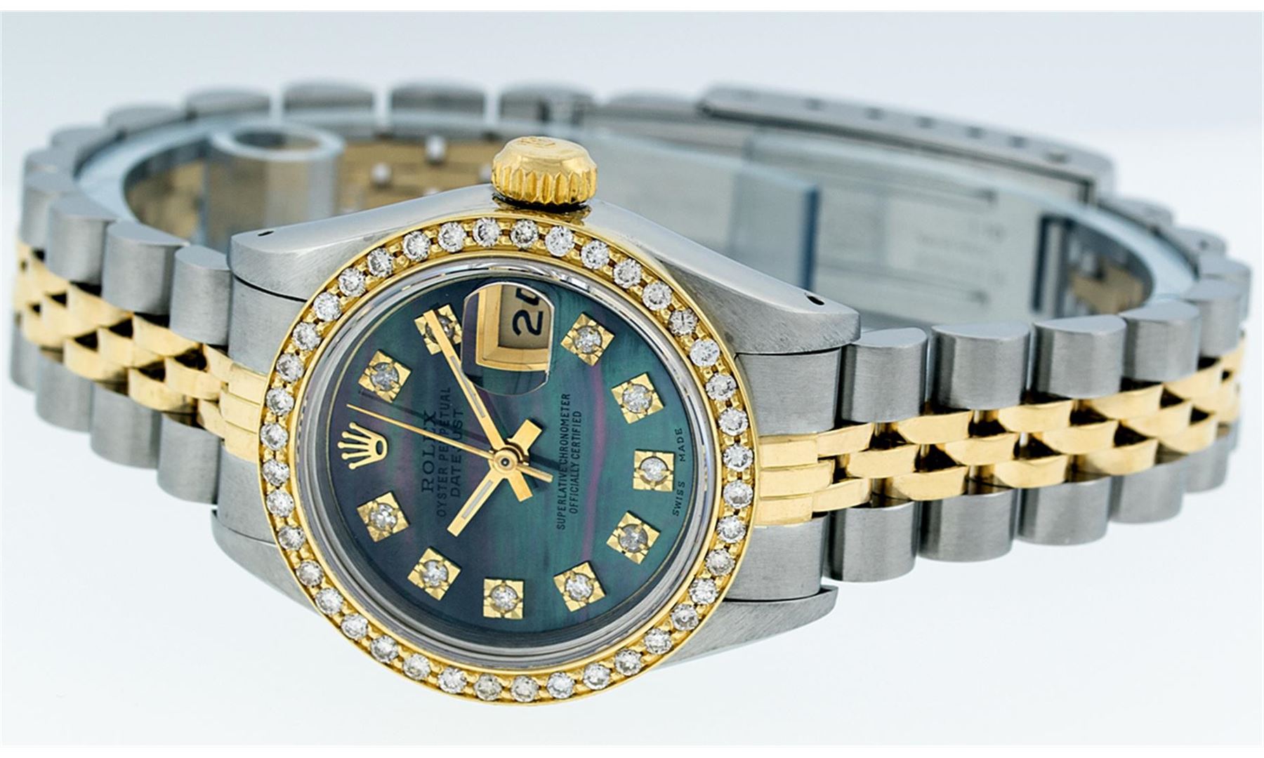 One Ladies Two Tone Rolex Datejust Polished, Serviced & Electronically Tested, 14K Yellow Gold & Stainless Steel Case:26mm, 14K Yellow Gold Crown, Custom Bezel: 18K Yellow Gold Beadset Diamond Bezel, Stone Count: 32 Diamonds, Total Weight .70 Carat, Clarity: Si-VS, Color: G to H. Custom Crystal: Synthetic Sapphire Cyclops Lens. Movement: Automatic Winding Movement Caliber 2030. Custom Dial: Tahitian Mother Of Pearl Diamond Dial VVS, Stone Count: 10 Diamonds in Dial, Color: G to H, Clarity: VVS. Date Window: 3 O'Clock Position Date Display, Model: Datejust, Condition: G-6 Extra Fine. Bracelet: Two Tone 14K Yellow Gold & Stainless Steel Jubilee. Bright Polish. 5.5 Inch Length, Adjustable. Standard Clasp, With Rolex Logo. Comes with a 6 month warranty card.