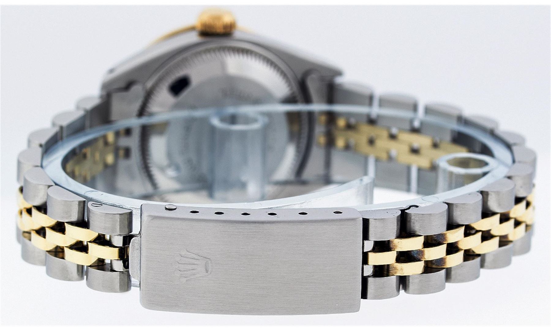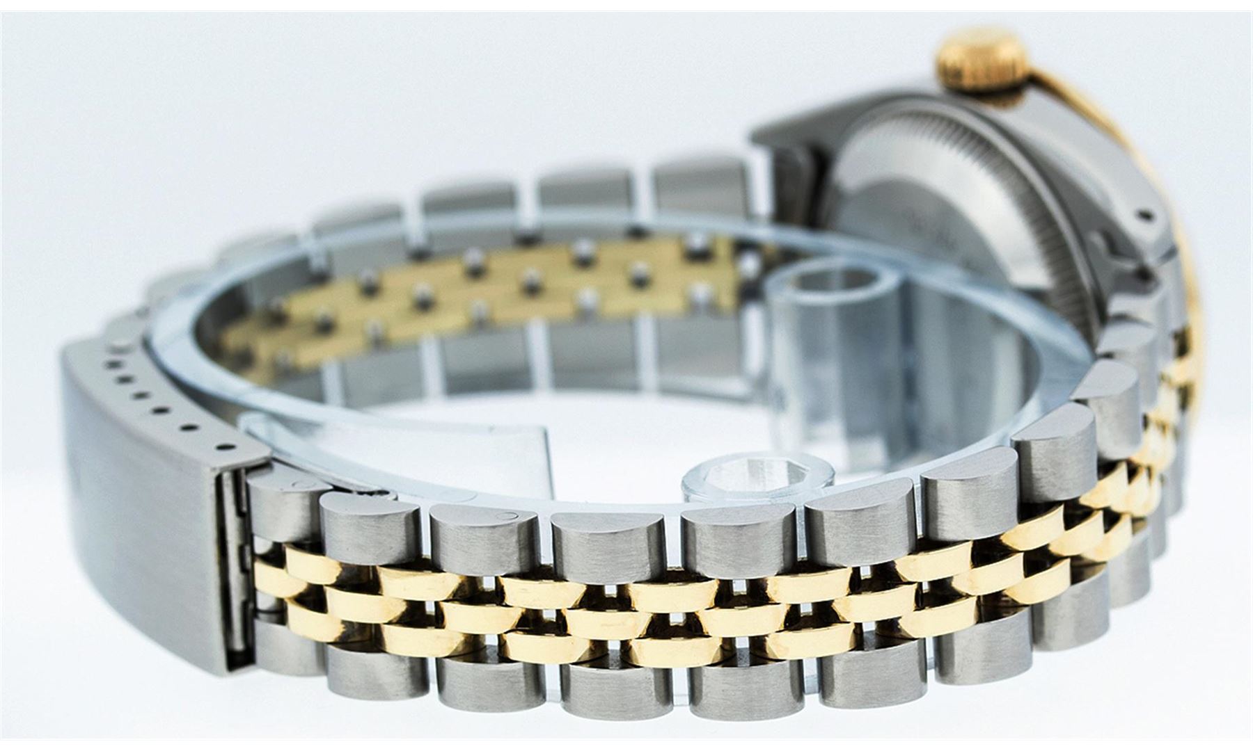 One Ladies Two Tone Rolex Datejust Polished, Serviced & Electronically Tested, 14K Yellow Gold & Stainless Steel Case:26mm, 14K Yellow Gold Crown, Custom Bezel: 18K Yellow Gold Beadset Diamond Bezel, Stone Count: 32 Diamonds, Total Weight .70 Carat, Clarity: Si-VS, Color: G to H. Custom Crystal: Synthetic Sapphire Cyclops Lens. Movement: Automatic Winding Movement Caliber 2030. Custom Dial: Tahitian Mother Of Pearl Diamond Dial VVS, Stone Count: 10 Diamonds in Dial, Color: G to H, Clarity: VVS. Date Window: 3 O'Clock Position Date Display, Model: Datejust, Condition: G-6 Extra Fine. Bracelet: Two Tone 14K Yellow Gold & Stainless Steel Jubilee. Bright Polish. 5.5 Inch Length, Adjustable. Standard Clasp, With Rolex Logo. Comes with a 6 month warranty card.
