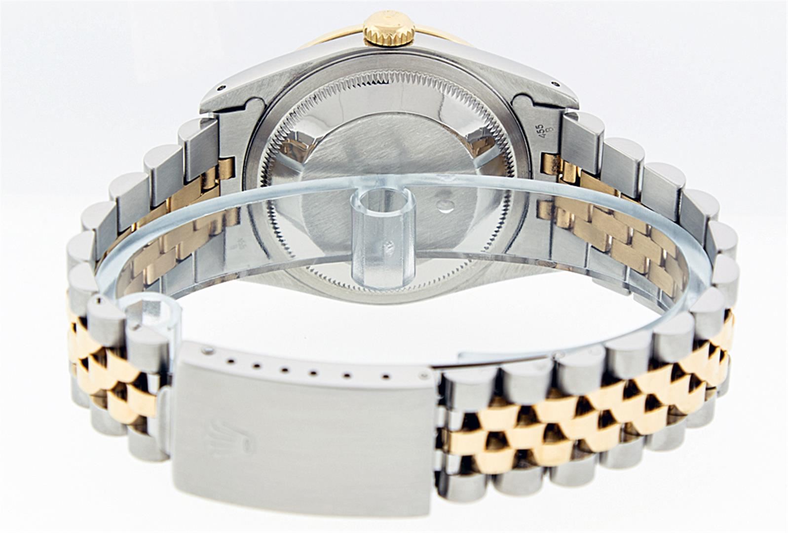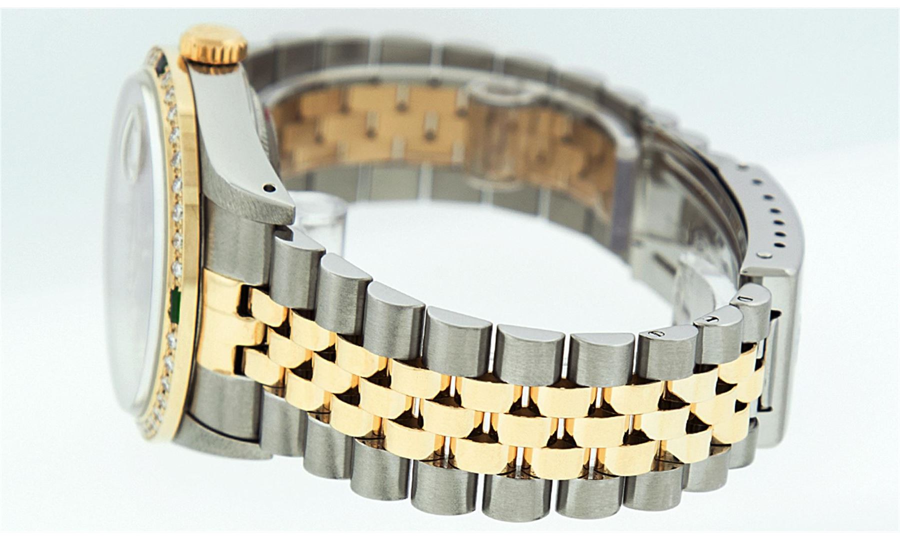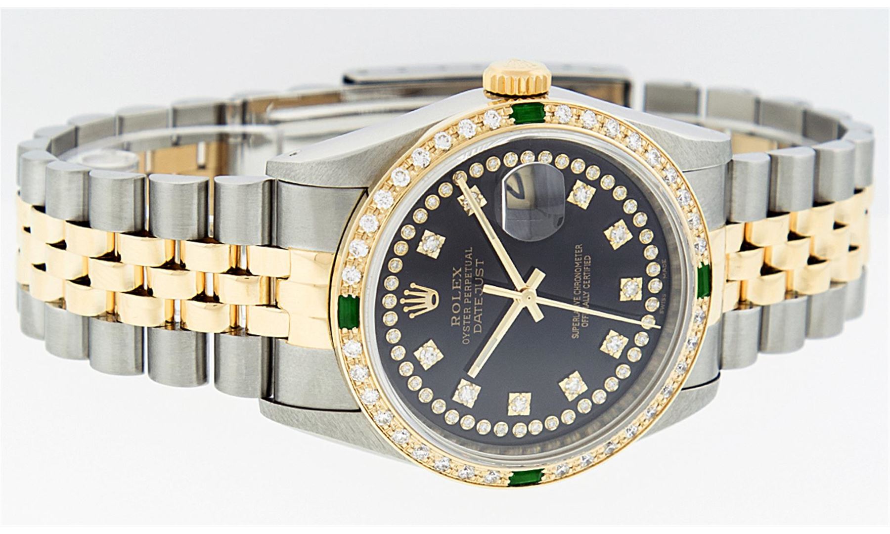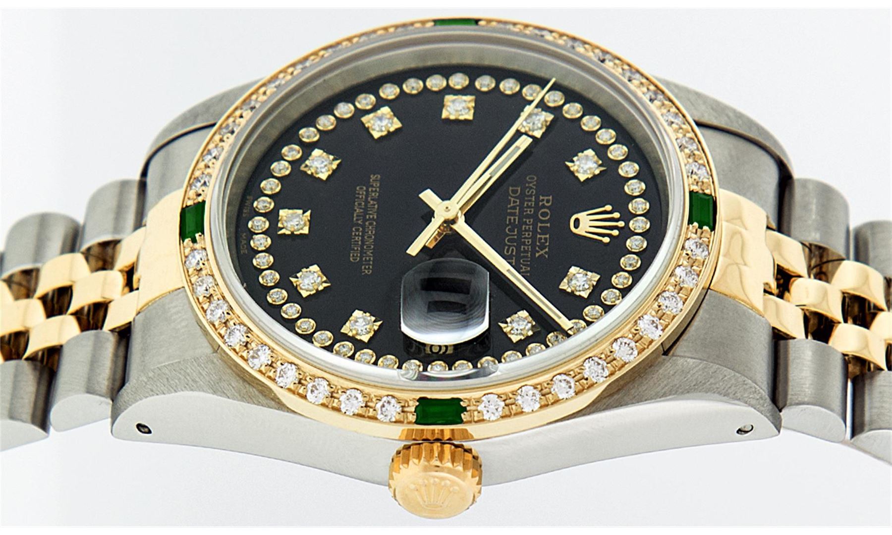 One Mens Two Tone Rolex Datejust Polished, Serviced & Electronically Tested, 14K Yellow Gold & Stainless Steel Case:36mm, 14K Yellow Gold Crown, Custom Bezel: 18K Yellow Gold Emerald Beadset Diamond Bezel, Diamond Count: 36 Diamonds + 4 Emeralds, Total Weight 1.00 Carat, Clarity: SI-VS, Color: G to H. Custom Crystal: Synthetic Sapphire Cyclops Lens. Movement: Automatic Winding Movement Caliber 3035. Custom Dial: Black String Diamond Dial VVS , Diamond Count: 58 Diamonds in Dial G To H In Color, VVS Clarity. Date Window: 3 O'Clock Position Date Display, Quickset, Model: 16013 Condition: G-6 Extra Fine. Bracelet: Two Tone 14K Yellow Gold & Stainless Steel Jubilee. Bright Polish. 7.0 Inch Length, Adjustable. Standard Clasp, With Rolex Logo. Comes with 6 month warranty.