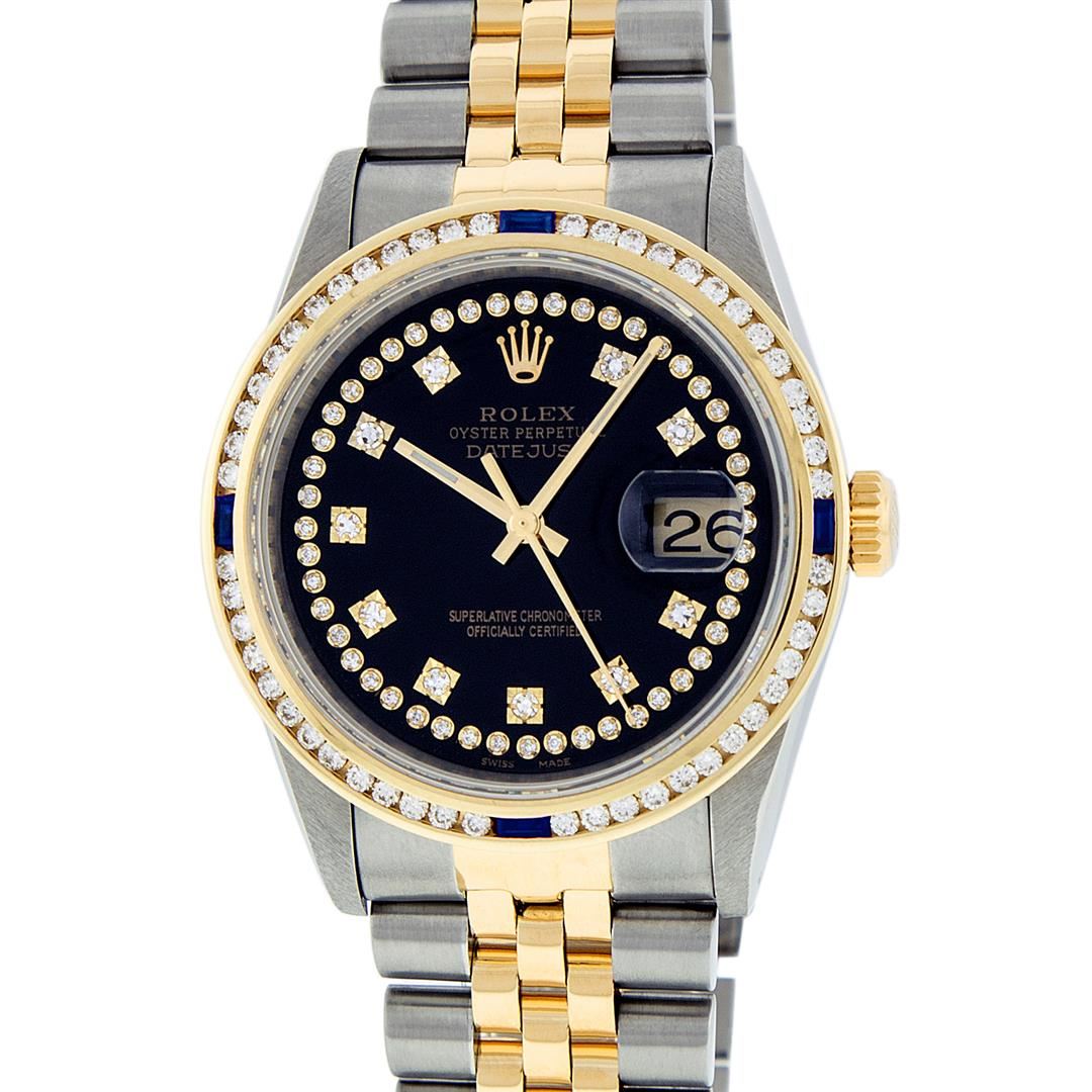 One Mens Two Tone Rolex Datejust Polished, Serviced & Electronically Tested, 14K Yellow Gold & Stainless Steel Case:36mm, 14K Yellow Gold Crown, Custom Bezel: 18K Yellow Gold Sapphire Channel Set Diamond Bezel, Diamond Count: 52 Diamonds + 4 Sapphire, Total Weight 1.30 Carat, Clarity: SI-VS, Color: G to H. Custom Crystal: Synthetic Sapphire Cyclops Lens. Movement: Automatic Winding Movement Caliber 3035. Custom Dial: Black String Diamond Dial VVS , Diamond Count: 58 Diamonds in Dial G To H In Color, VVS Clarity. Date Window: 3 O'Clock Position Date Display, Quickset, Model: 16013 Condition: G-6 Extra Fine. Bracelet: Two Tone 14K Yellow Gold & Stainless Steel Jubilee. Bright Polish. 7.0 Inch Length, Adjustable. Standard Clasp, With Rolex Logo. Comes with 6 month warranty.