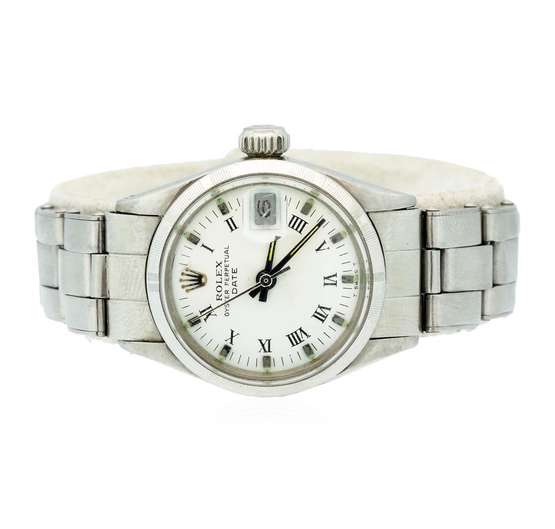 One ladies hand crafted & machine milled vintage Rolex Date Model Stainless Steel wristwatch electronically tested, Case: 25mm oyster, Rolex Signature Crown: scalloped twinlock with high relief logo, Bezel: engine turned, Custom Crystal: acrylic cyclops lens.Movement: mechanical, stem wind, Rolex signed Dial: White color, with baton hands, and Roman numerals, Date Window: 3 o'clock position non-quick set, Circa: 1965, Condition: G-5 Fine. Bracelet: stainless steel tapering oyster. Six and one quarter inch length, adjustable. Rolex signed clasp, with logo.Total Weight of Watch 36.76gm. AIG Appraised at $3,300.00.