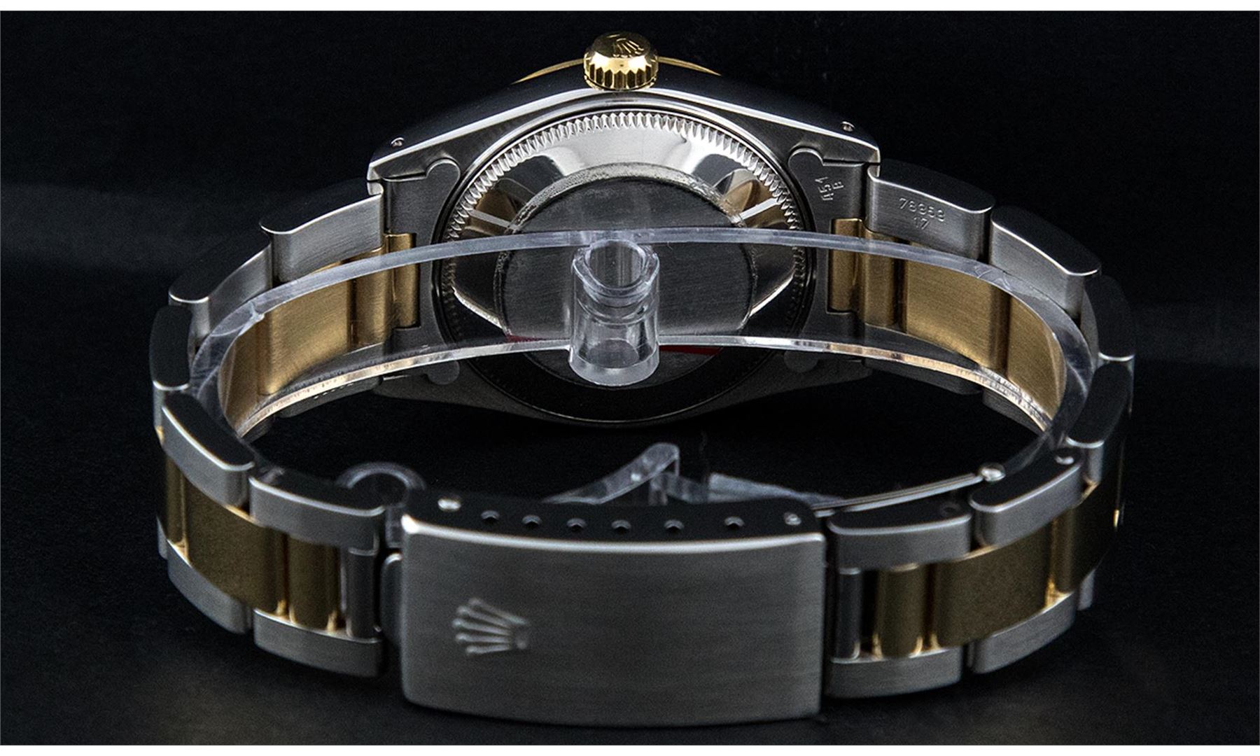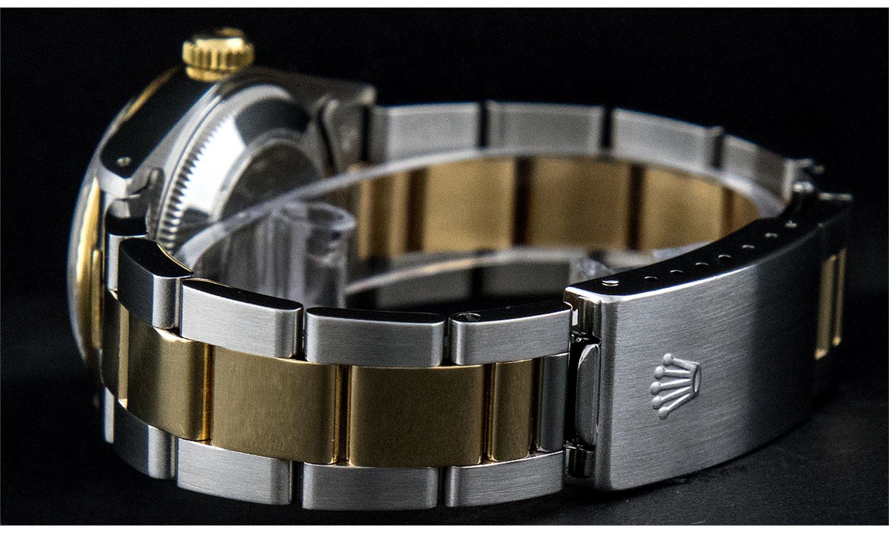One Women's Midsize Yellow Gold And Stainless Steel Rolex Datejust Polished, Serviced & Electronically Tested, Rolex Yellow Gold And Stainless Steel Case Case: 31mm, Rolex Stainless Steel Crown, Rolex Bezel: Rolex Yellow Gold Fluted Bezel, Color: G To H, Clarity: VS2-SI1. Custom Crystal: New Scratch Resistant Synthetic Sapphire Cyclops Lens. Custom Hands: New Luminecent Hands. Rolex Movement: Automatic Winding Movement Caliber 2135. Rolex Dial: Silver Index Dial With Roman Track, Date Window: 3 O'Clock Position Date Display, Quickset, Model: Midsize Datejust. Condition: G-6 Extra Fine. Rolex Bracelet: Stainless Steel and Yellow Gold Oyster Band. Bright Polish. 6.0 Inch Length, Adjustable. Standard Clasp, With Rolex Logo. This Pre Owned Watch Has Been Serviced Time Tested And Is In Excellent Condition It Is Free Of All Scratches And Dents.