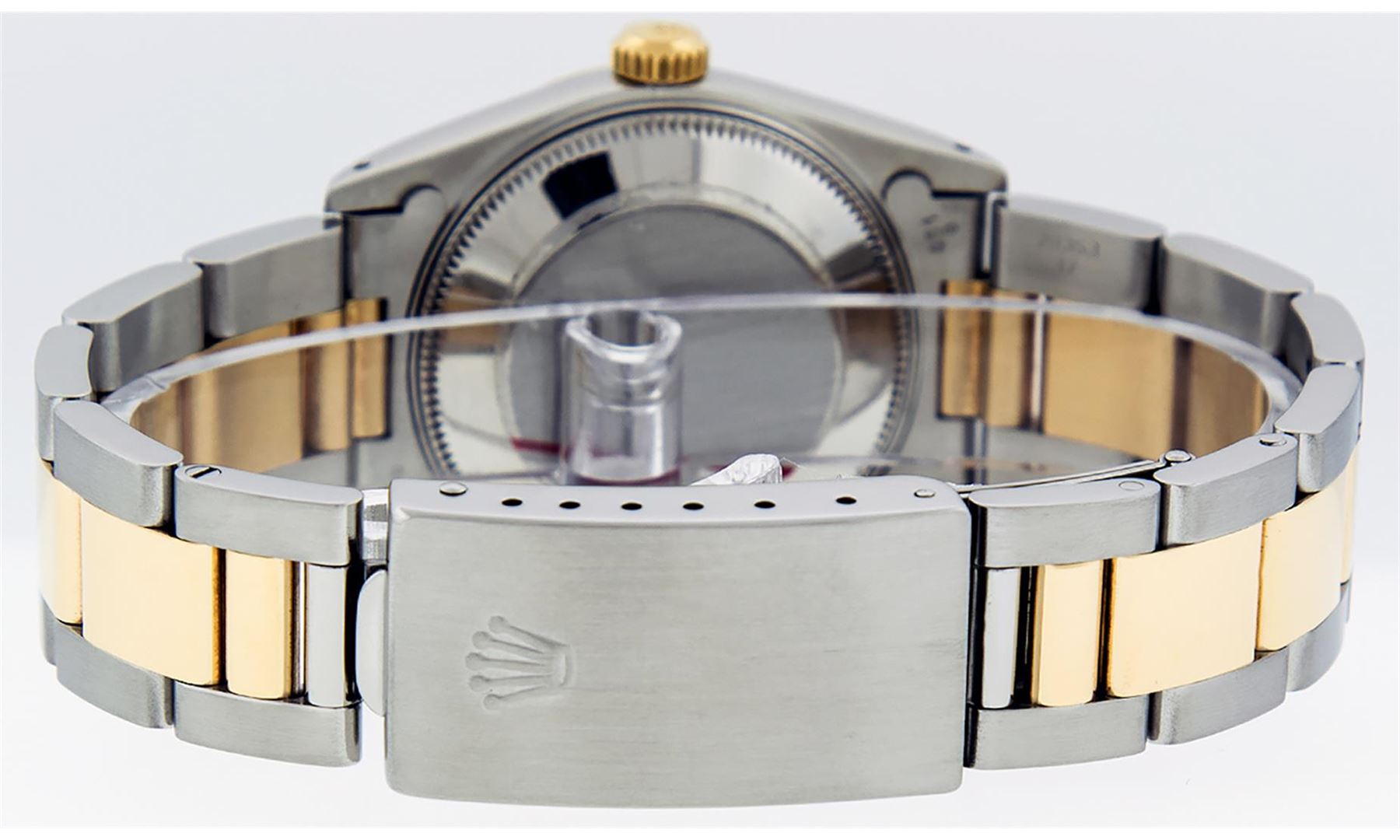 One Women's Midsize Yellow Gold And Stainless Steel Rolex Datejust Polished, Serviced & Electronically Tested, Rolex Yellow Gold And Stainless Steel Case Case: 31mm, Rolex Stainless Steel Crown, Rolex Bezel: Rolex Yellow Gold Fluted Bezel, Color: G To H, Clarity: VS2-SI1. Custom Crystal: New Scratch Resistant Synthetic Sapphire Cyclops Lens. Custom Hands: New Luminecent Hands. Rolex Movement: Automatic Winding Movement Caliber 2135. Rolex Dial: Silver Index Dial With Roman Track, Date Window: 3 O'Clock Position Date Display, Quickset, Model: Midsize Datejust. Condition: G-6 Extra Fine. Rolex Bracelet: Stainless Steel and Yellow Gold Oyster Band. Bright Polish. 6.0 Inch Length, Adjustable. Standard Clasp, With Rolex Logo. This Pre Owned Watch Has Been Serviced Time Tested And Is In Excellent Condition It Is Free Of All Scratches And Dents.