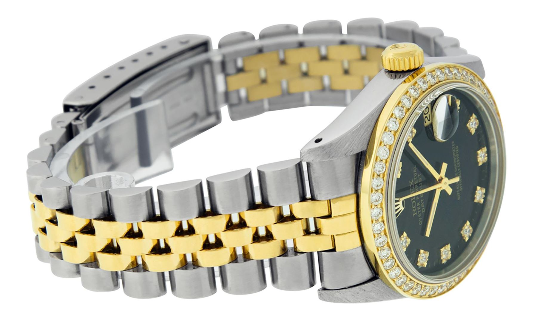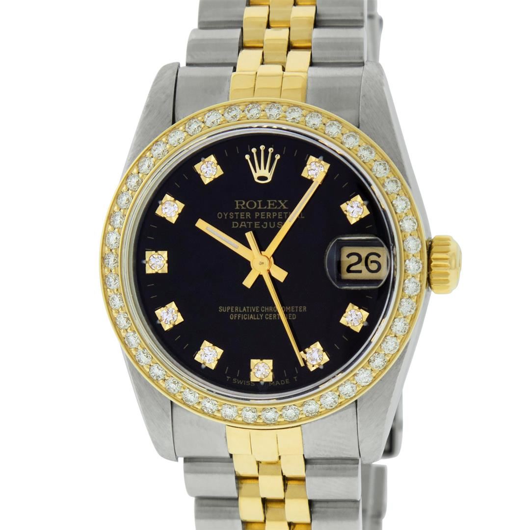 One Womens Pre Owned Midsize Stainless Steel and Yellow Gold Rolex Datejust Polished, Serviced & Electronically Tested, Stainless Steel Case Case: 31mm, Stainless Steel Crown, Custom Bezel: New 18K Yellow Gold Beadset Diamond Bezel, Diamond Count: 44 Diamonds On Bezel. Custom Crystal: New Sapphire With Magnified Date Window. Custom Hands: New Luminescent Hands. Rolex Movement: Automatic Winding Movement Caliber 2135. Custom Dial: Black With Custom Added Diamond Hour Markers. Diamond Count: 10 Diamonds On Dial. Date Window: 3 O'Clock Position Date Display, Quickset, Model: Midsize Datejust. Condition: G-6 Extra Fine. Rolex Bracelet: Stainless Steel and Yellow Gold Jubilee Band. Bright Polish. 6.0 Inch Length, Adjustable. Standard Clasp, With Rolex Logo. This Watch Has Been Serviced Time Tested And Is In Excellent Condition It Is Free Of All Scratches And Dents.