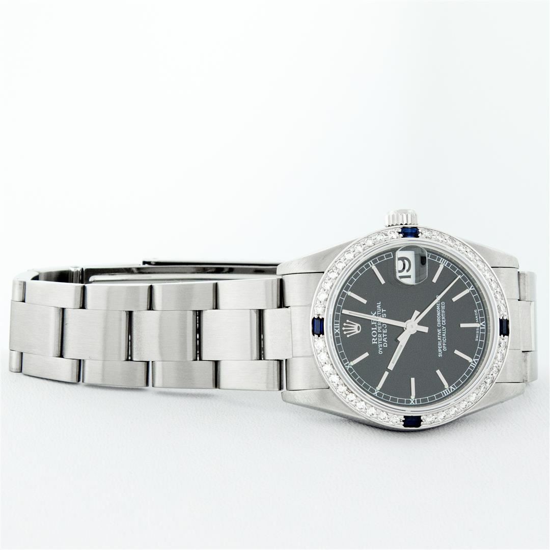 One Women's Pre Owned Midsize Stainless Steel Rolex Datejust Polished, Serviced & Electronically Tested, Rolex Stainless Steel Case Case: 31mm, Rolex Stainless Steel Crown, Custom Bezel: New 18K White Gold Sapphire Beadset Diamond Bezel, Diamond Count: 40 Diamonds + 4 Sapphires On Bezel, Color: G To H, Clarity: VS2-SI1. Custom Crystal: New Scratch Resistant Synthetic Sapphire Cyclops Lens. Custom Hands: New Luminescent Hands. Rolex Movement: Automatic Winding Movement. Rolex Dial: Black Index Dial, Date Window: 3 O'Clock Position Date Display, Quickset, Model: Midsize Datejust. Condition: G-6 Extra Fine. Rolex Bracelet: Stainless Steel Oyster Band. Bright Polish. 6.0 Inch Length, Adjustable. Standard Clasp, With Rolex Logo. This Watch Has Been Serviced Time Tested And Is In Excellent Condition It Is Free Of All Scratches And Dents.
