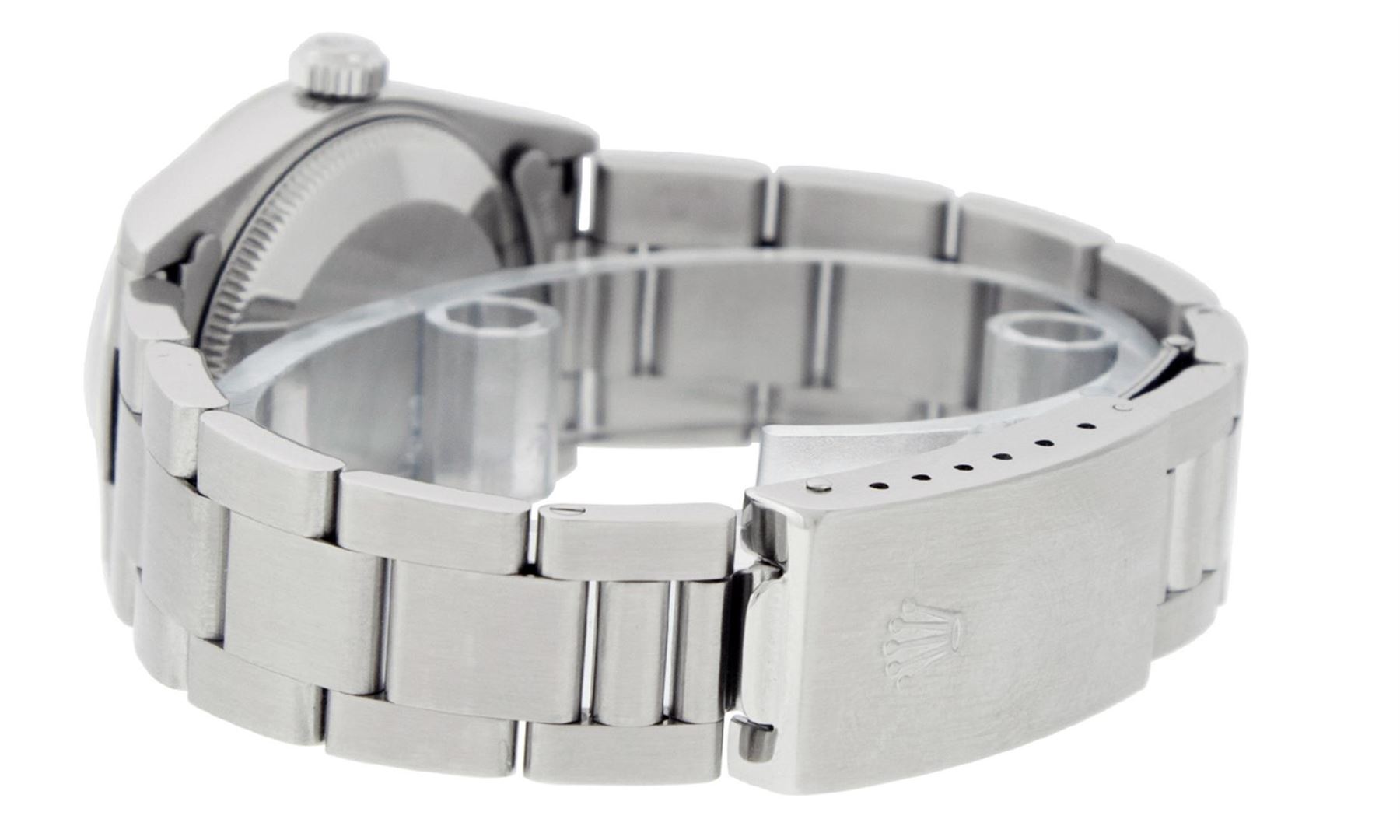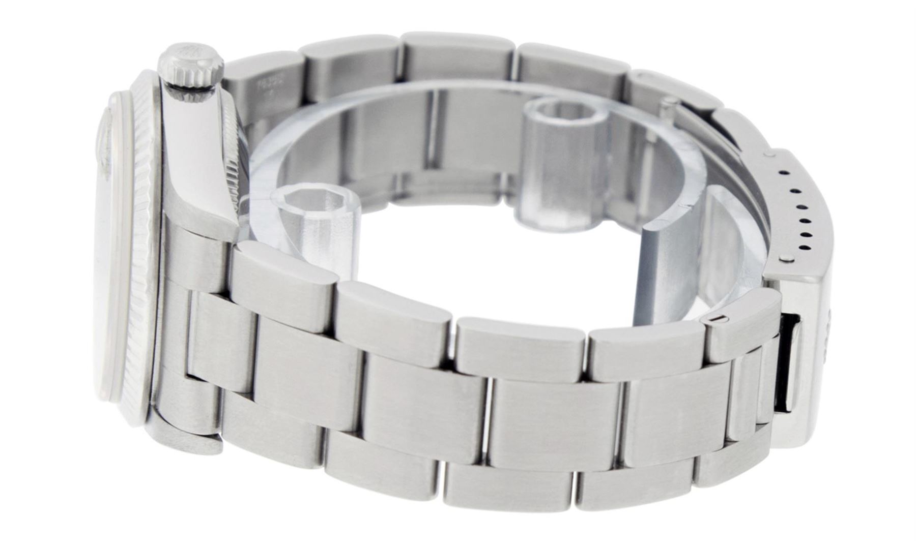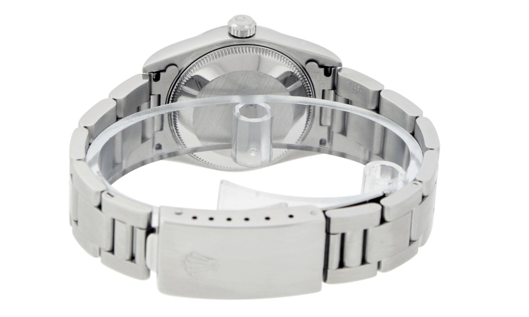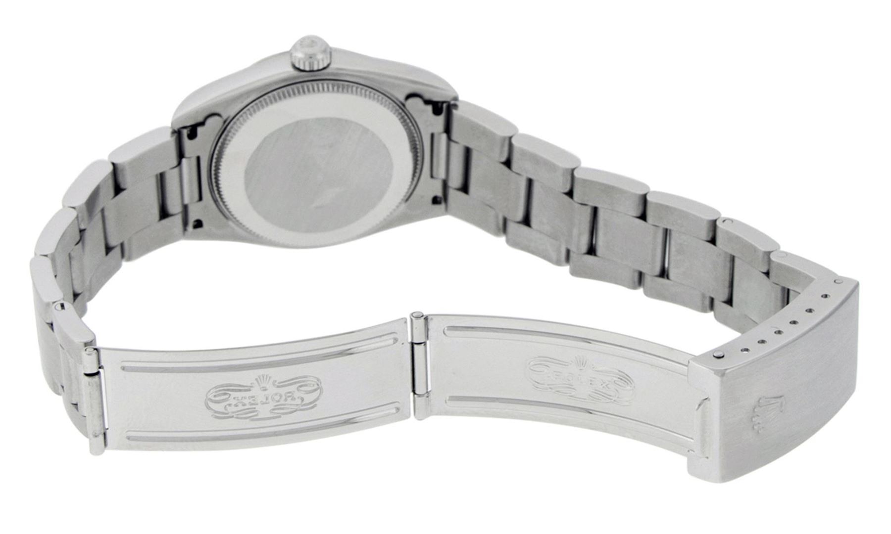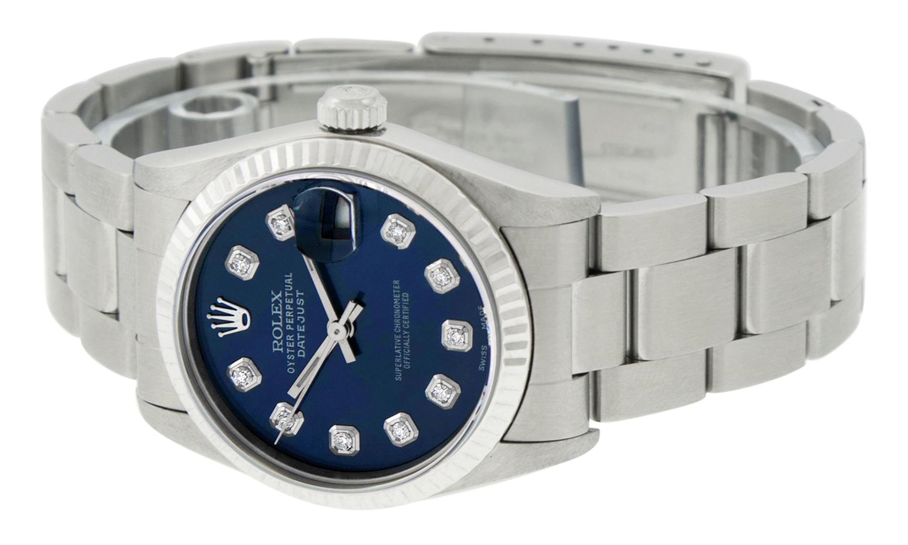 One Womens Pre Owned Midsize Stainless Steel Rolex Datejust Polished, Serviced & Electronically Tested, Rolex Stainless Steel Case Case: 31mm, Rolex Stainless Steel Crown, Rolex Bezel: 18K White Gold Fluted Bezel, Custom Crystal: New Sapphire With Magnified Date Window. Custom Hands: New Luminecent Hands. Rolex Movement: Automatic Winding Movement Caliber 2235. Custom Dial: Refinished To Blue With Custom Added Genuine Diamonds, Diamond Count: 10 Single Cut Diamonds On Dial, Date Window: 3 O'Clock Position Date Display, Quickset, Model: Quickset Midsize Datejust. Condition: G-6 Extra Fine. Rolex Bracelet: Stainless Steel Oyster Band. Bright Polish. 6.0 Inch Length, Adjustable. Standard Clasp, With Rolex Logo. This Watch Has Been Serviced Time Tested And Is In Excellent Condition It Is Free Of All Scratches And Dents.